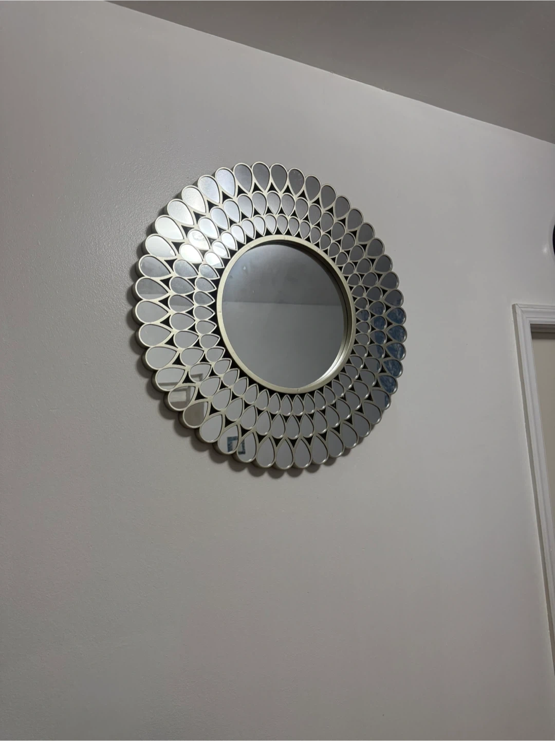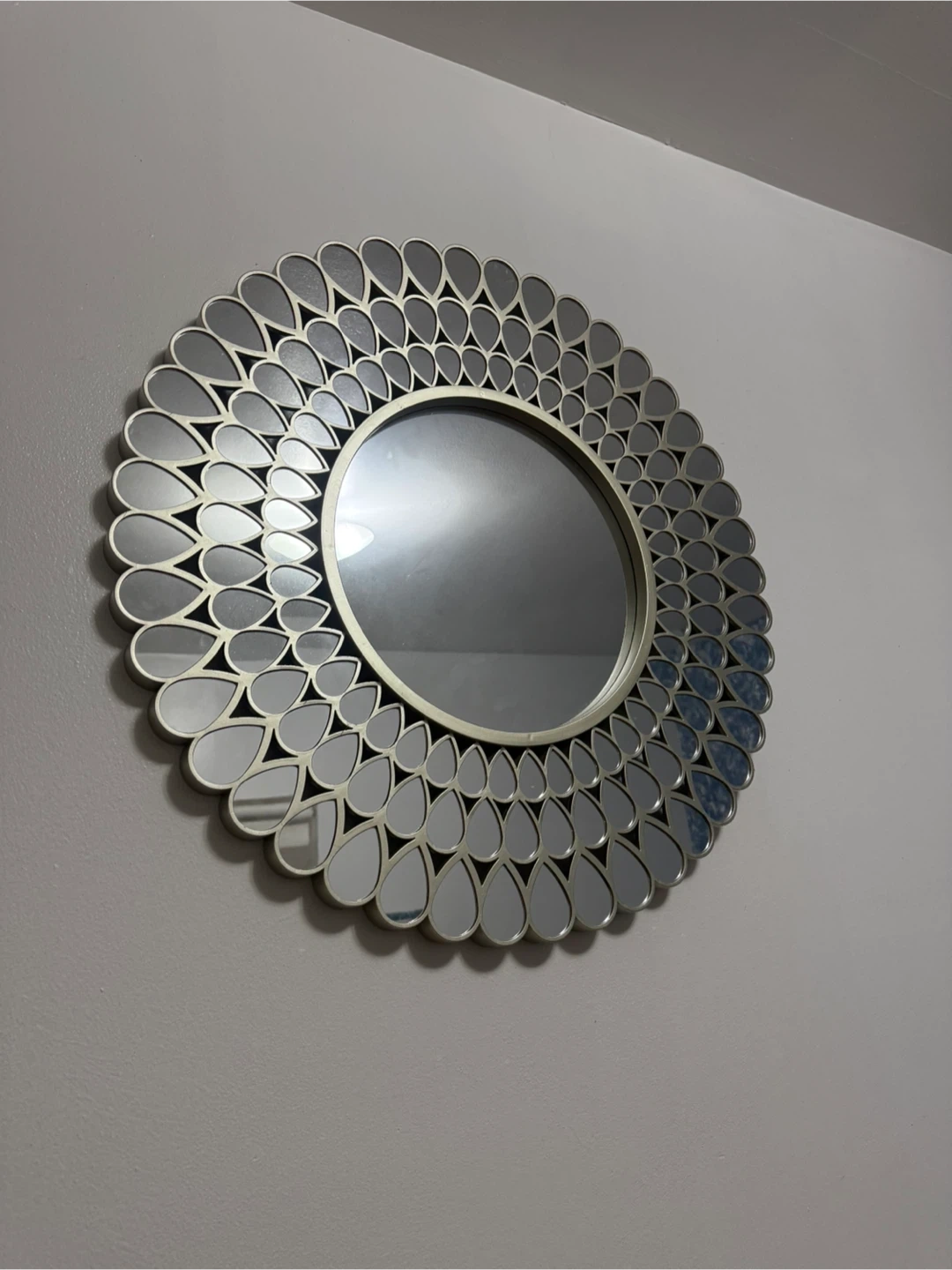 28Selling a lovely round decorative wall mirror. It's in great condition and would be a stylish addition to any room. The design features a unique pattern around the edge, adding a touch of elegance to your space