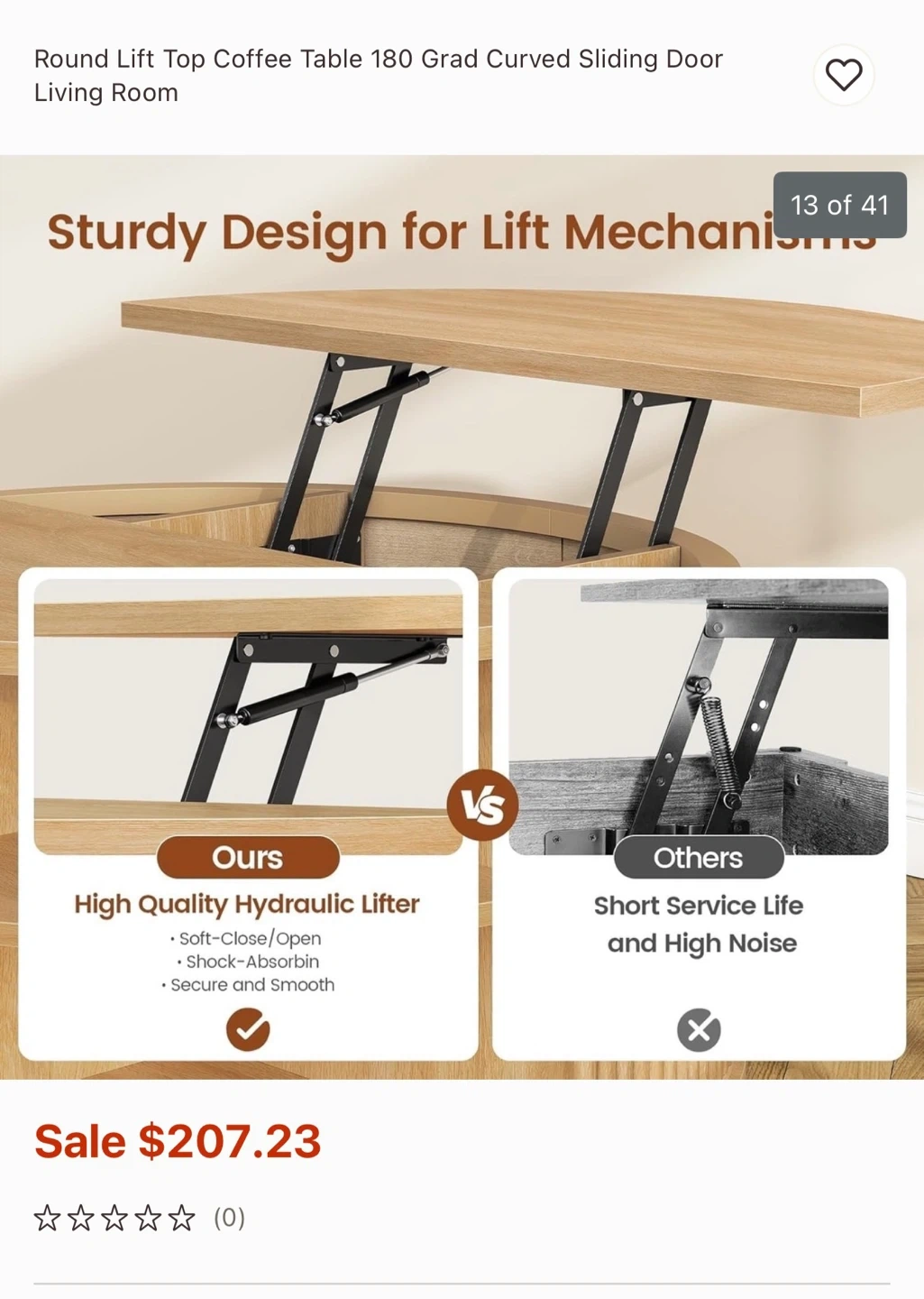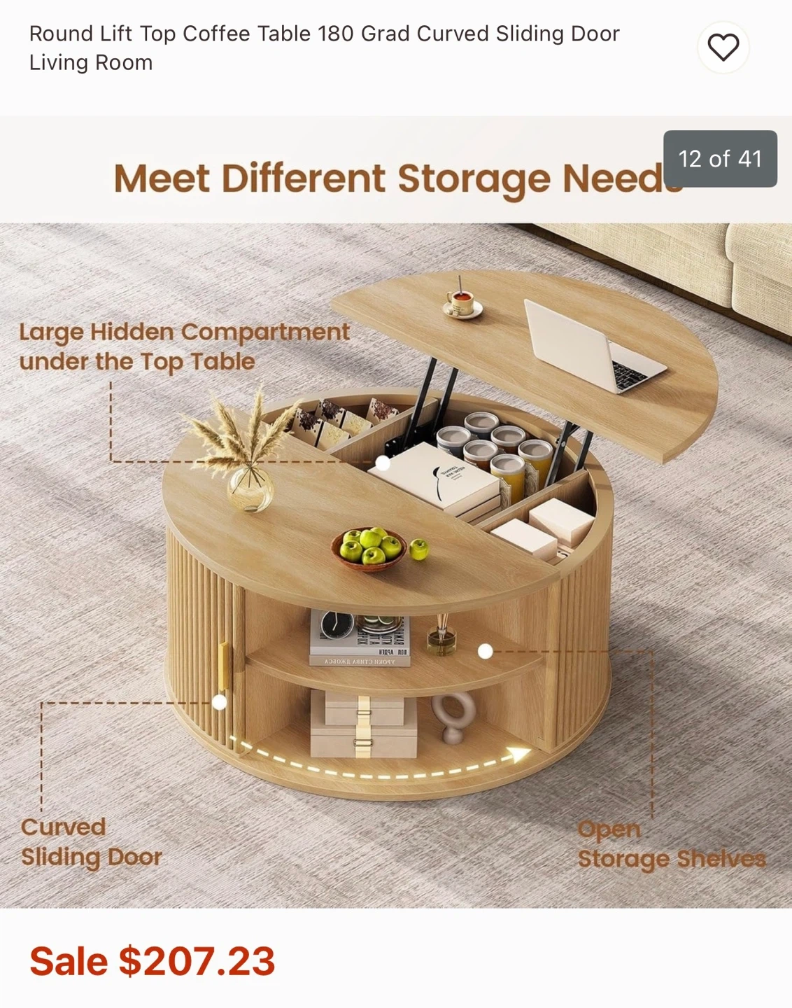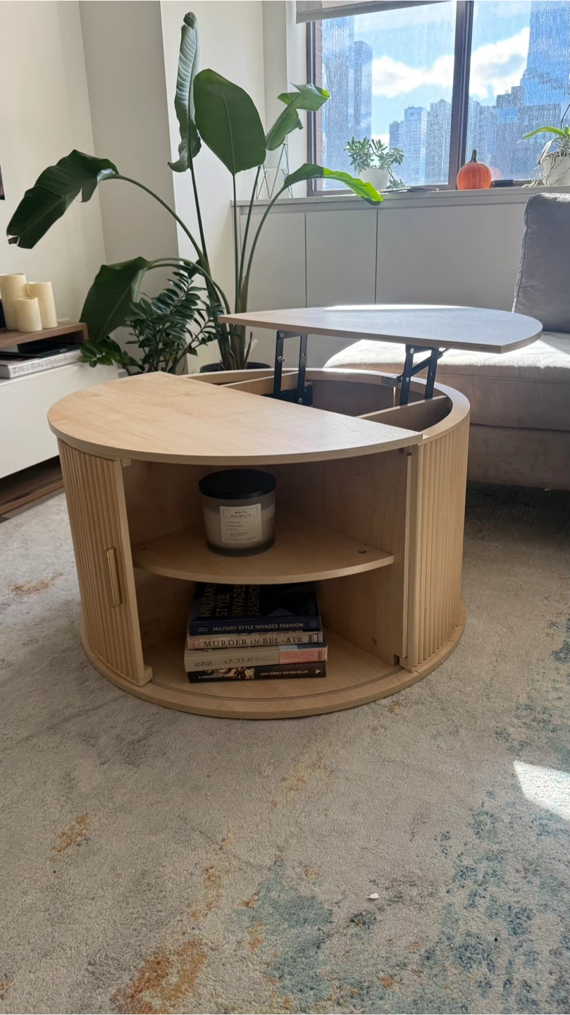 60Round Lift Top Coffee Table, 34.6" Modern Coffee Table with 180° Curved Sliding Door, Fluted Accent Coffee Tables with Hidden Storage and Open Shelves, for Living Room, Office Lifting Design: this round coffee table comes with a lifting top design, featuring a high quality lifting mechanism with slow rebound hydraulic support rods for smooth and safe lifting and lowering. When you are working and dining, the table top can be easily lifted from 18.9 inches (about 48 cm) to 24.4 inches (about 62 cm) in height, you can use the table to work on your computer without bending down, enjoy a meal or sit comfortably on the sofa to play games. When you're not working, simply fold up the tabletop to use it as a regular coffee table. Multi-scenario use, catering to your needs and enhancing the experience Ample Storage Space: Under the lift-up table top are 3 hidden storage spaces, which can be used to put remote controls, headphones and other daily necessities without getting dirty, and there are two parts of storage space underneath, the design of sliding door makes 1/4 of them are hidden storage space and 1/4 are open shelves, which can be used to put storage boxes, decorations, books, magazines and so on Sliding Rolling Door: This coffee table has a simple appearance, smooth lines, with a curved groove sliding door, which can be pushed and pulled 180°, making this round coffee table convenient for you to access all the essentials, and bringing more convenience to your use Sturdy and Durable: this coffee table is made of high quality MDF, which is sturdy and durable. Thick wooden legs provide stable support, stable structure and strong load-bearing capacity Easy to Assemble: this coffee table comes with detailed assembly instructions, convenient for you to assemble easily. If you encounter any problems during the installation process, please feel free to contact us. High Quality Hydraulic Lifter Lifting stand, smooth and quiet, easy to use Mid Century Modern Panel Elegant and Sophisticated Stable Leg Design Sturdy and durable with high load-bearing capacity