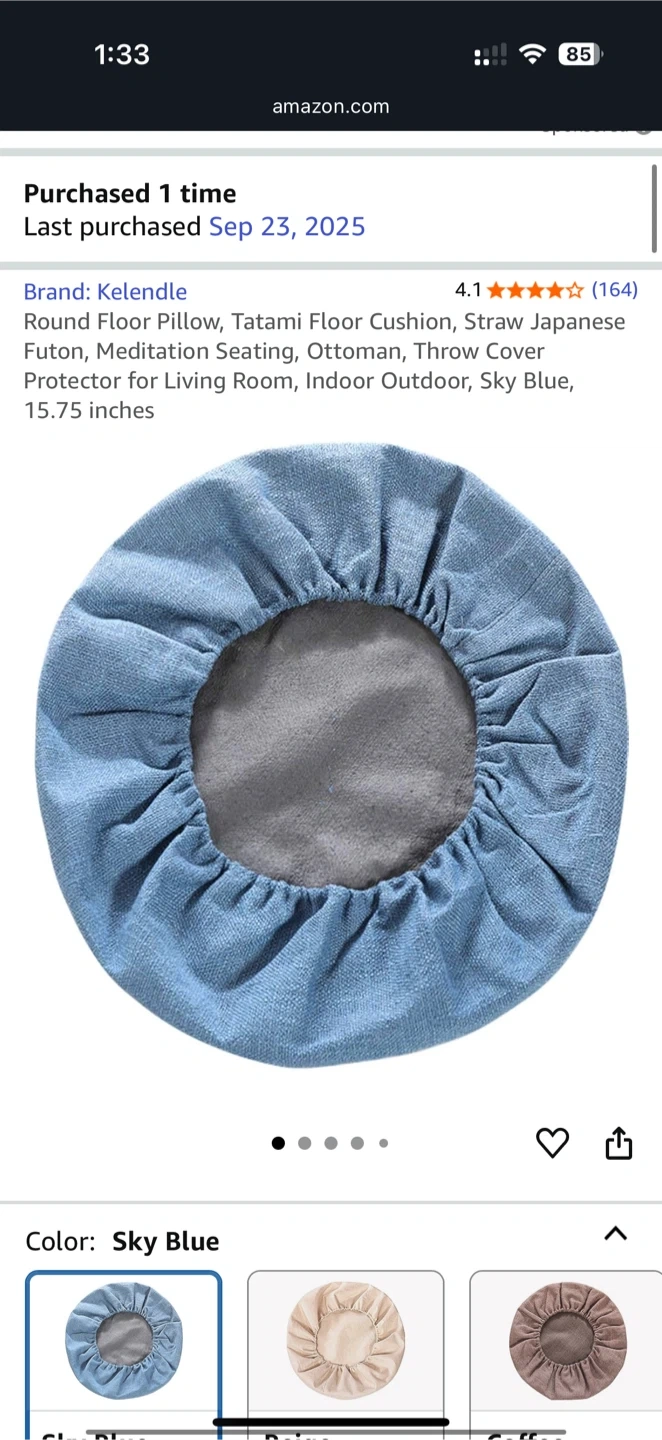 Colors available: Skyblue, gray, light purple, dark purple I am selling round meditation foam cushion with new cover that i bought from Amazon. Cover+foam for $20 each, and $10 for just the foam. https://www.amazon.com/Kelendle-Cushion-Japanese-Meditation-Protector/dp/B08FMLNT36 Cover is currently sold for $11.5+tax1=12.5 and it is new ordered today. https://www.amazon.com/GoTo-Foam-Diameter-Upholstery-Cushion/dp/B07X8G56WG Foam was bought last year and same size foam is sold for $24.84+tax2.16=$27 on Amazon. Total should be $40, but I am selling this on half price just for the sake of moving out.