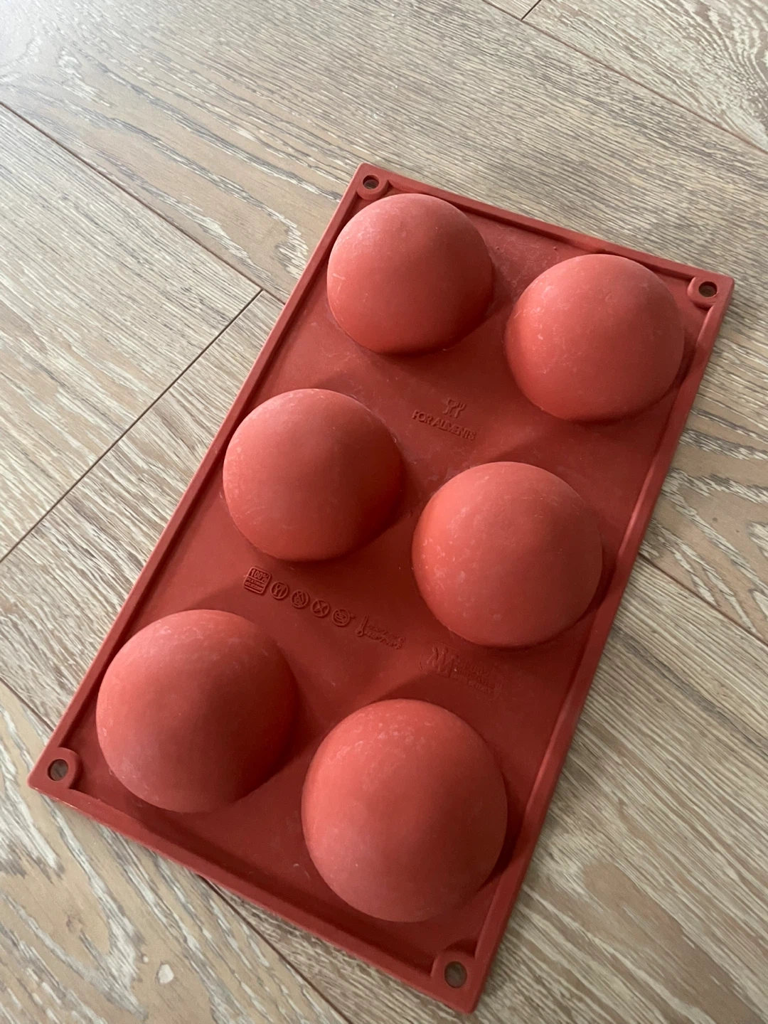 This is a red silicone mold with six spherical cavities. It's made of durable silicone material. Great for baking desserts or making chocolates!