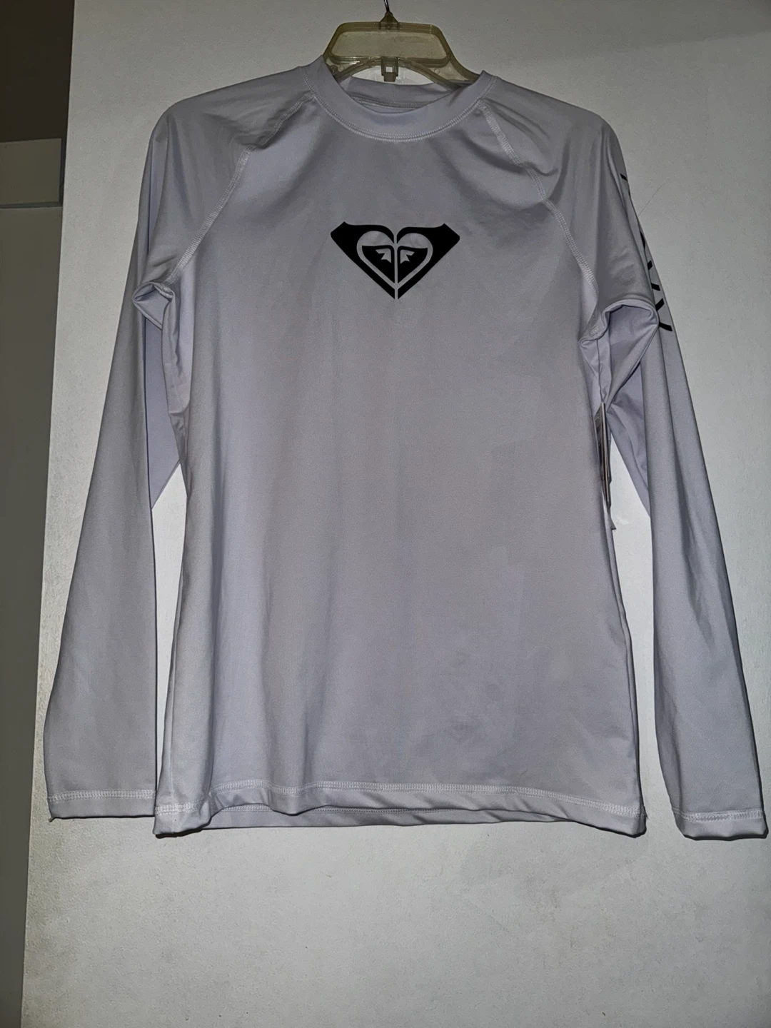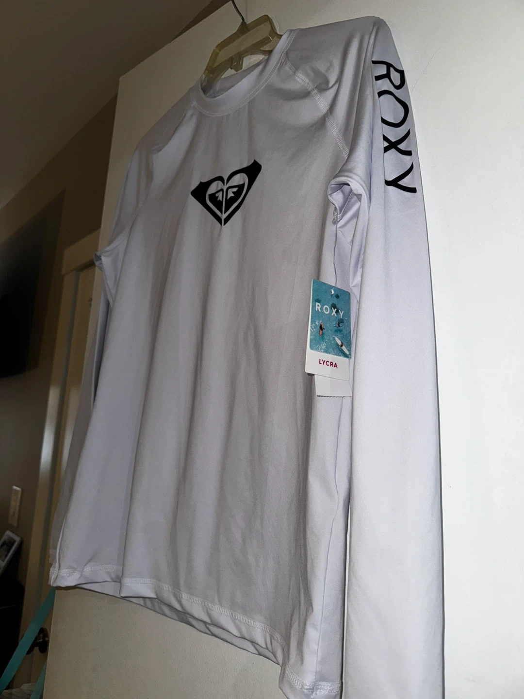 Roxy long sleeve rash guard in white. It's made of lycra and features the Roxy logo on the front and sleeve. Perfect for swimming or surfing!
