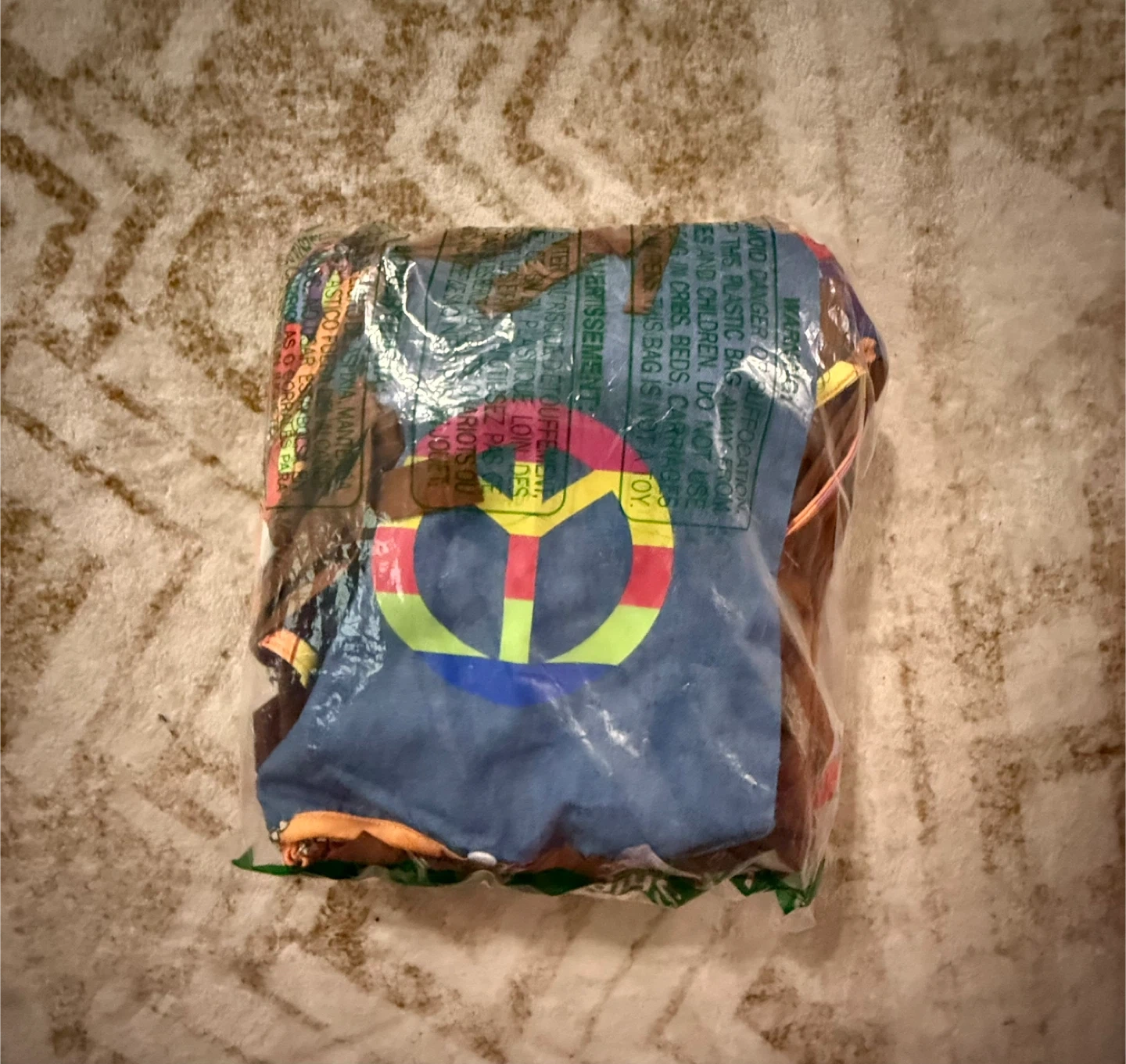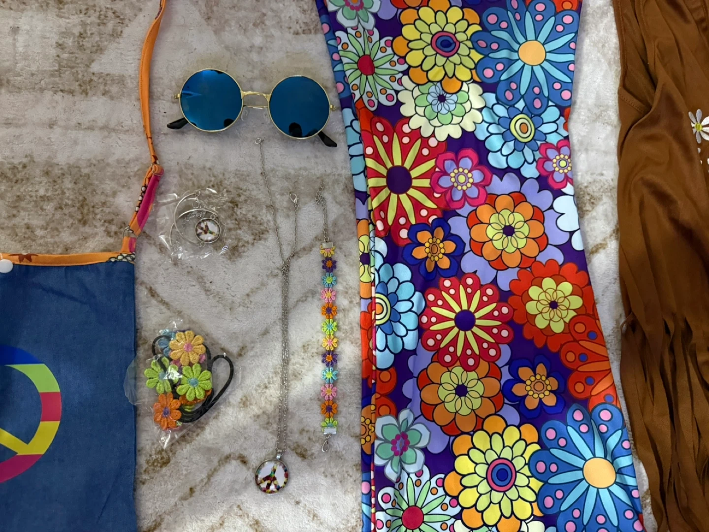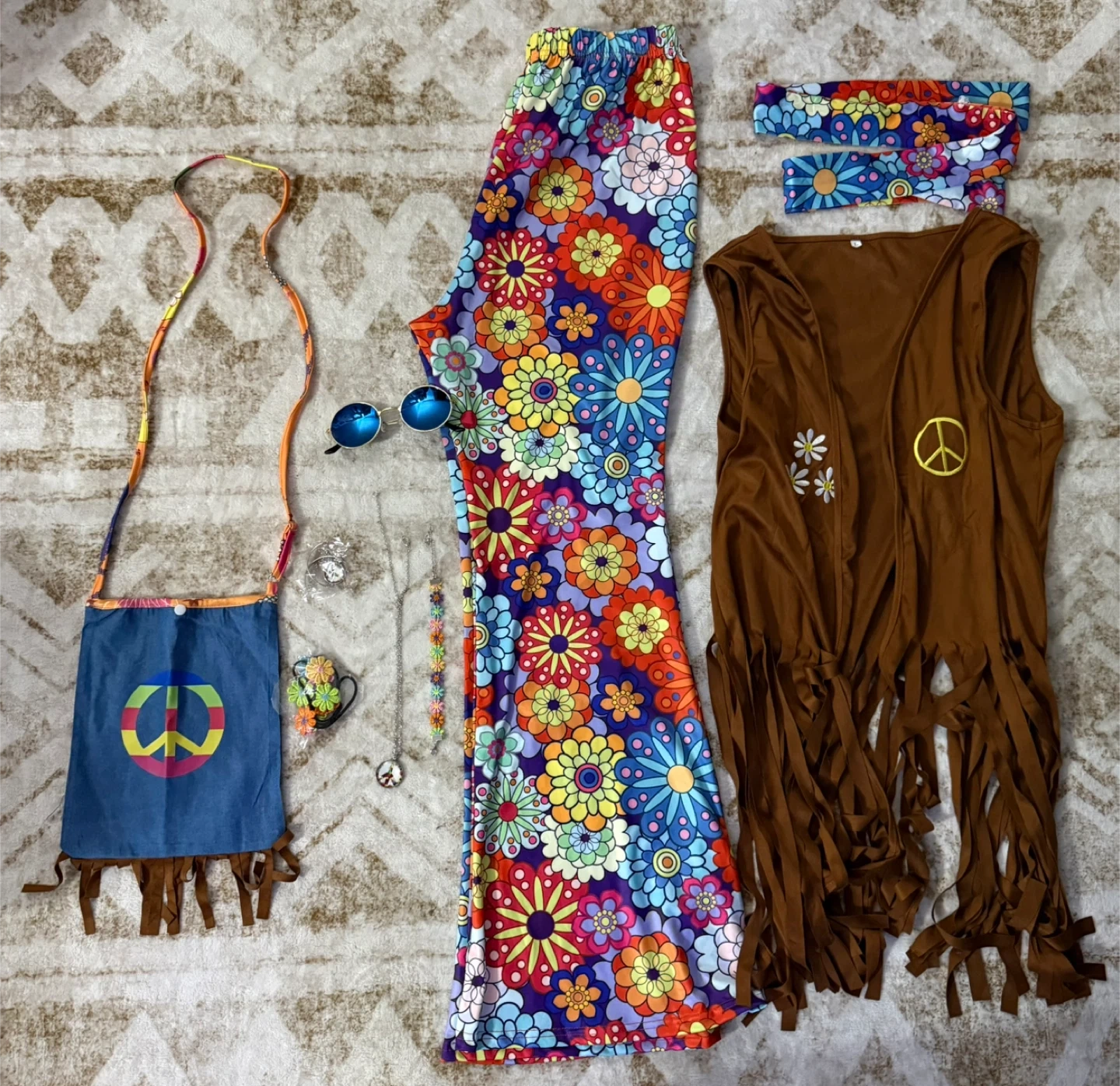 Groovy costume set featuring bell-bottom pants, a fringed vest, and a crossbody bag with a peace sign. It also includes sunglasses, necklaces, a bracelet, and a headband. Perfect for themed parties!Size large