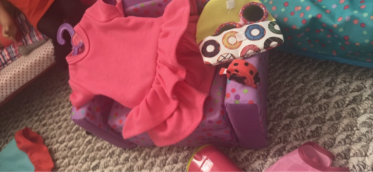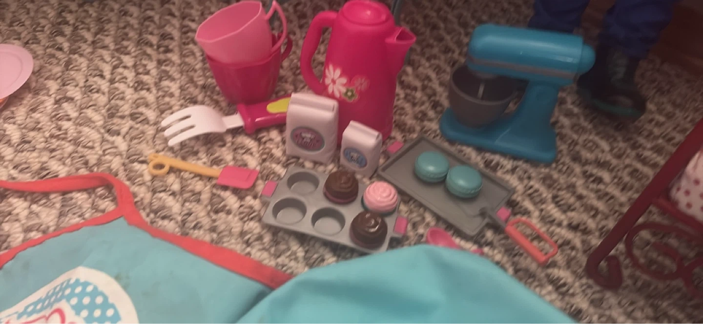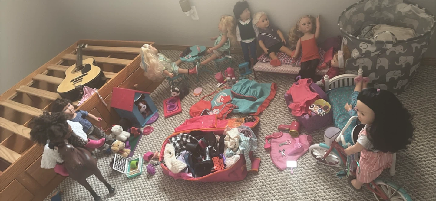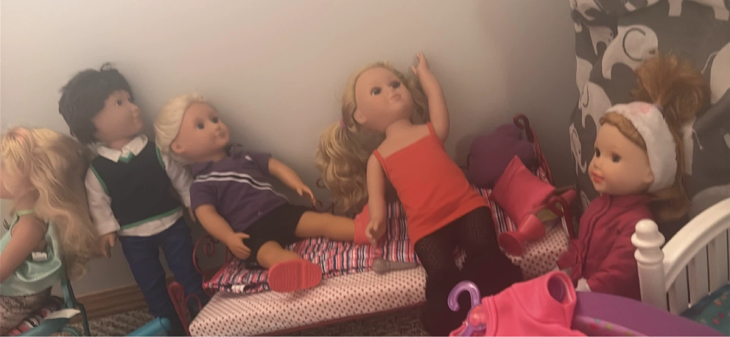 Bundle includes various doll clothes, hair accessories, a hairdryer set with comb and scissors, a mirror, and other play items. Several dolls and a bicycle are also part of this collection. A large tote bag is included for storage. Give me your best offer
