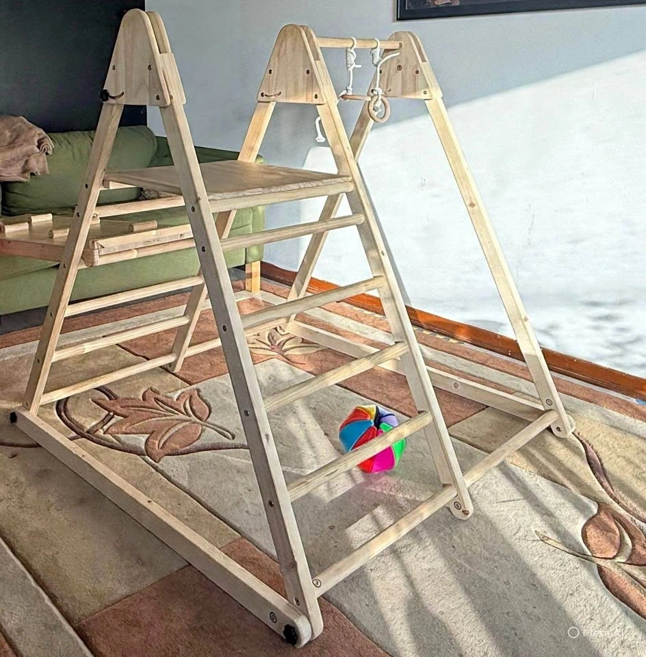 Versatile wooden climbing frame play set. Has multiple configurations for climbing and play. Comes with a slide/ramp, pull up rings and a baby swing. All wood material. Super clean and sturdy for indoor fun.