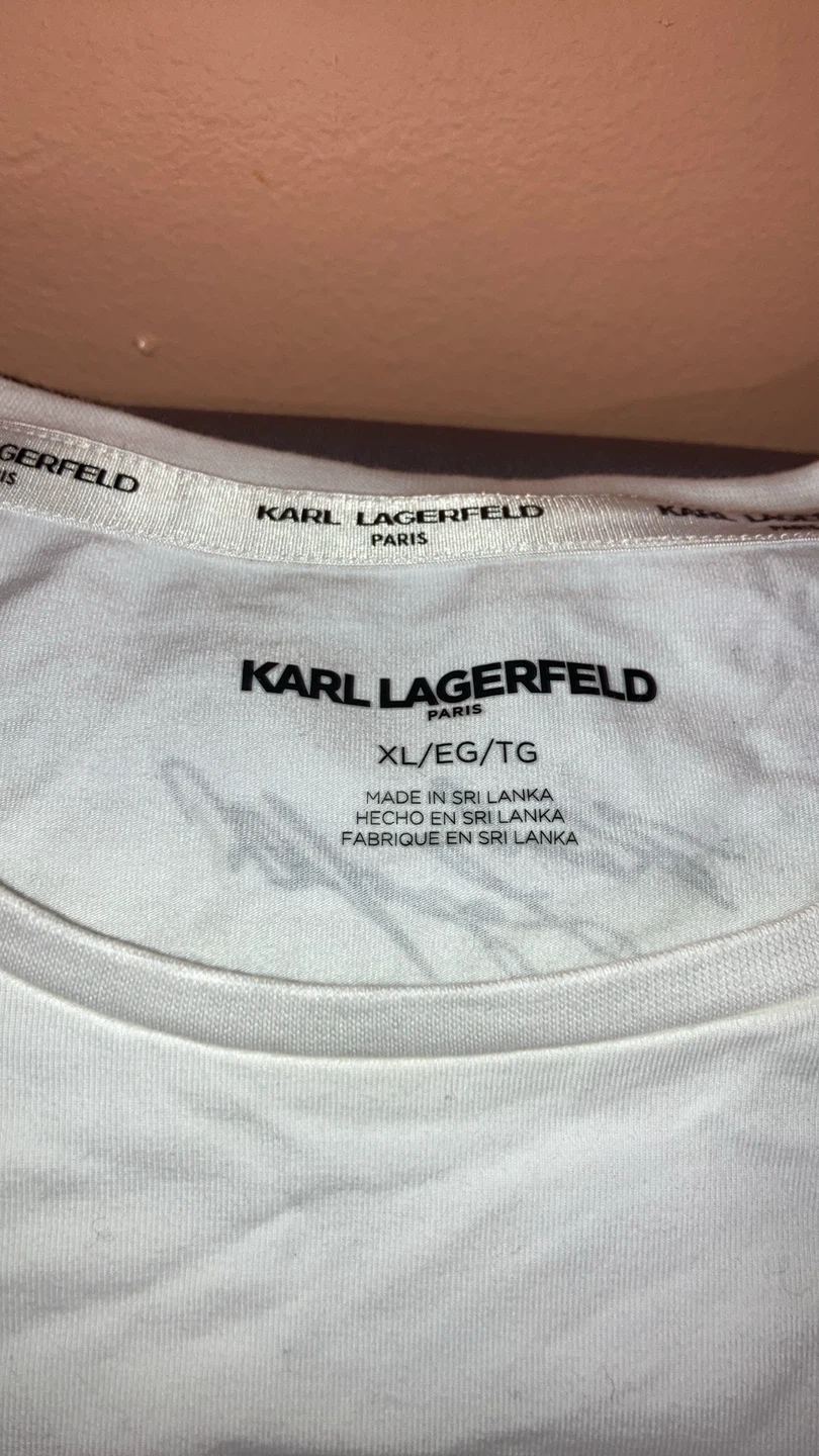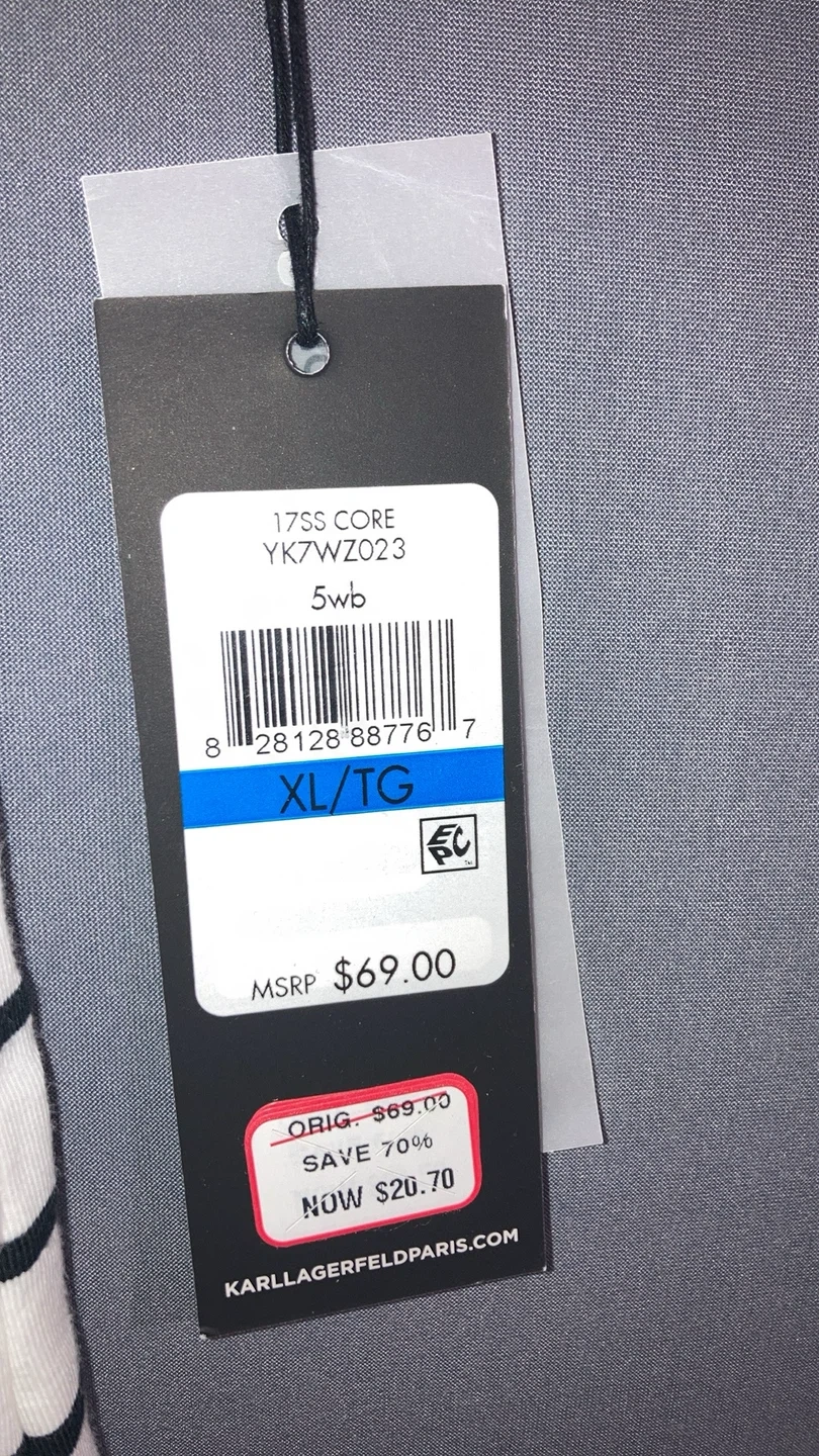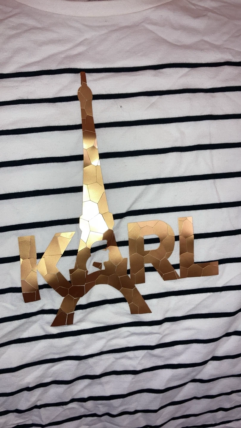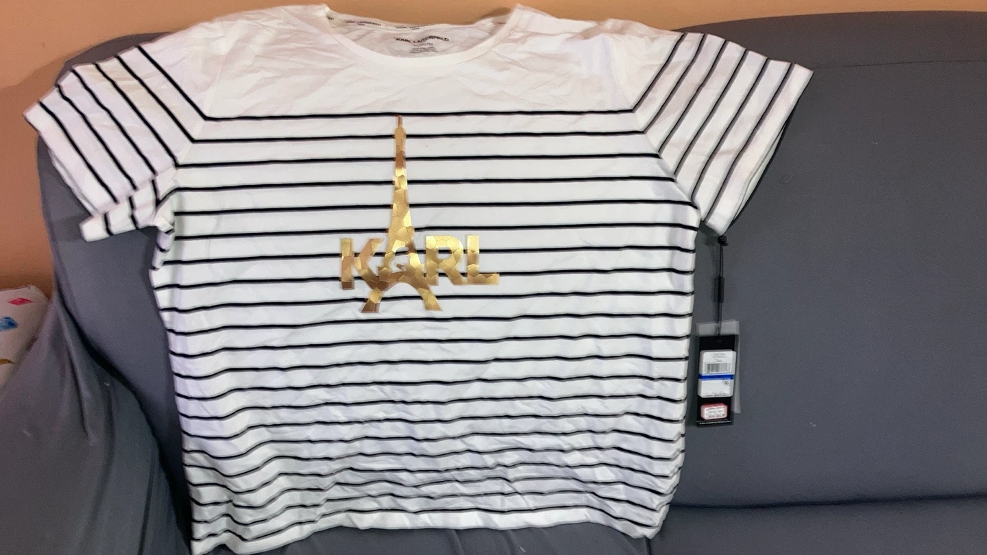 Here's a brand new Karl Lagerfeld Paris tee! It's white with black stripes and a cute Eiffel Tower design. The size is XL. Originally priced at $69.00. Pickup near Islington and Steeles