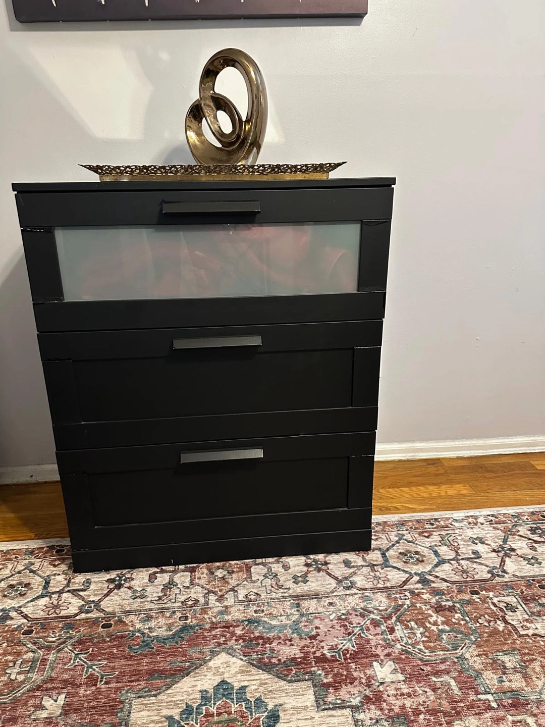 Selling a black 3-drawer dresser. It's in good condition and would be perfect for extra storage in a bedroom or living area