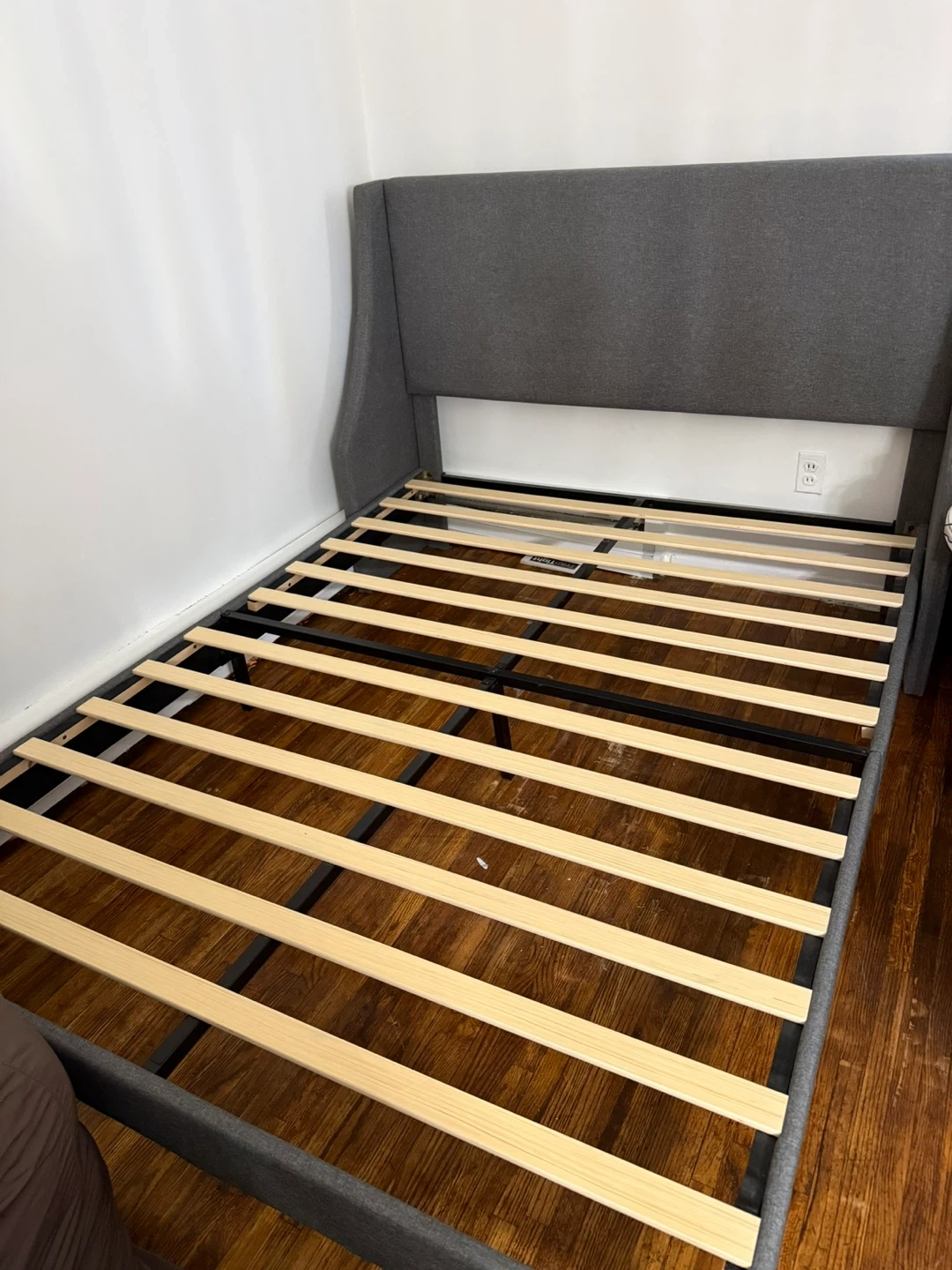 Queen Gray upholstered wingback bed frame. Metal frame with wooden slats. Headboard has a curved wingback design. Slats provide mattress support.
