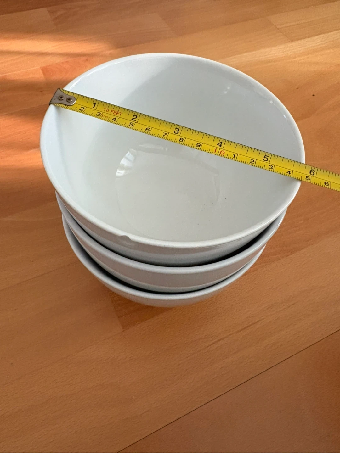 3 white ceramic bowls. They measure approximately 6 inches in diameter. These bowls are perfect for cereal, soup, or snacks.