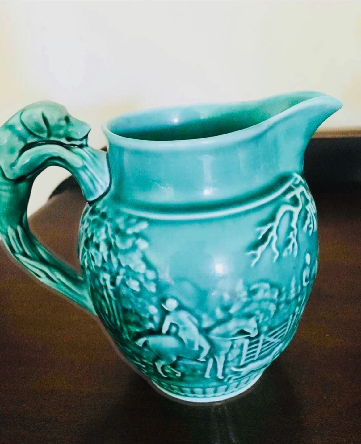 It features a unique handle with a dog design and pastoral scenes around the body of the jug. Perfect for adding a touch of vintage charm to your home