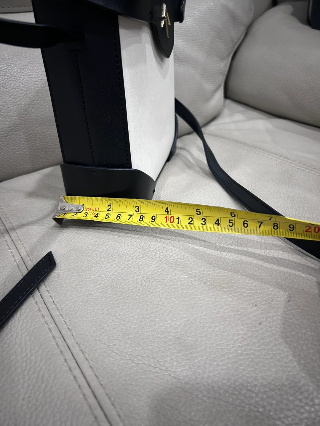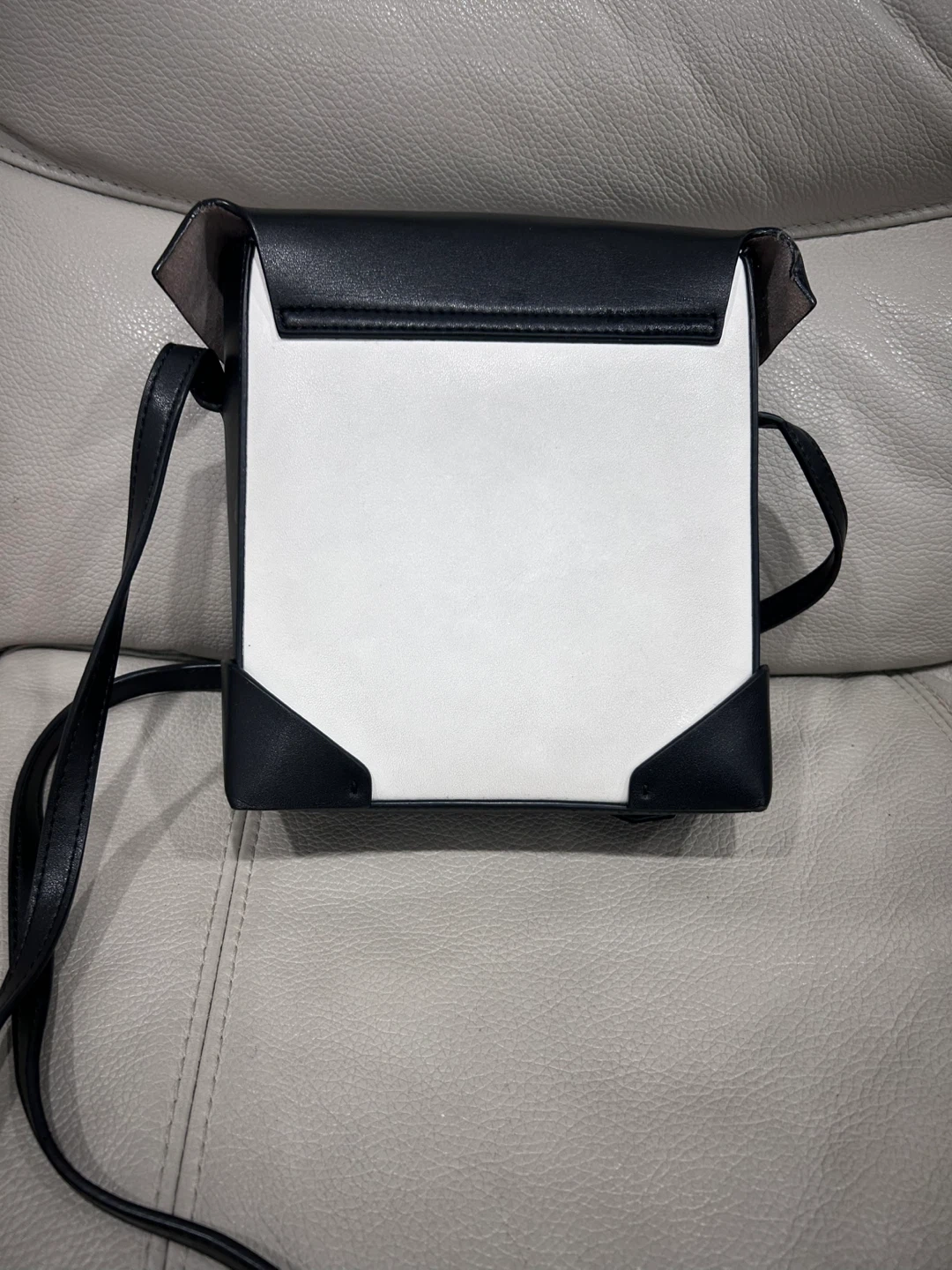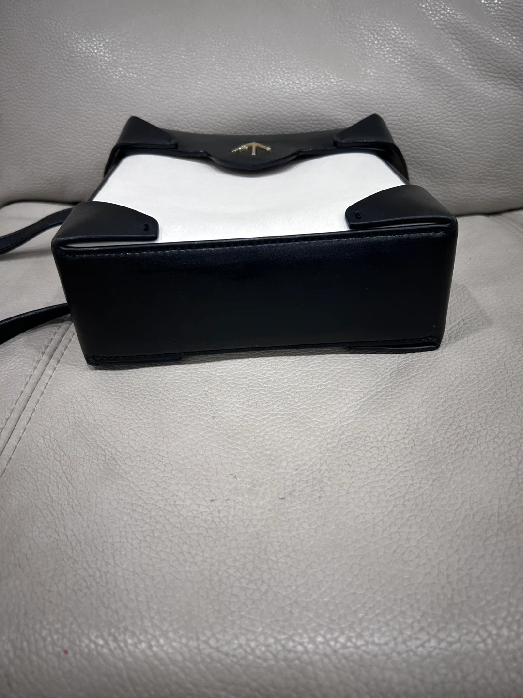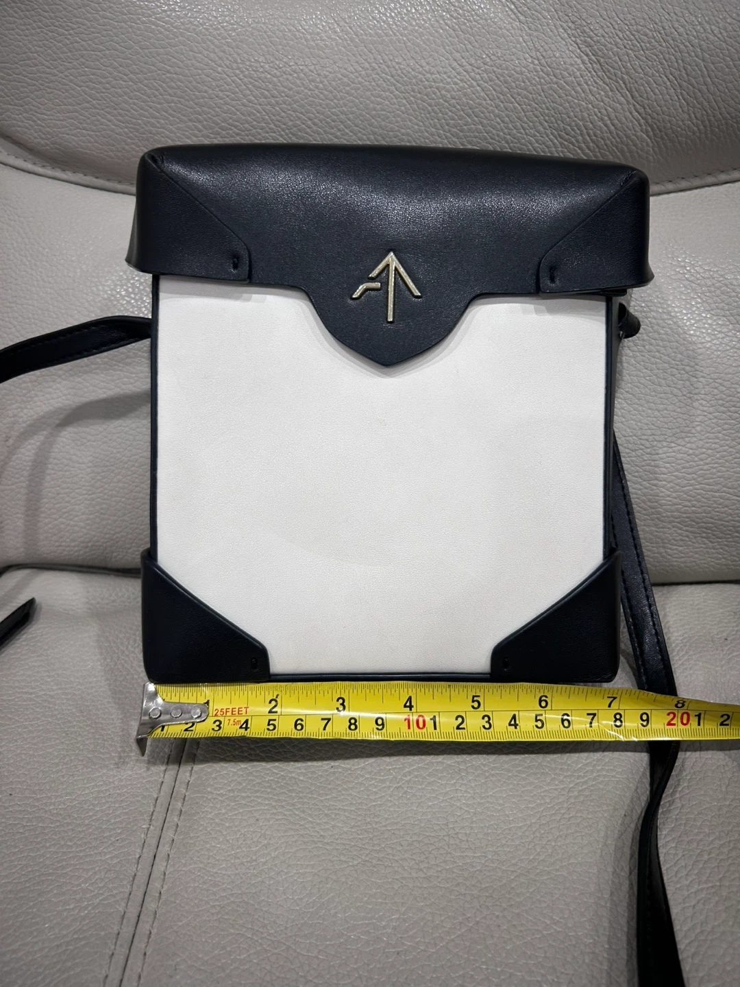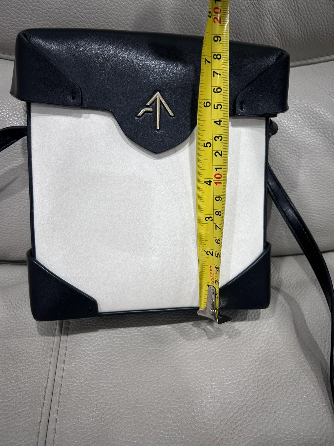 Looking to sell this stylish Manu Atelier cylinder shoulder bag! It's in great condition and features a sleek black and white design. The bag measures approximately 19cm in height and 10cm in width, making it a compact yet functional accessory!