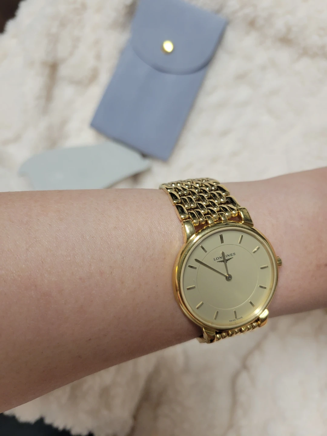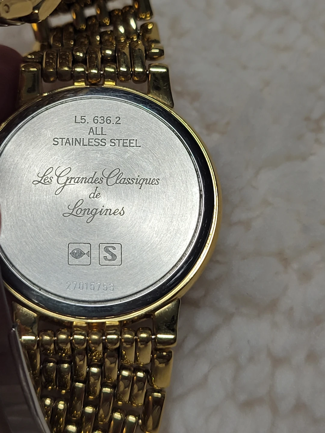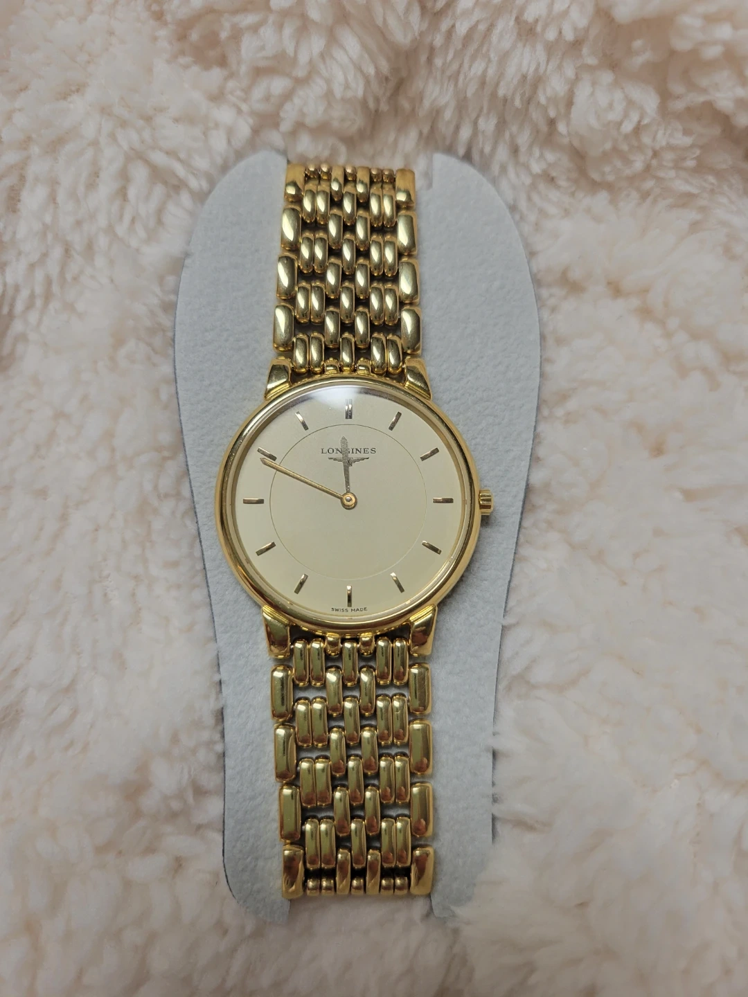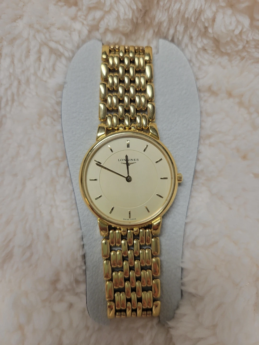 This is a classic Longines watch with a gold-tone finish. It features a simple, elegant dial and a durable stainless steel band. The clasp is secure and designed for comfortable wear. It's a timeless accessory for any occasion!