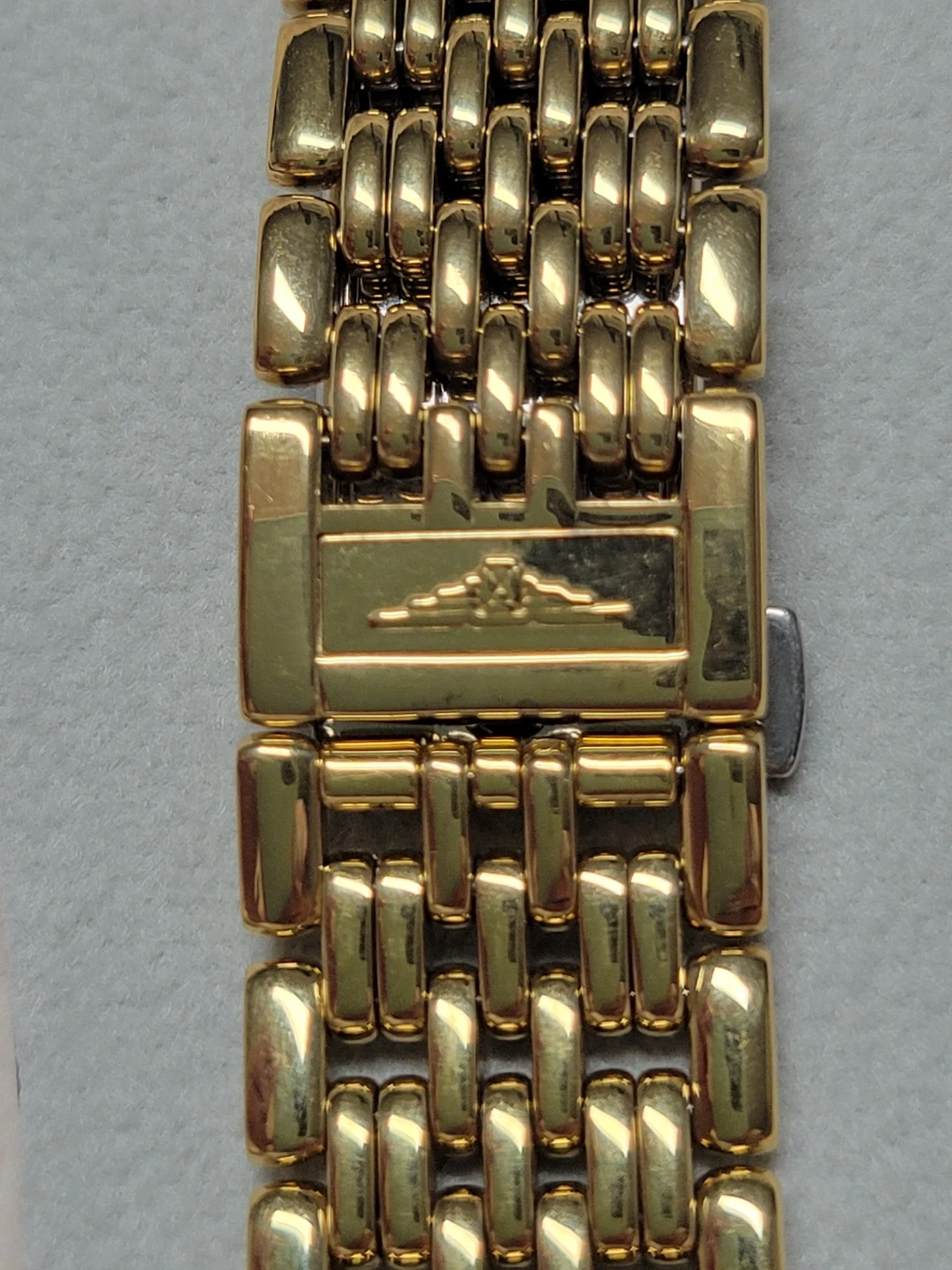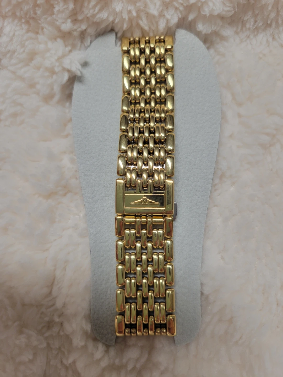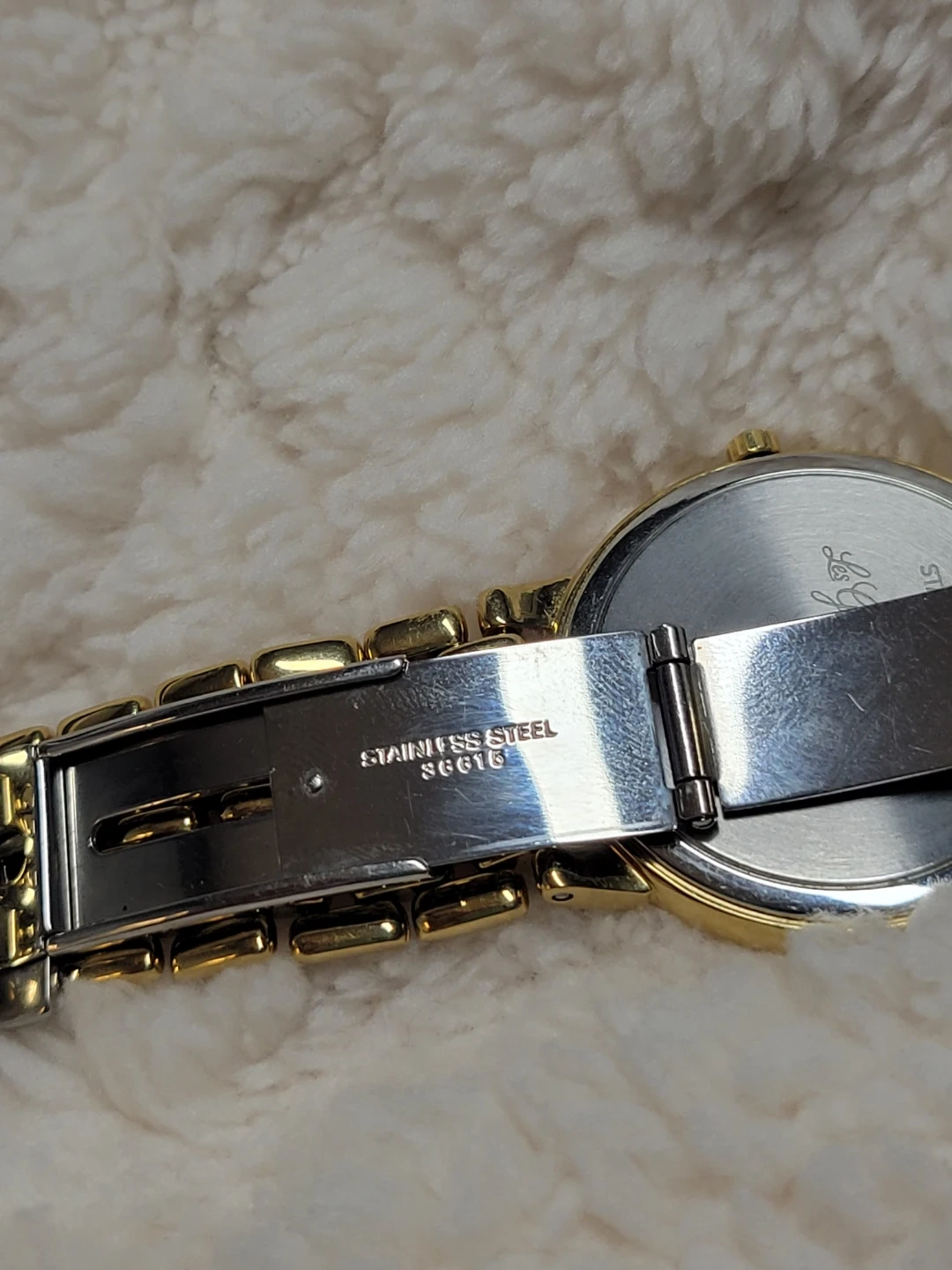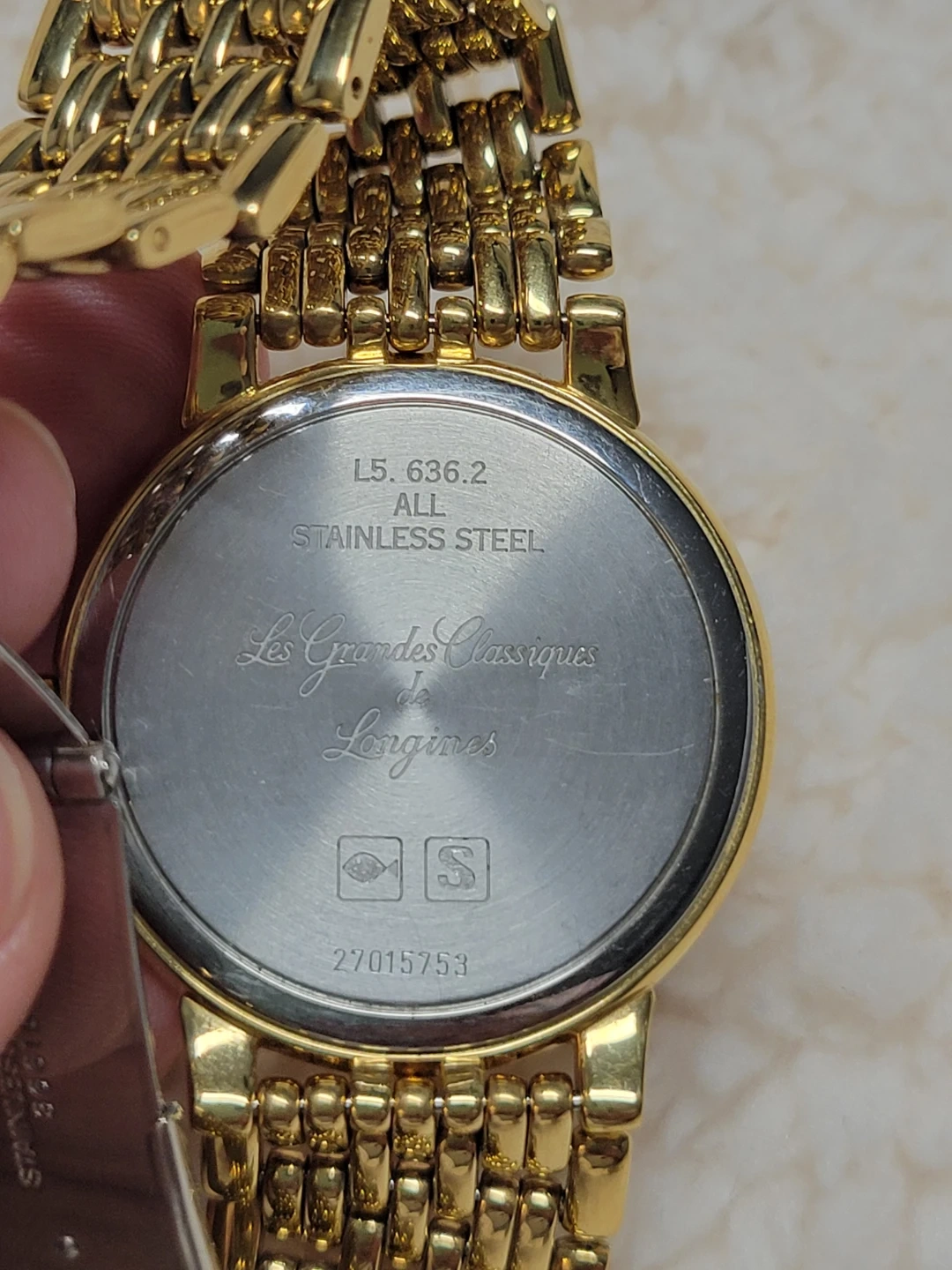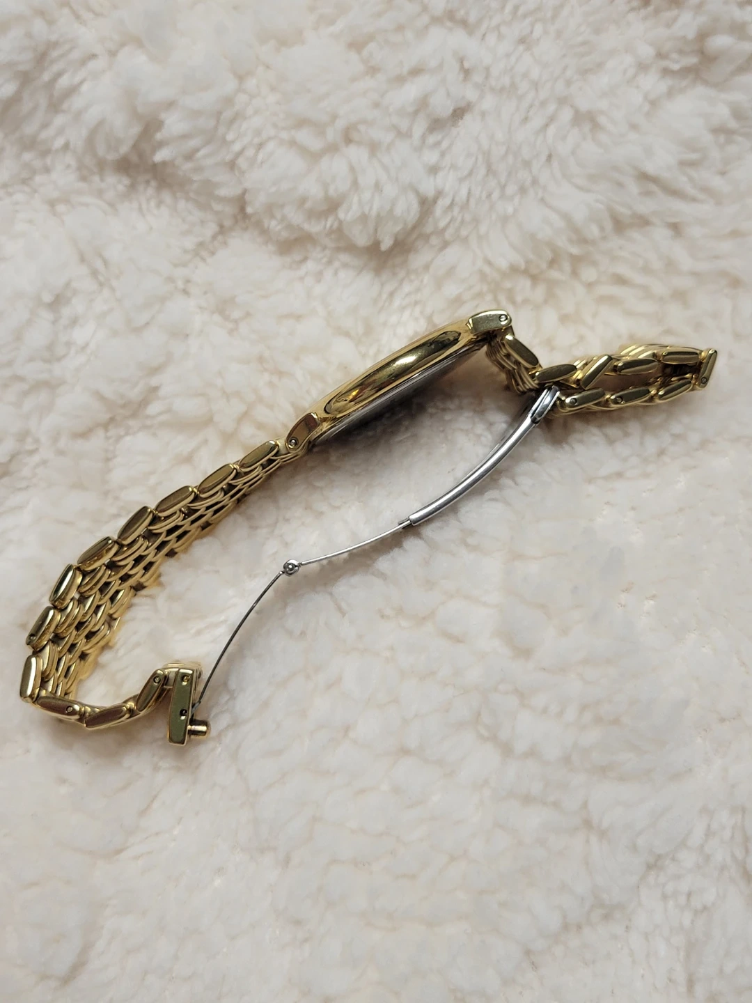 This is a classic Longines watch with a gold-tone finish. It features a simple, elegant dial and a durable stainless steel band. The clasp is secure and designed for comfortable wear. It's a timeless accessory for any occasion!