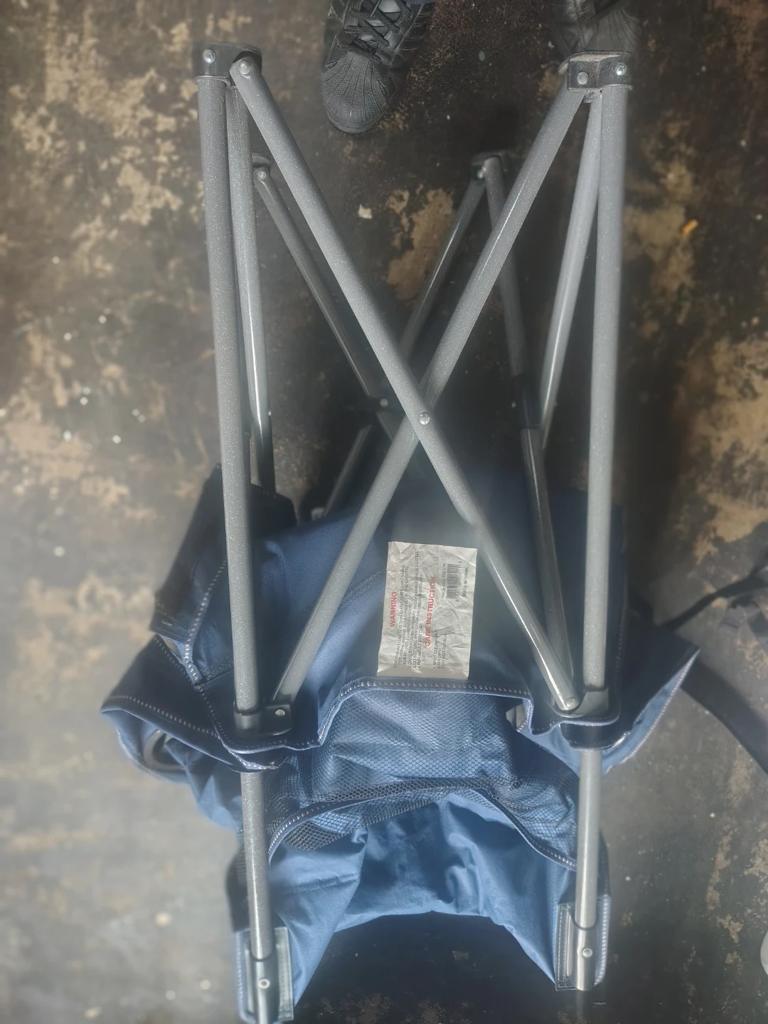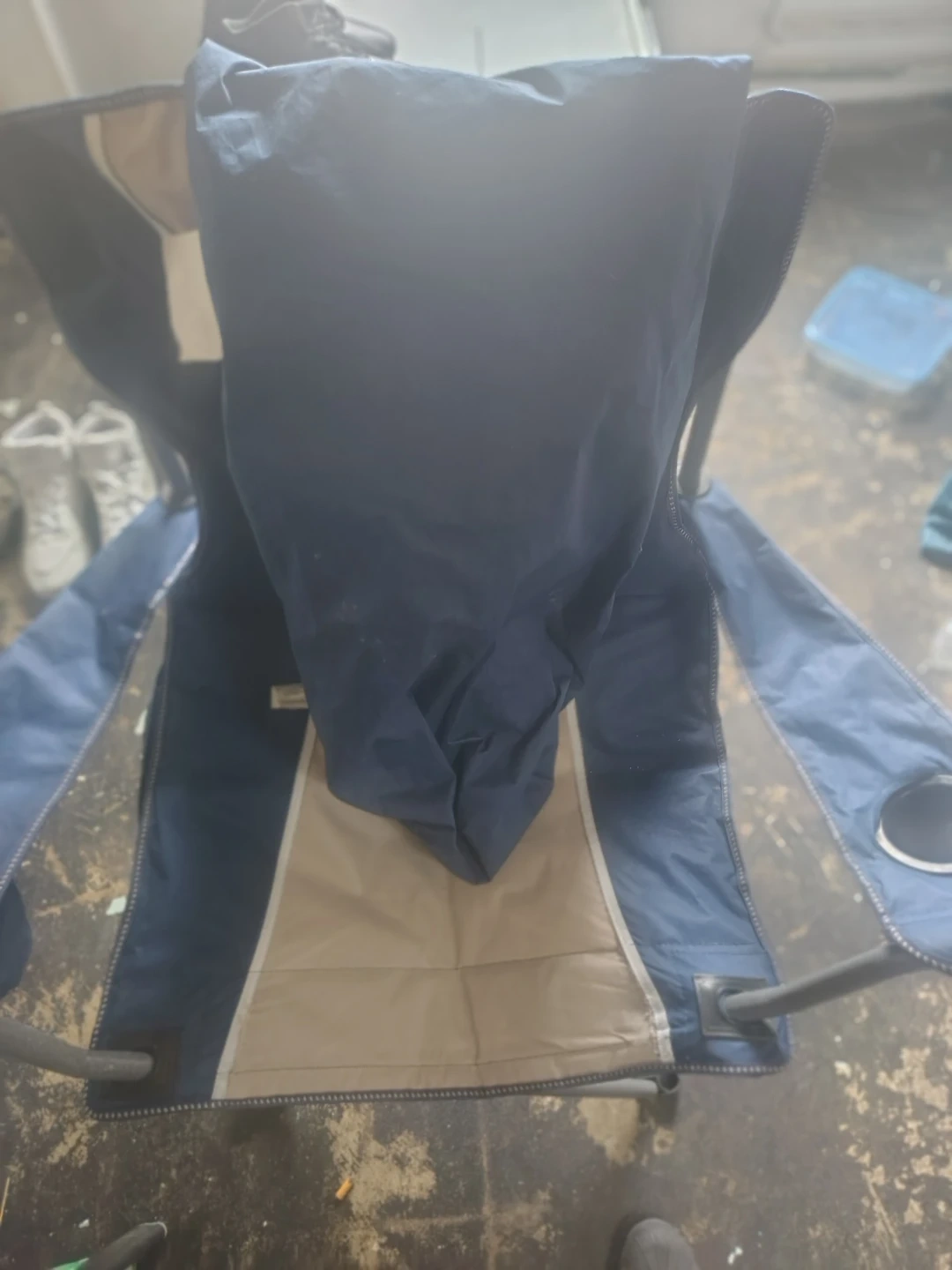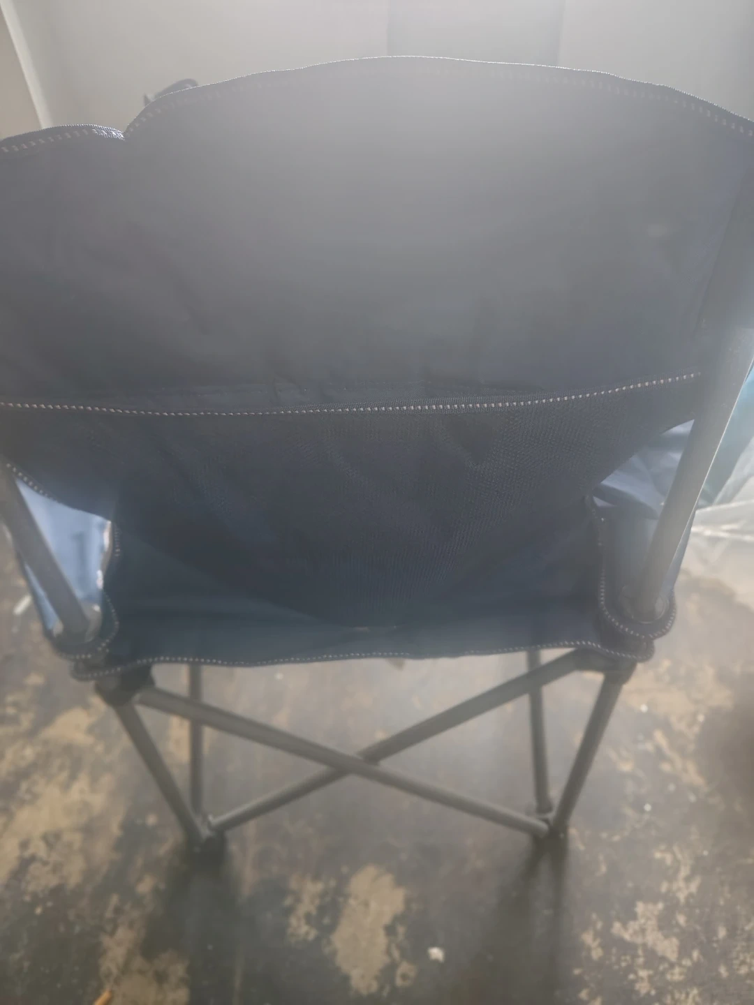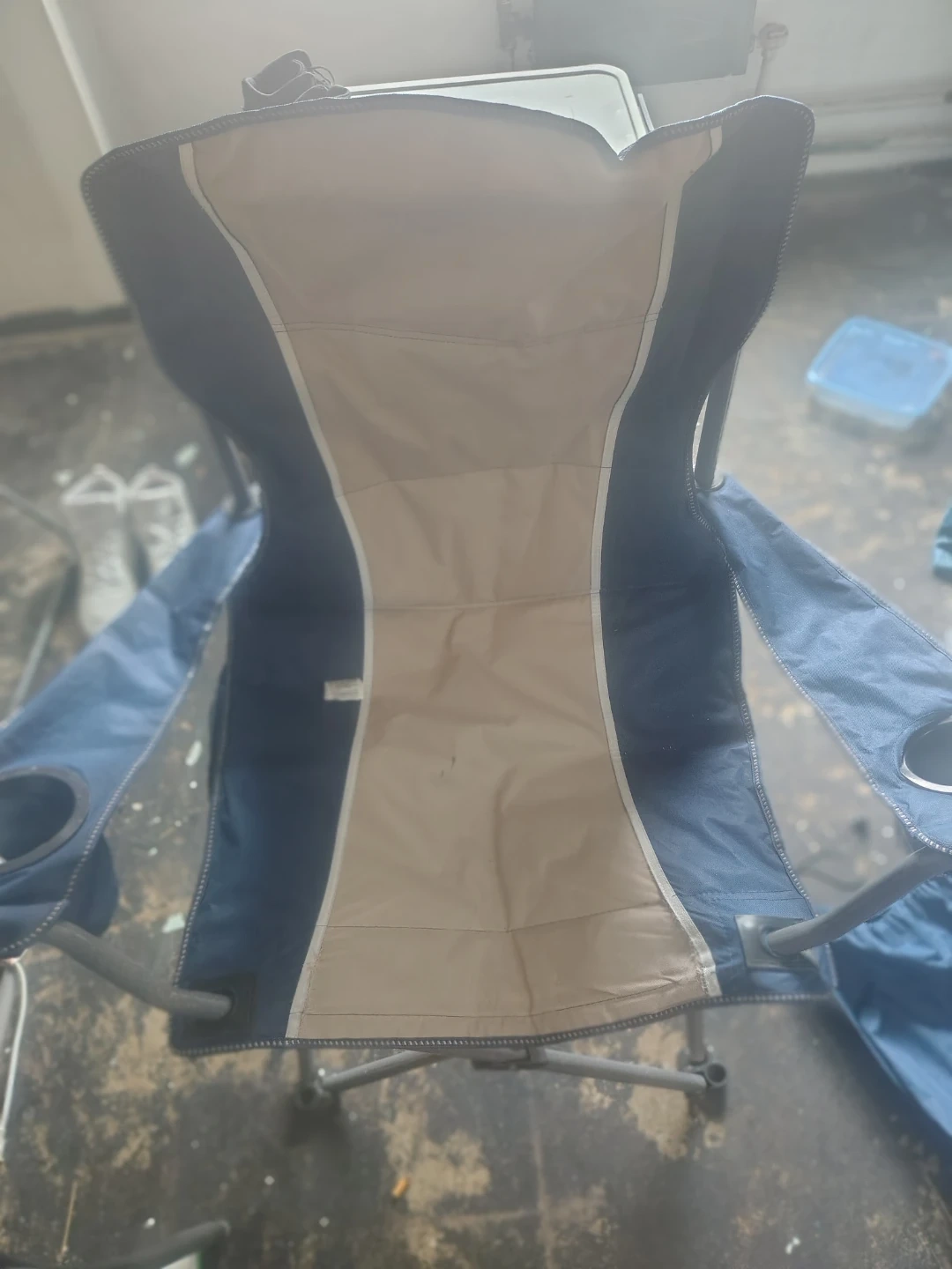 This is a blue folding camp chair, perfect for outdoor activities. It's made with durable fabric and features a convenient cup holder on one armrest. This chair folds up for easy storage and transport.