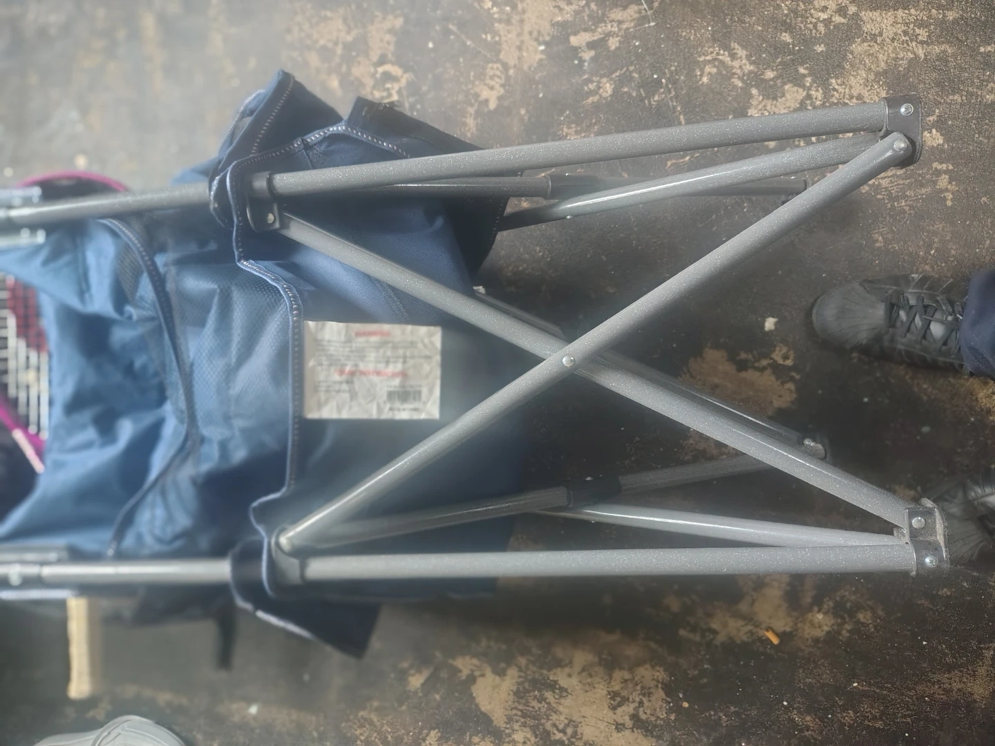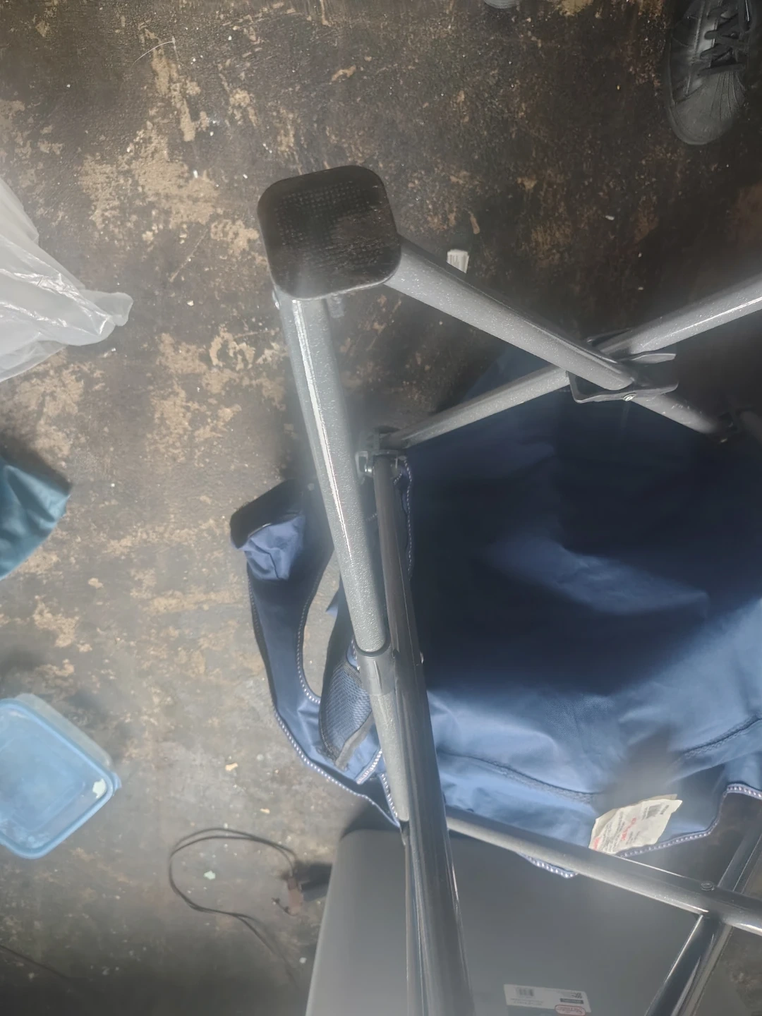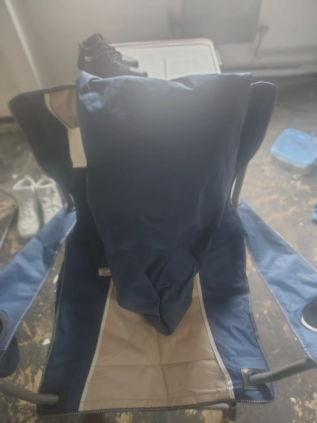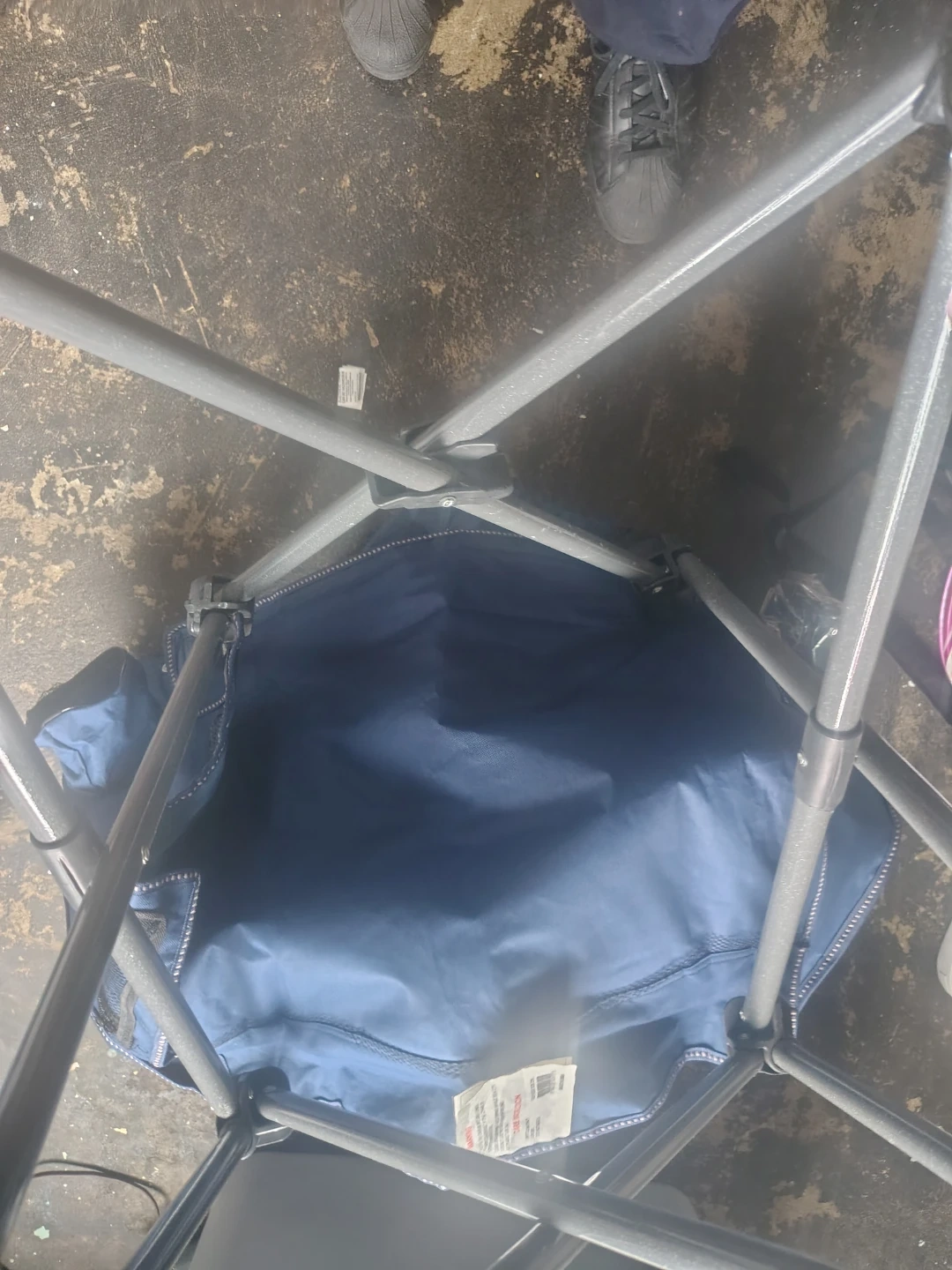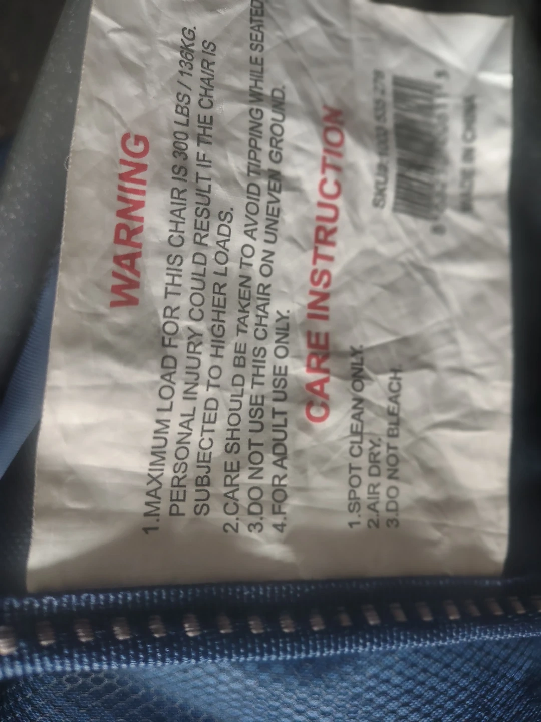 This is a blue folding camp chair, perfect for outdoor activities. It's made with durable fabric and features a convenient cup holder on one armrest. This chair folds up for easy storage and transport.