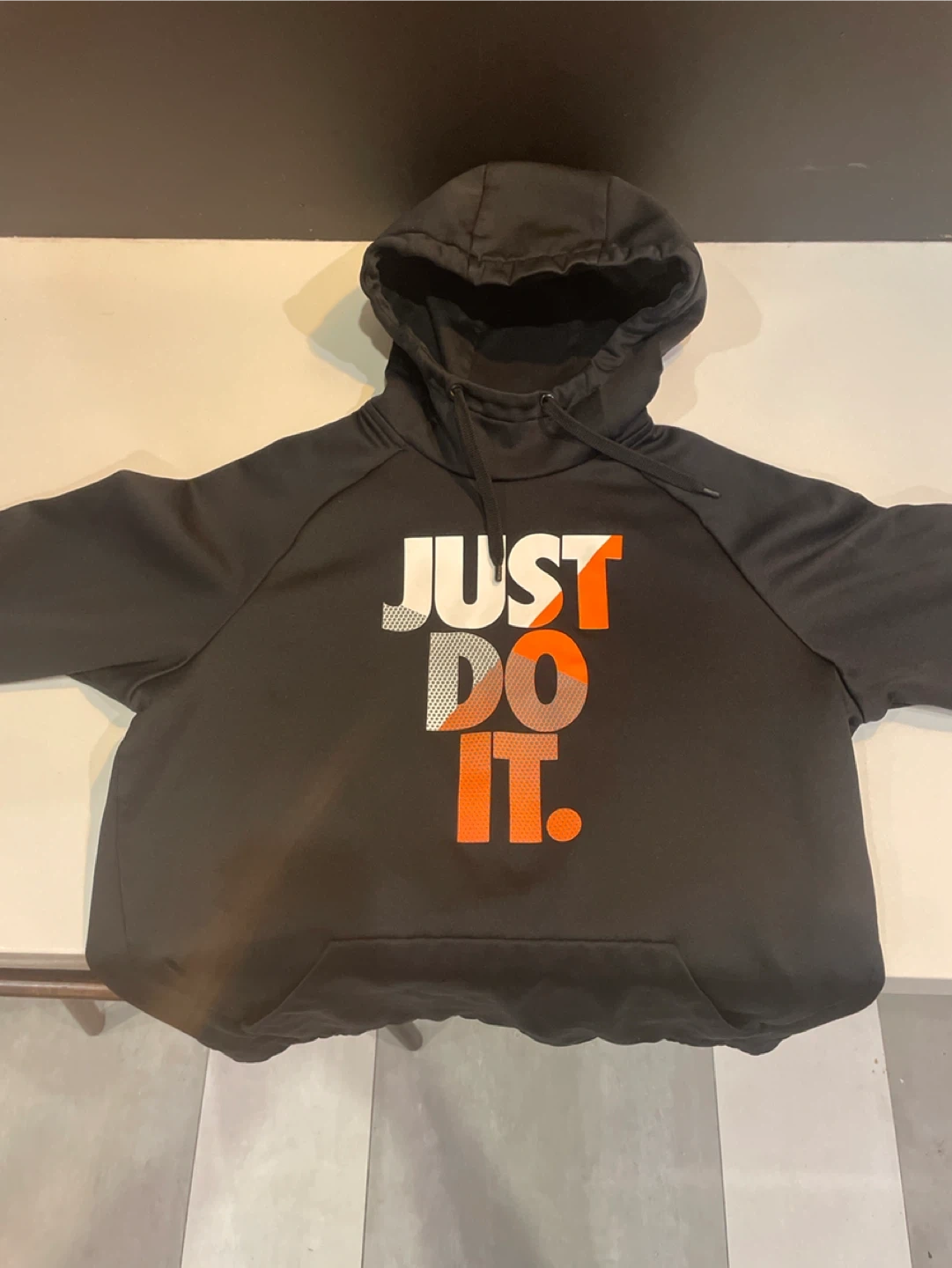 black Nike hoodie with the 'Just Do It' logo. It's in great condition and ready for a new owner! Perfect for workouts or casual wear