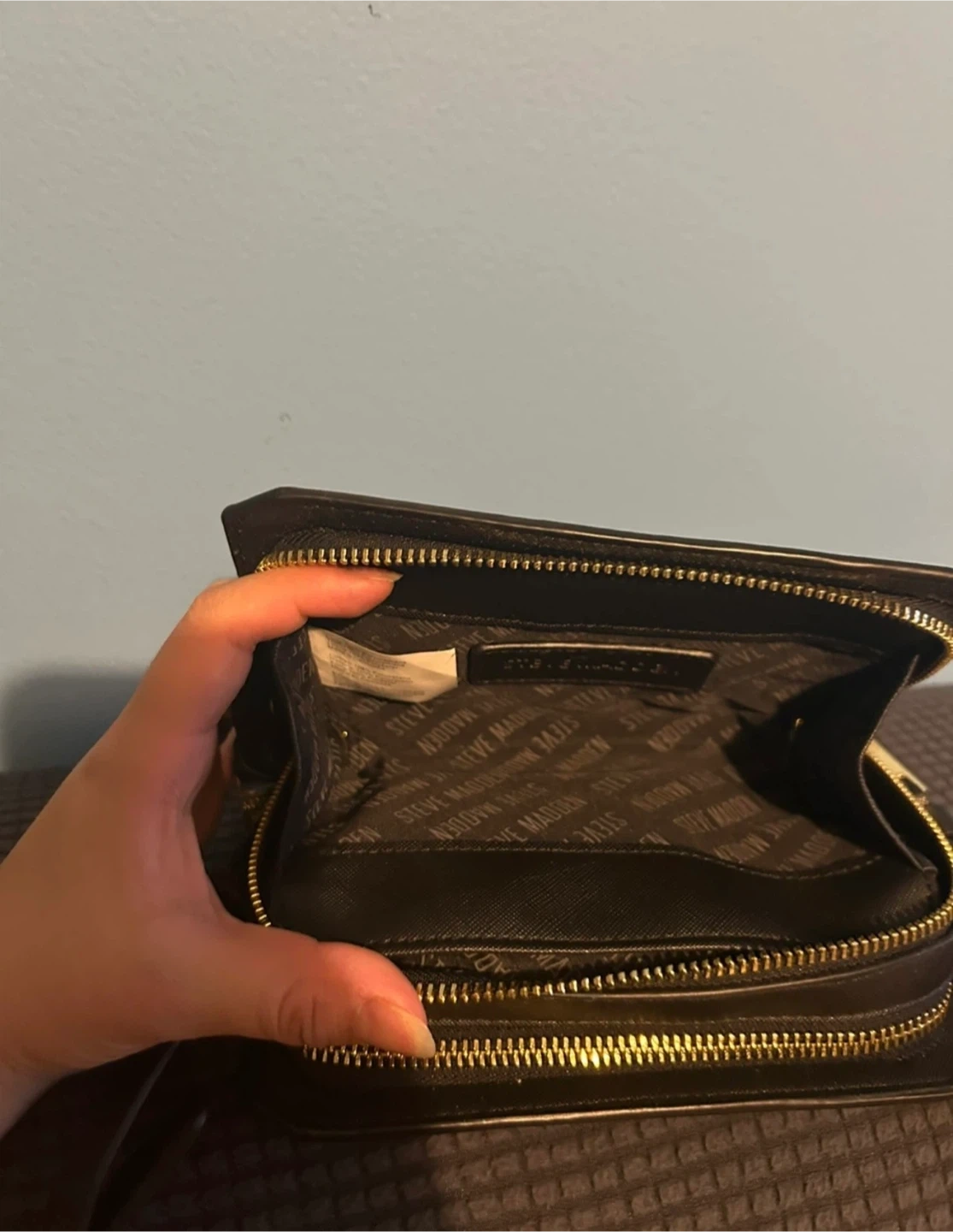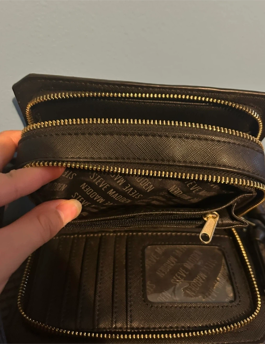 This is a black Steve Madden crossbody wallet bag. It's made of faux leather with gold hardware. It has multiple card slots and zippered compartments.