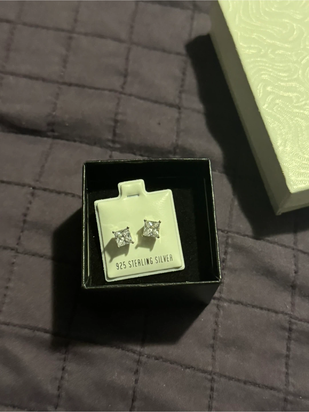 These are a pair of square stud earrings. They're made of 925 sterling silver. The earrings come in a presentation box.