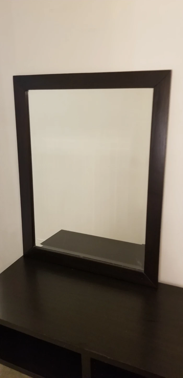 Selling a framed mirror with a dark brown frame. It's in great condition and ready to be hung up in your home!