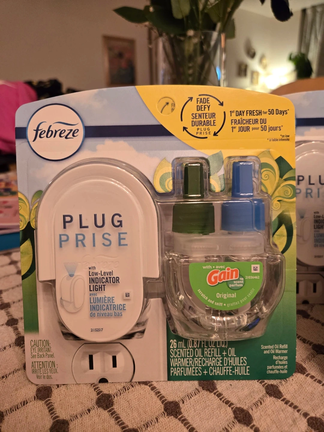 Febreze Plug air freshener with a low-level indicator light. Includes one Gain Original scented oil refill and oil warmer. Provides 1st Day Fresh for 50 days on low setting.