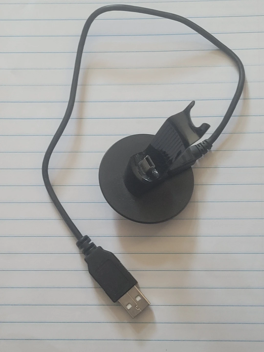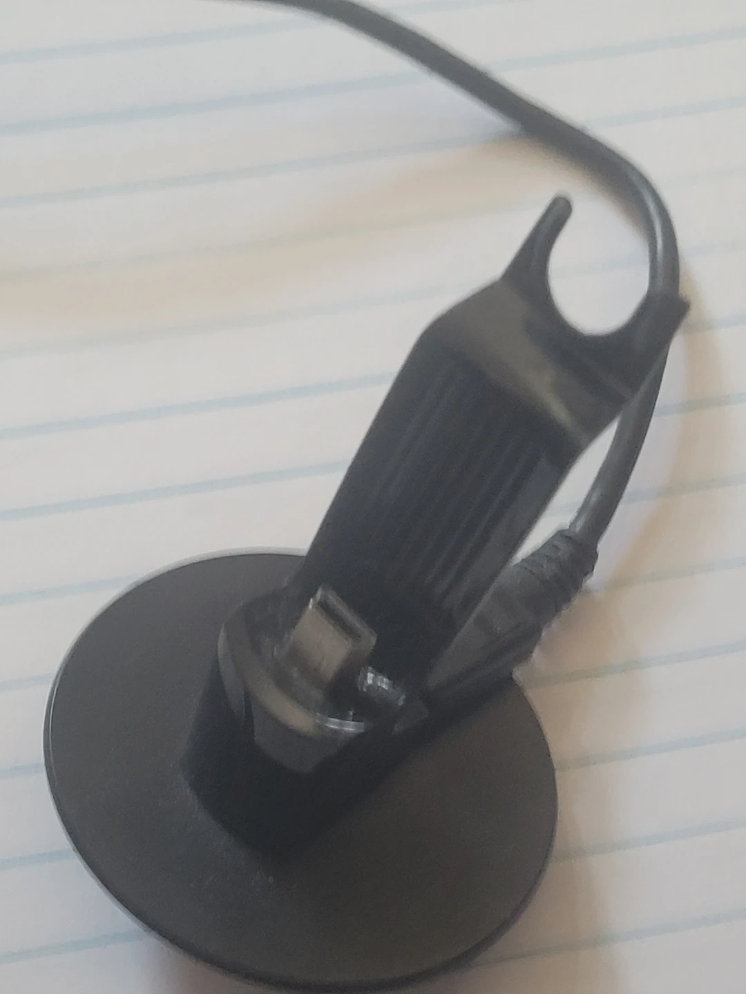 This is a black USB charging dock stand. It connects via USB for power. The stand holds your device upright while charging.