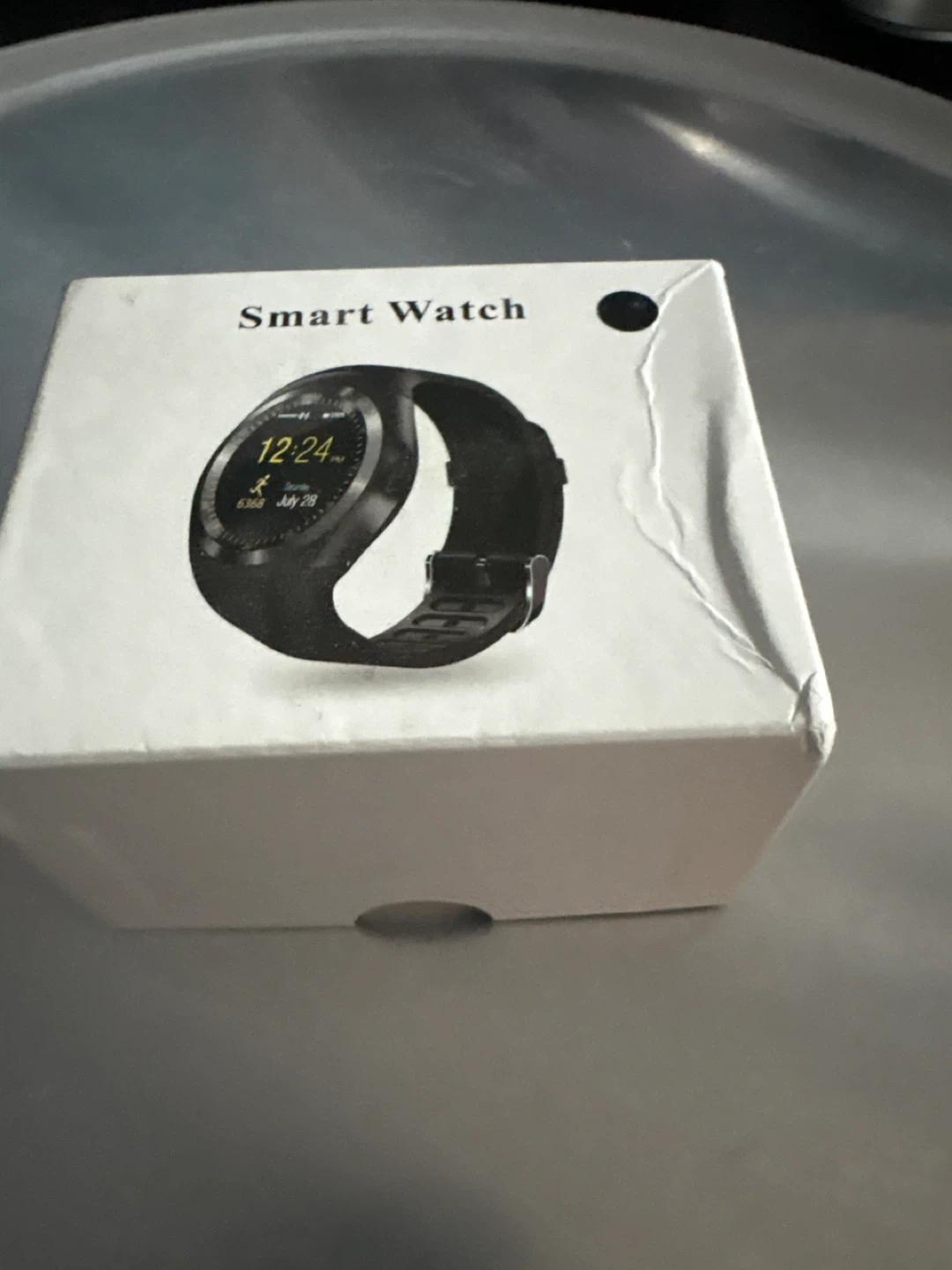 This is a smart watch, black in colour. It's a new item in its original box. The watch face shows the time, date, and activity tracking.