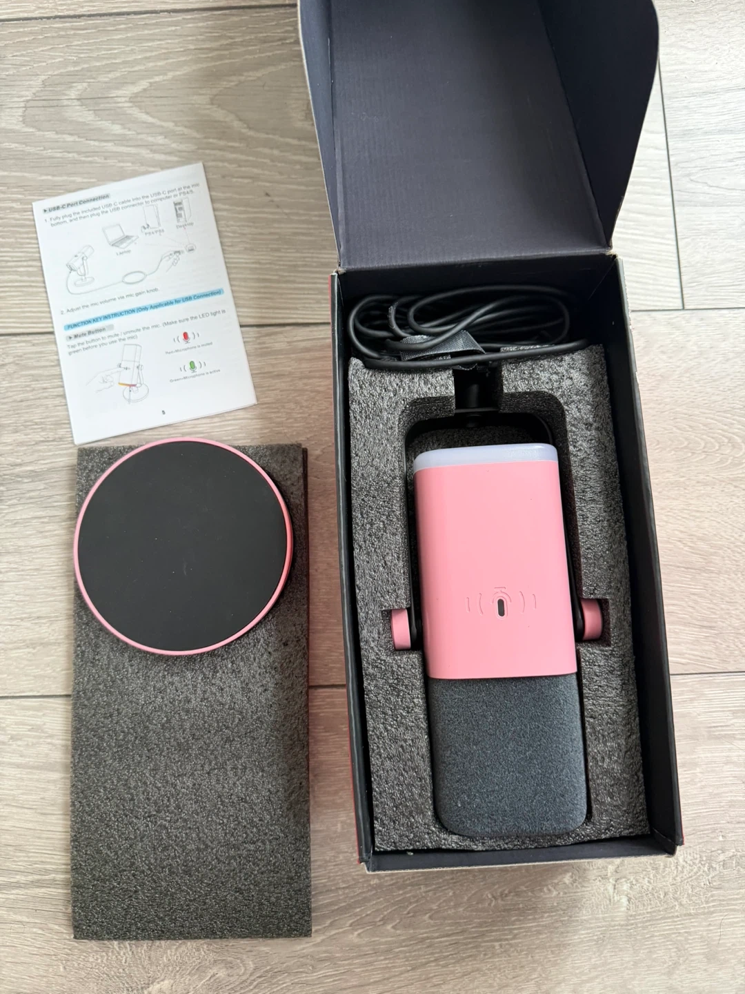 This FIFINE AM8 microphone is designed for streaming and recording. It features USB-C and XLR connectors. It's a dynamic microphone and includes a windscreen, a 6.5ft USB C to USB cable, a mic-based stand, and a user manual.