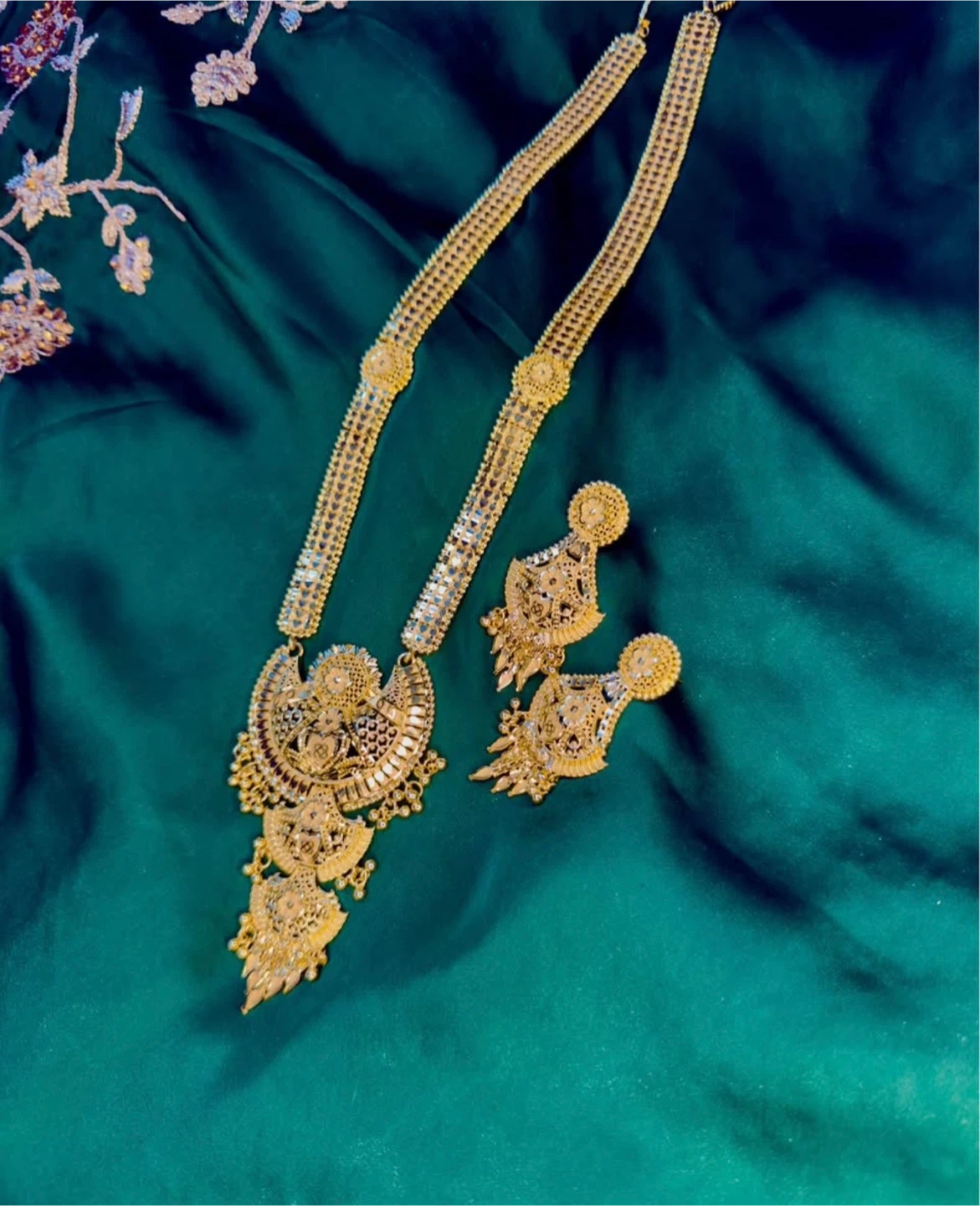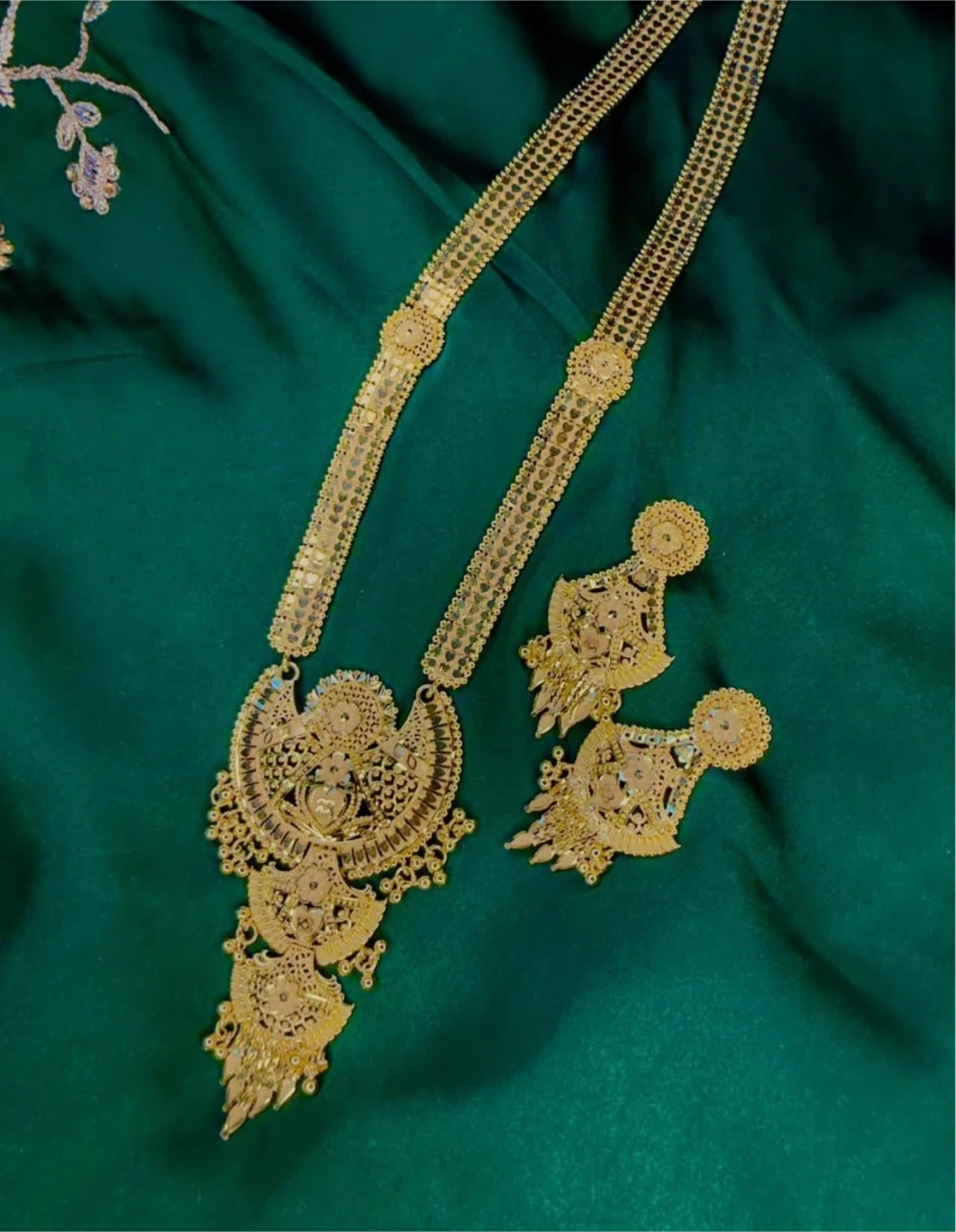This is a stunning gold-tone necklace and earring set. The necklace features an intricate pendant with matching drop earrings. It's crafted with detailed metalwork for a rich, ornate look.