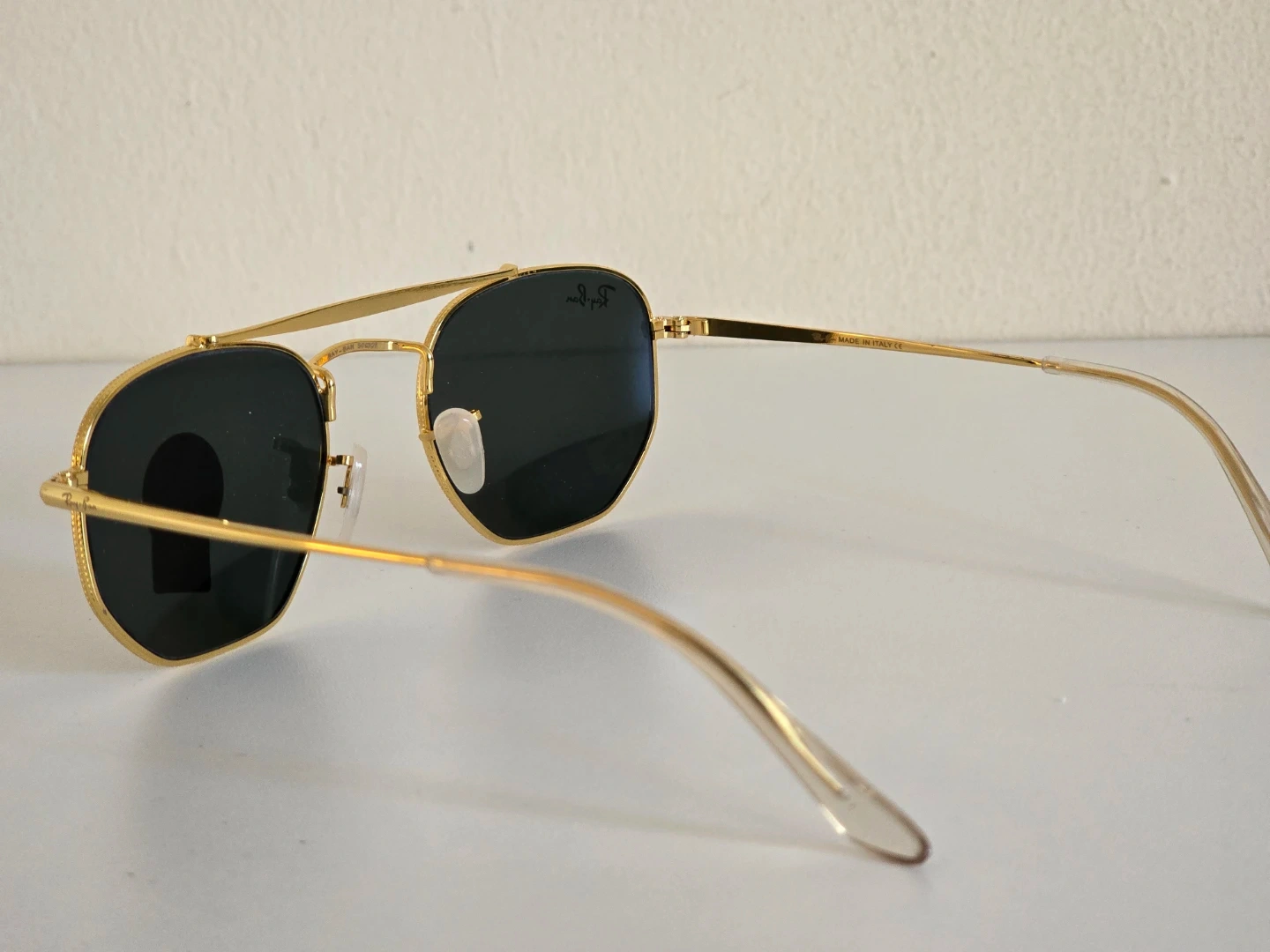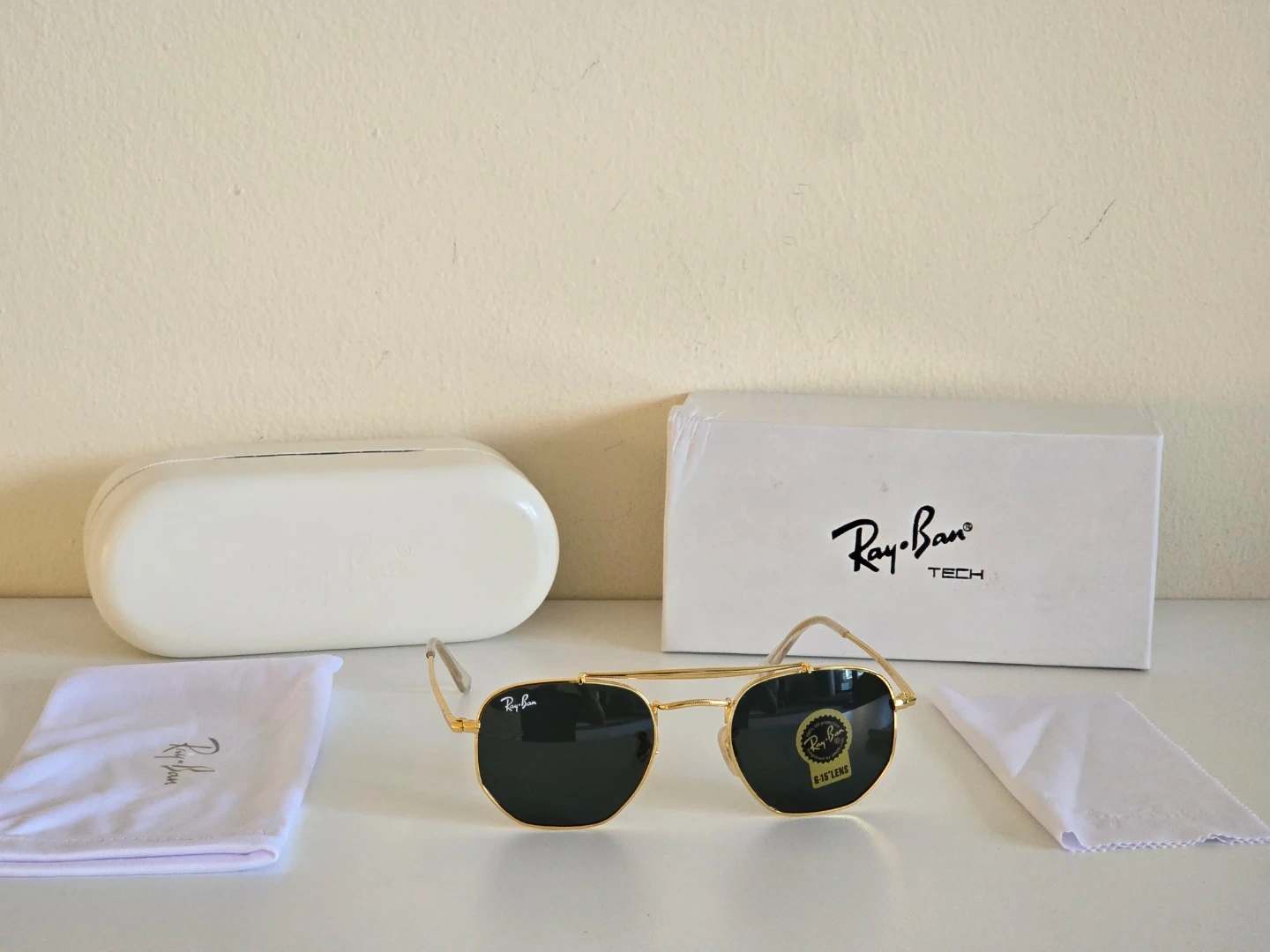 Ray-Ban aviator sunglasses with a gold metal frame. They feature dark lenses with G-15 lens technology. Includes the original box, case, and cleaning cloths. Made in Italy.