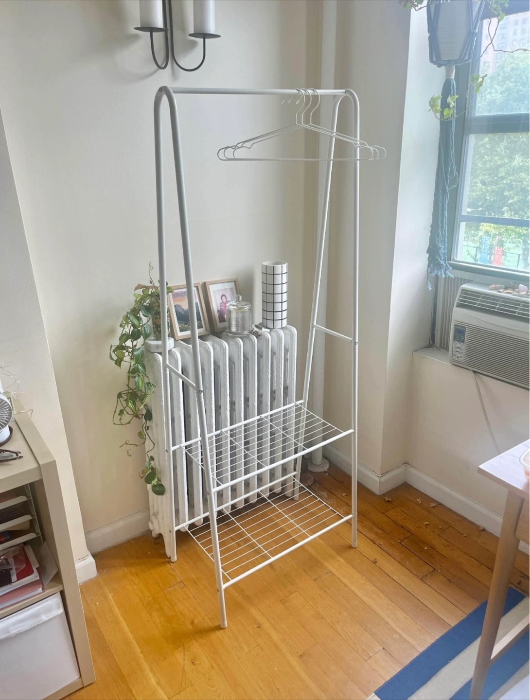 Selling a white metal clothes rack! It's in great condition and perfect for extra storage. It features a hanging bar and two wire shelves for shoes or folded clothes. Great for small spaces.