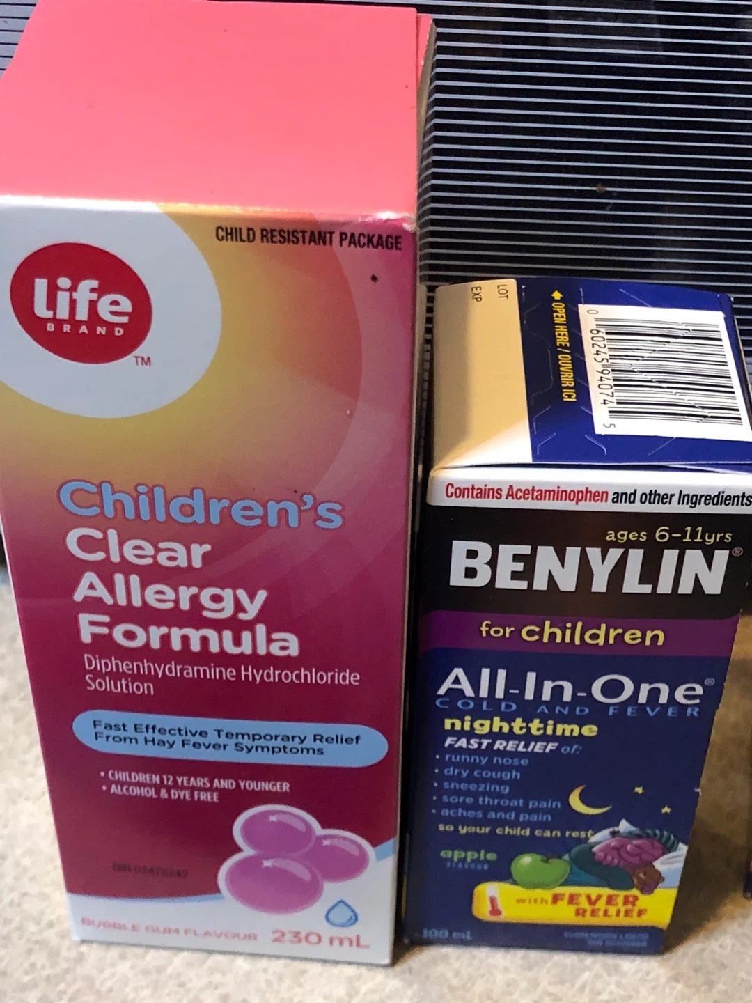 πβ¨FREE πΈππ₯ NEW Life Brand Children's Clear Allergy Formula for temporary relief from hay fever symptoms. Benylin All-In-One Cold and Fever Nighttime provides fast relief for children. Expire this month unopened but hey if you need it better than buying it!!, 230 mL and 100 mL respectively.