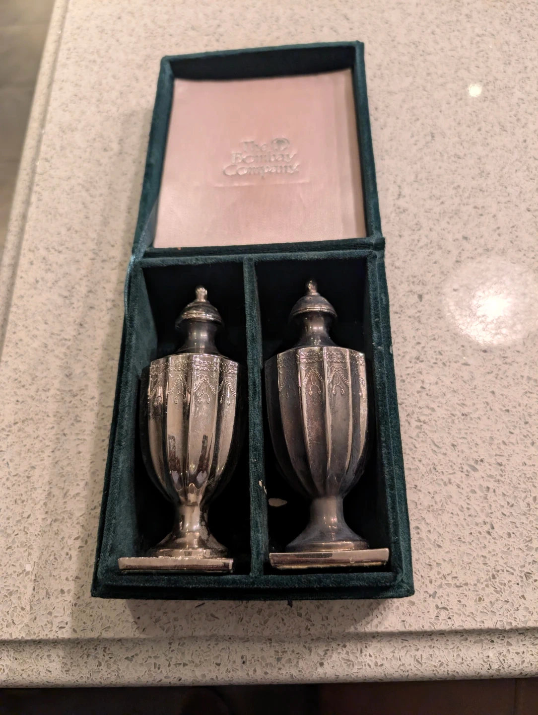 A pair of decorative salt and pepper shakers from The Bombay Company. These shakers are in a vintage style and come in their original velvet-lined box. They're made of metal with an ornate design. Perfect for adding a touch of elegance to your dining table!