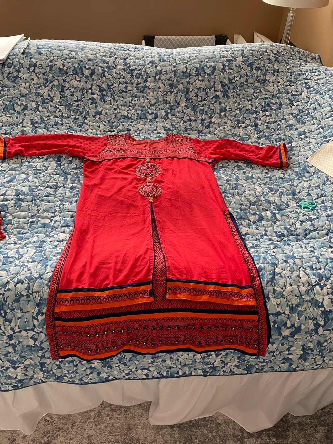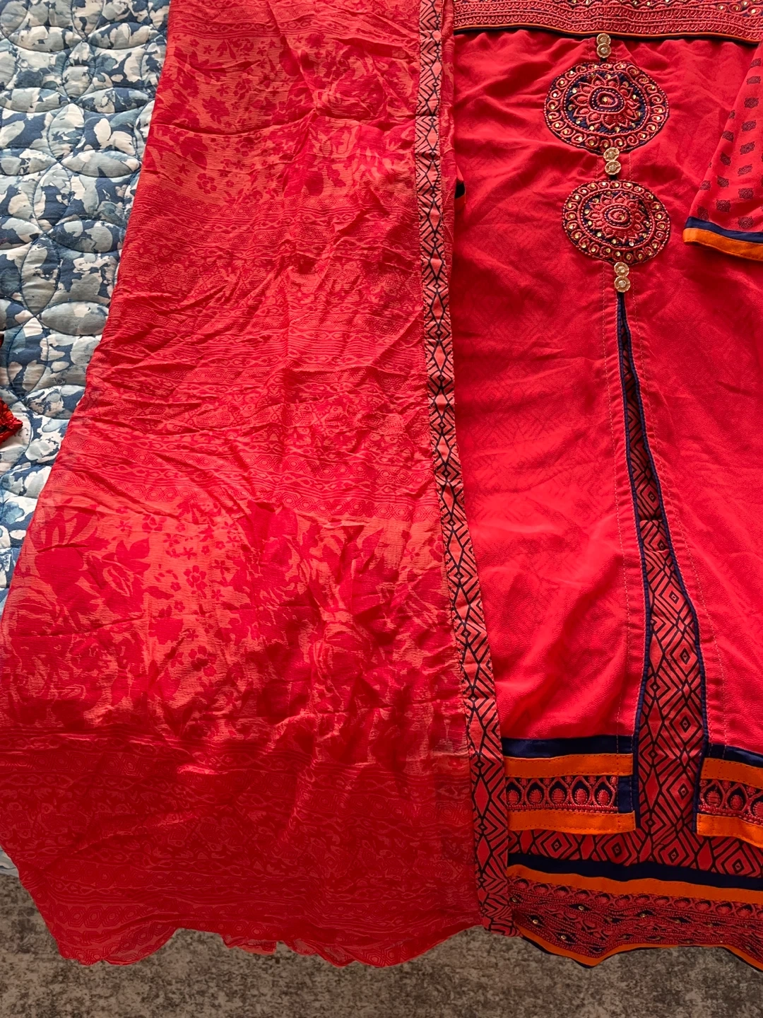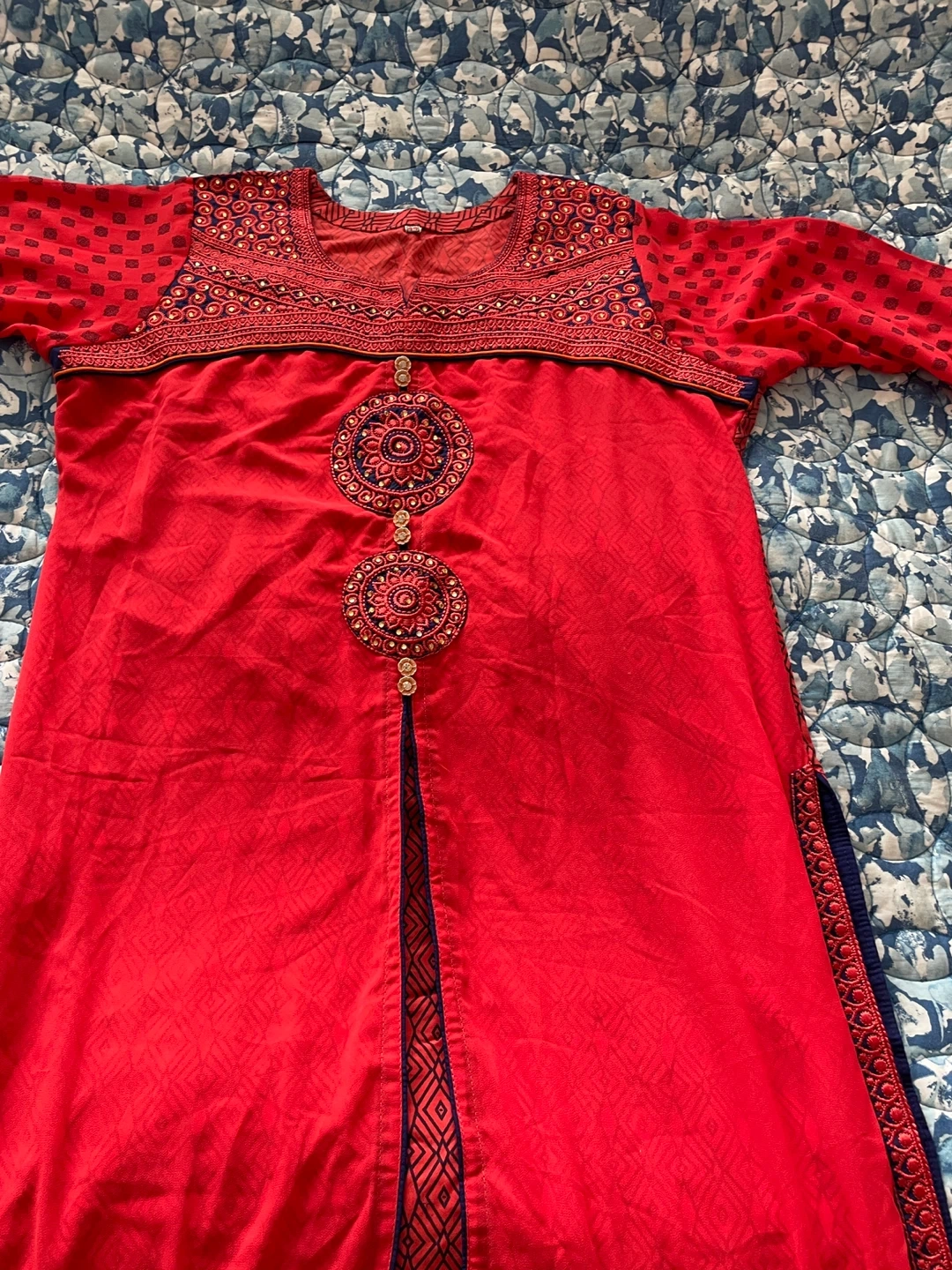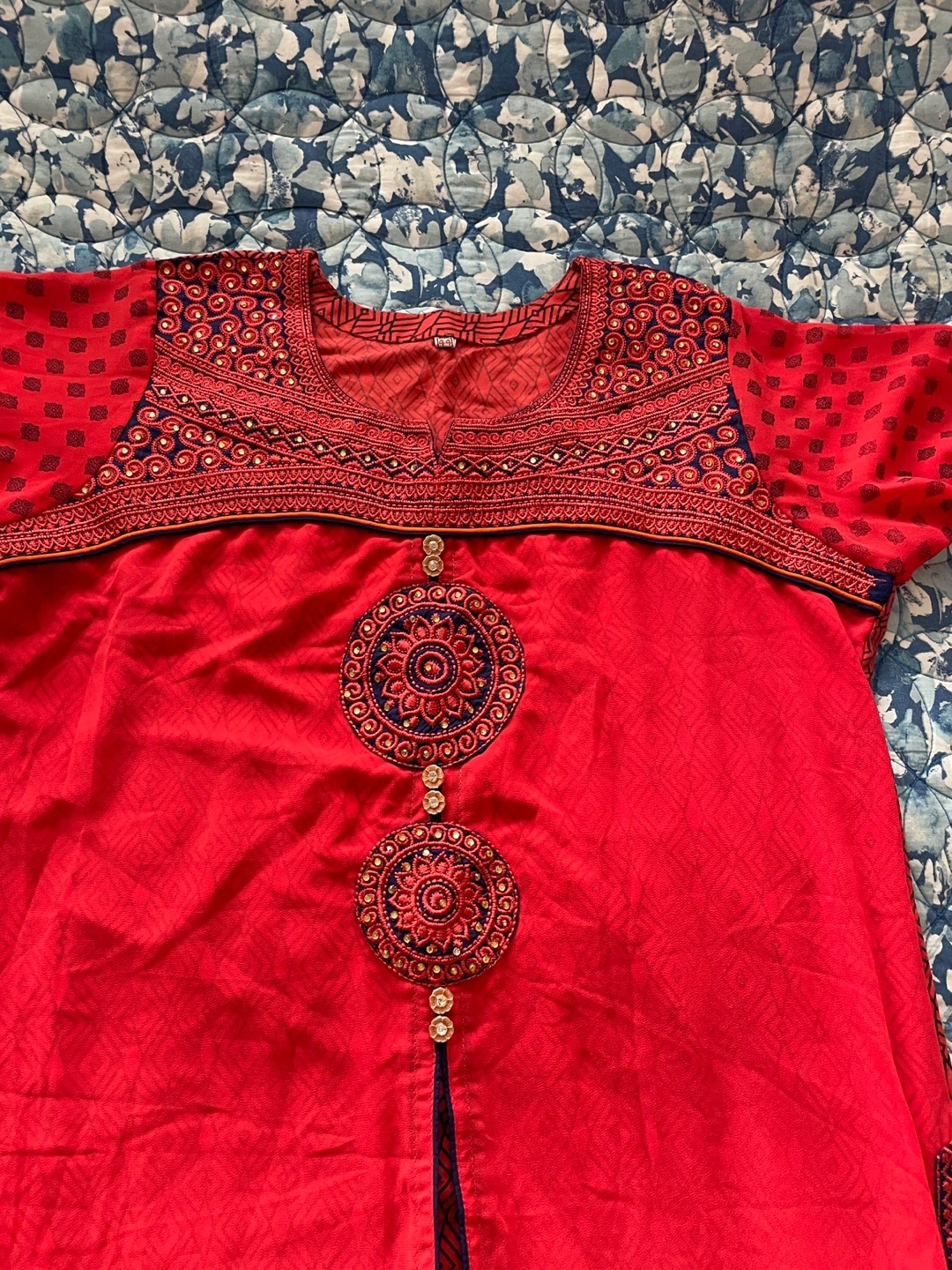 This is a red embroidered kurti with a matching dupatta. It features intricate beadwork and button detailing on the neckline and front. The sleeves have a printed pattern, and the hemline has a contrasting embroidered border. It's perfect for casual wear or special occasions!