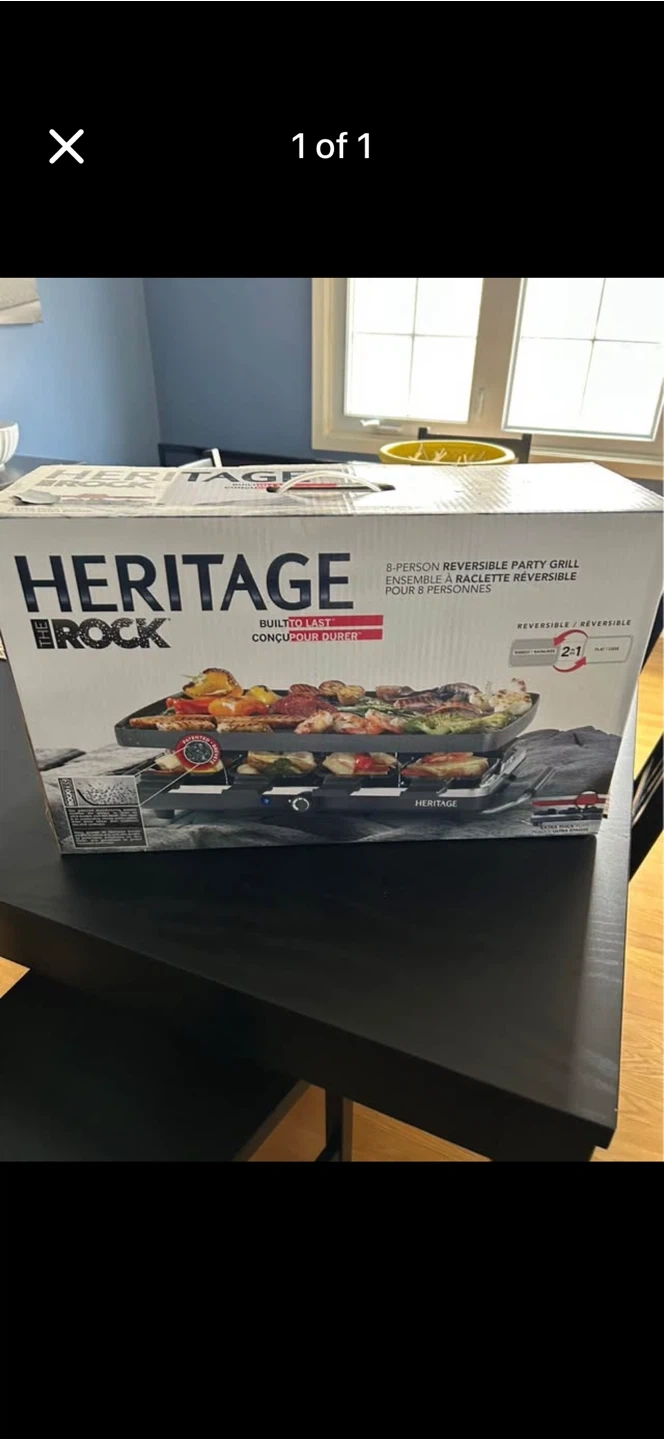 It's an 8-person reversible party grill by Heritage The Rock. Built to last, it's perfect for entertaining guests. The grill is reversible and offers a 2-in-1 cooking surface.