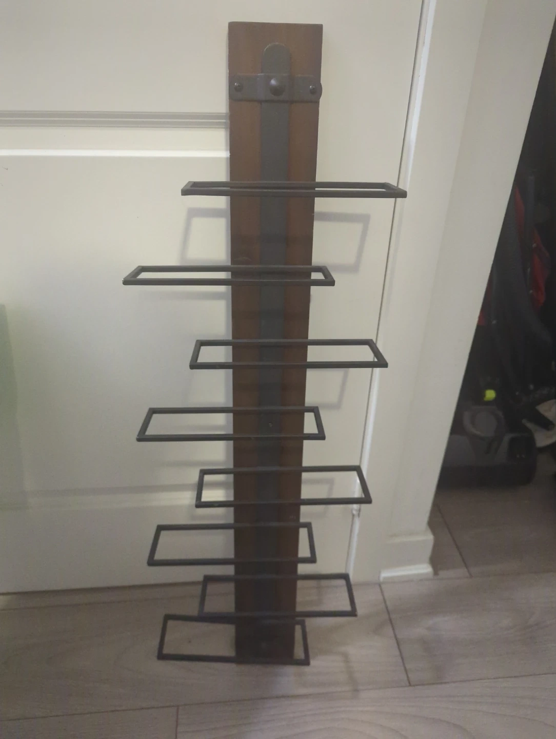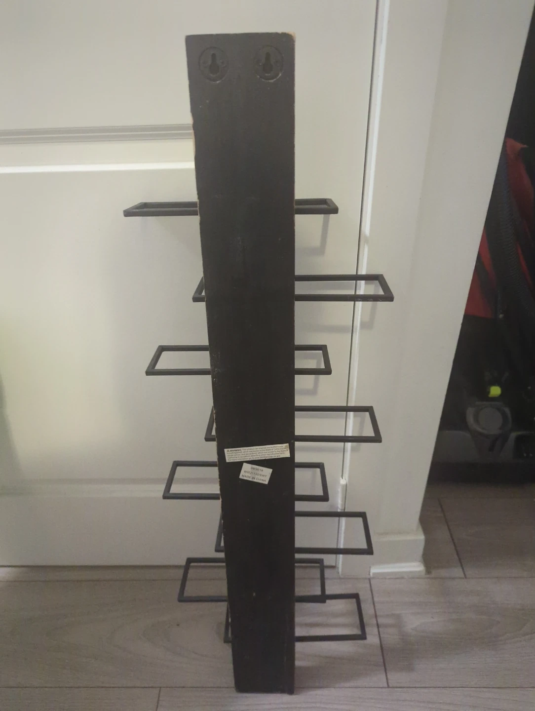 This is a vertical wine rack with a dark wood and metal design. It holds multiple bottles of wine. Perfect for a small kitchen or dining area!