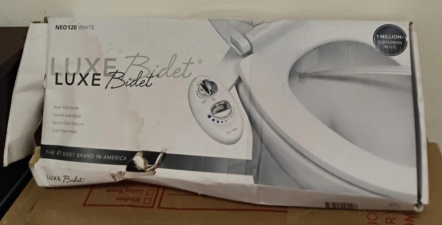 New LUXE Bidet toilet attachment. Cold water model. Features rear wash mode, nozzle guard gate, and nozzle cleaning feature. Box shows some damage.