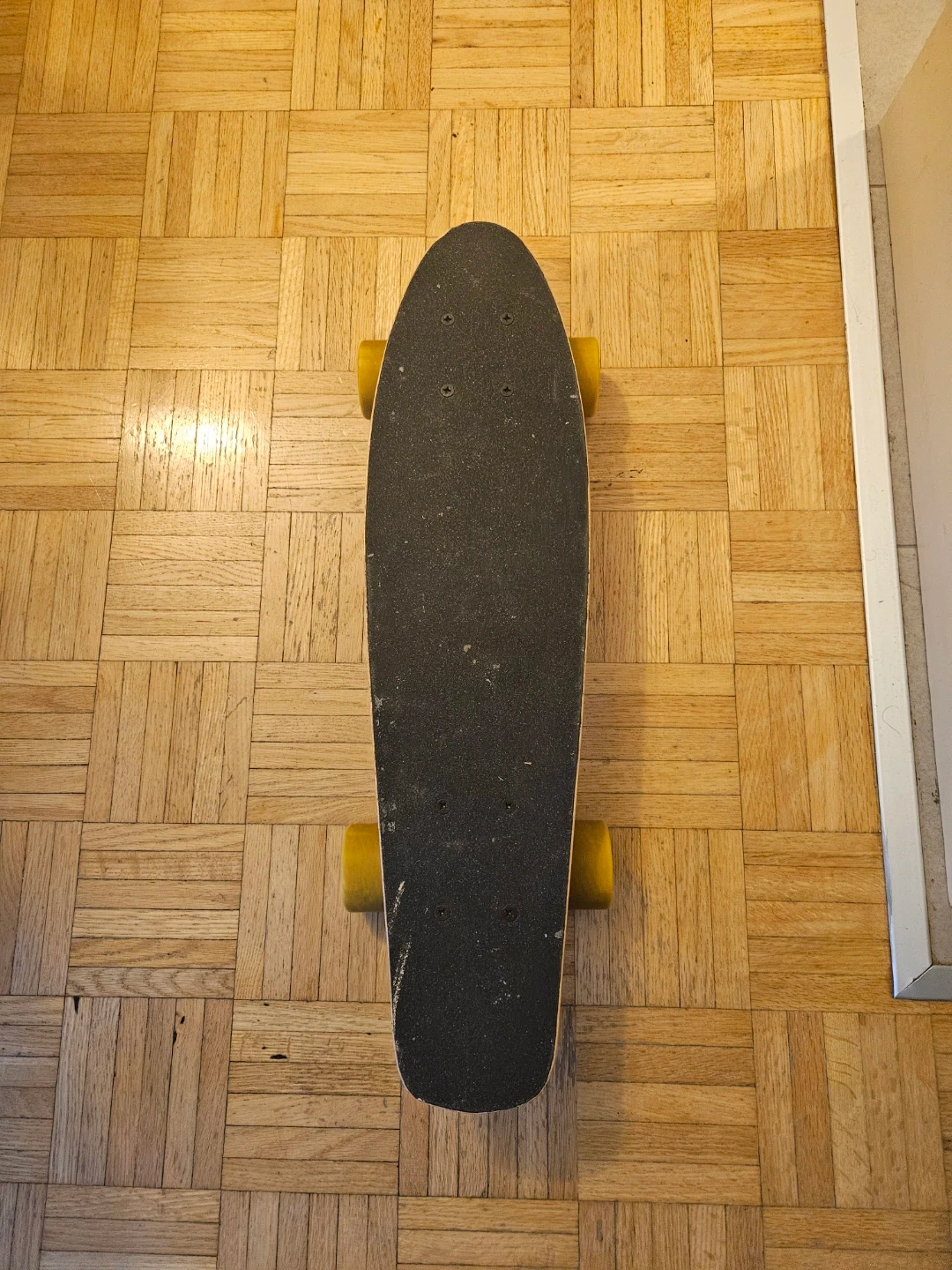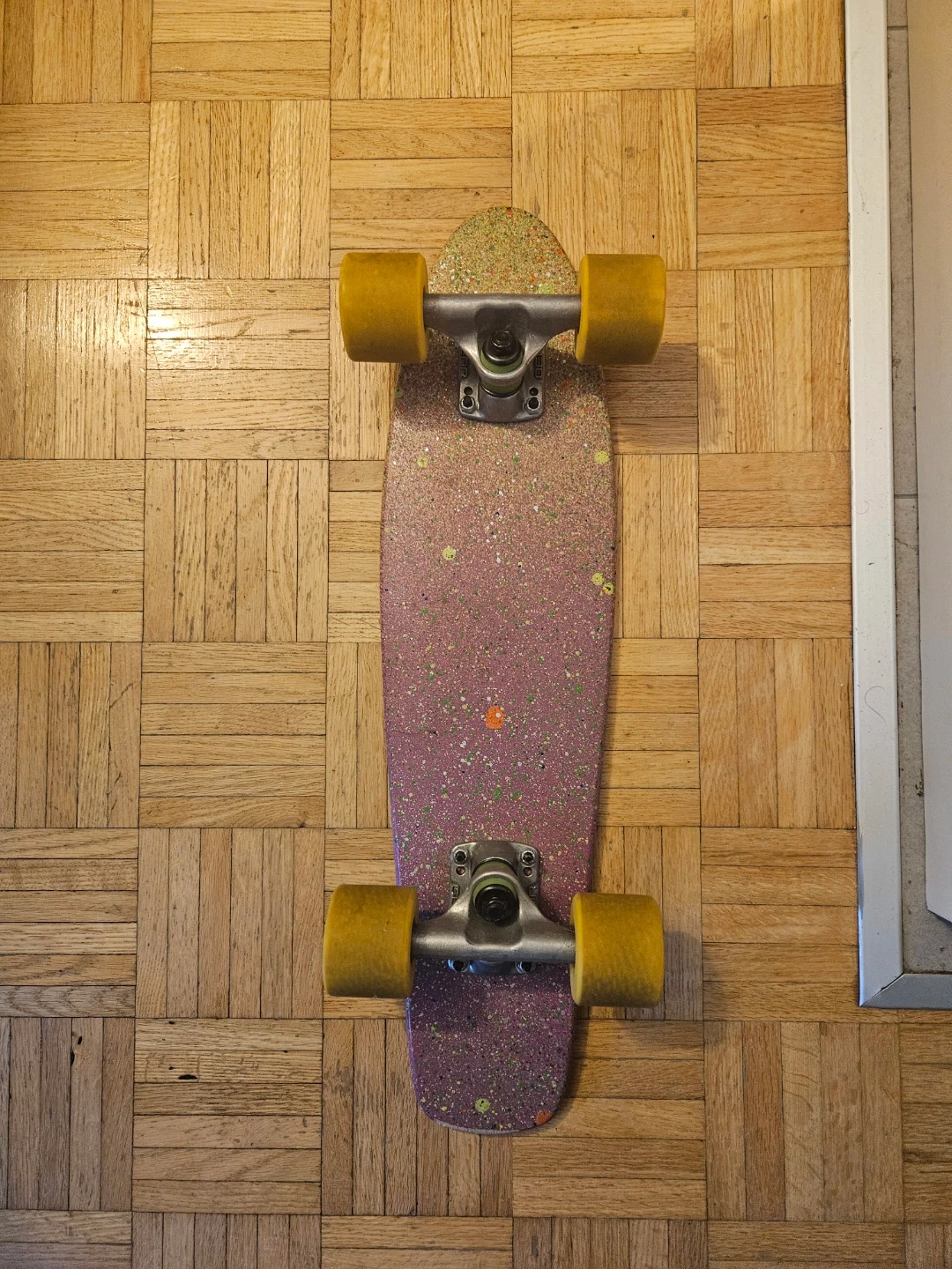 A used wood pennyboard with a colourful speckled deck and yellow wheels. The deck has a grip tape surface on the bottom. It's a fun board for cruising around town!