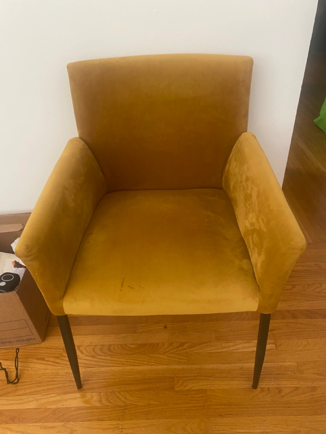 Selling a lovely accent armchair in a mustard yellow velvet.