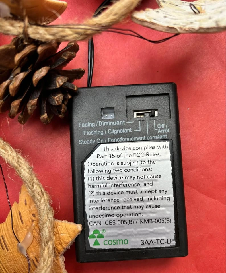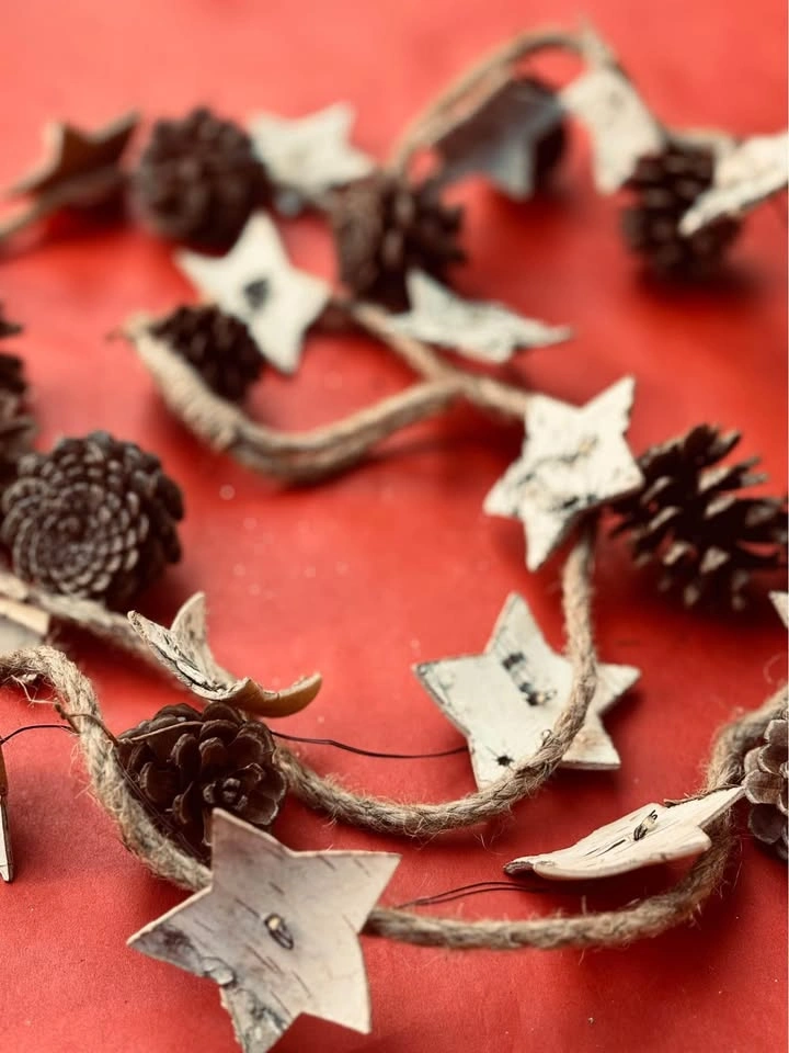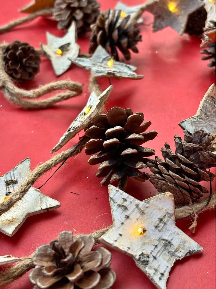 15Rustic Holiday String Lights featuring Pinecones & Wood-shaved Stars on Twine 6 Ft Like New. Add a warm glow and charm to your holiday décor with these festive string lights. Perfect for adding to holiday decorations, incorporating into a centerpiece, wrapping on a stair banister. * 3-Mode lights feature * Flashing * Dimming * Steady on * Requires three AA Batteries * For indoor use