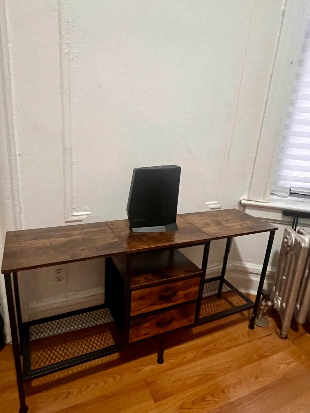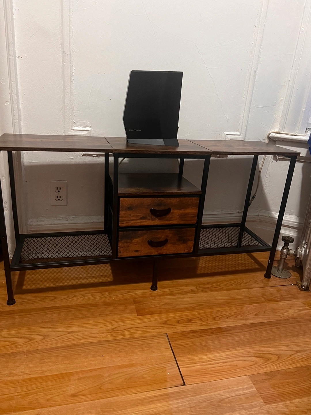 Console table, dark brown wood top and black metal frame. Two drawers, wire shelves. Great for entryway or living room. Minimalist style.
