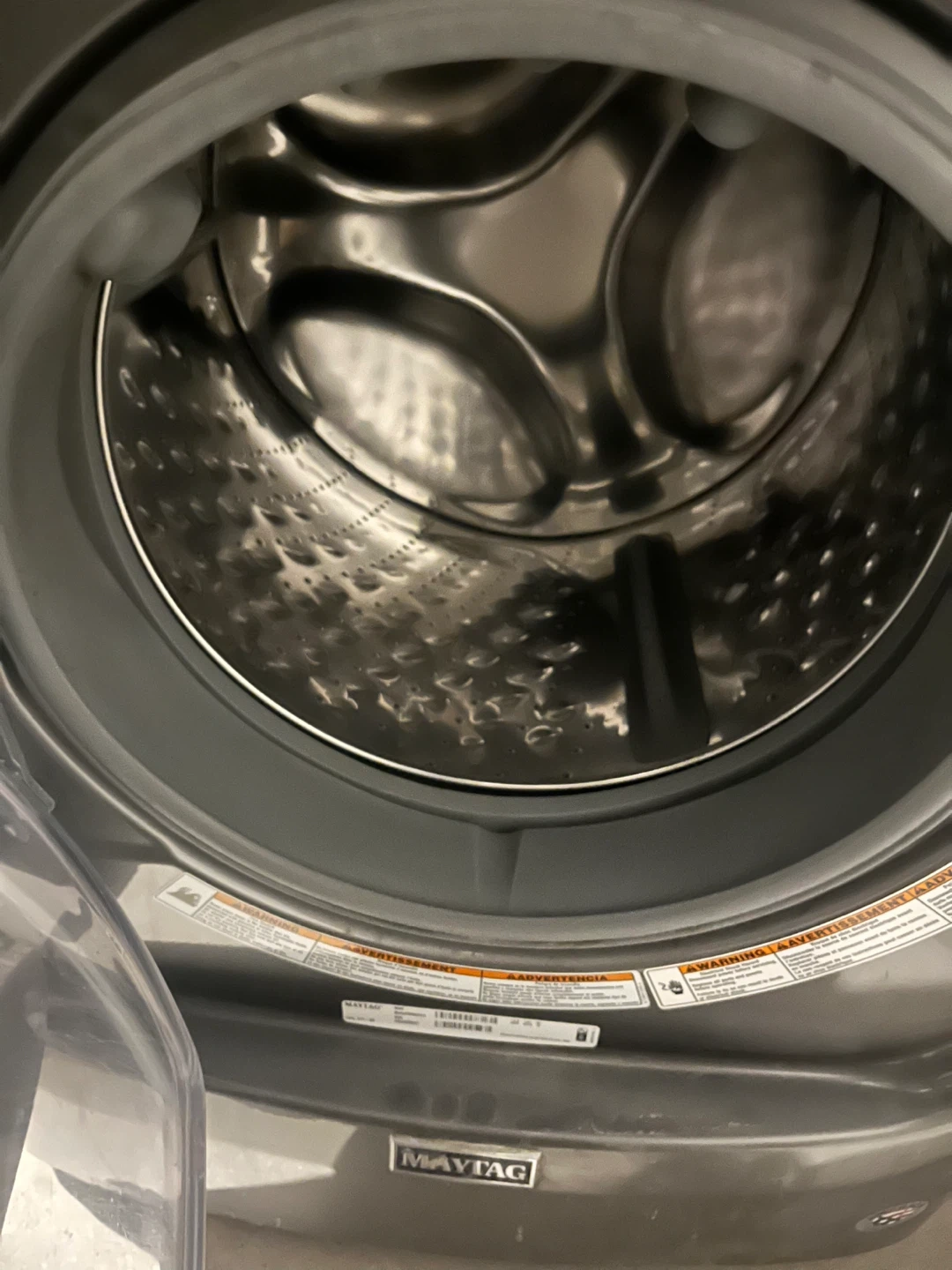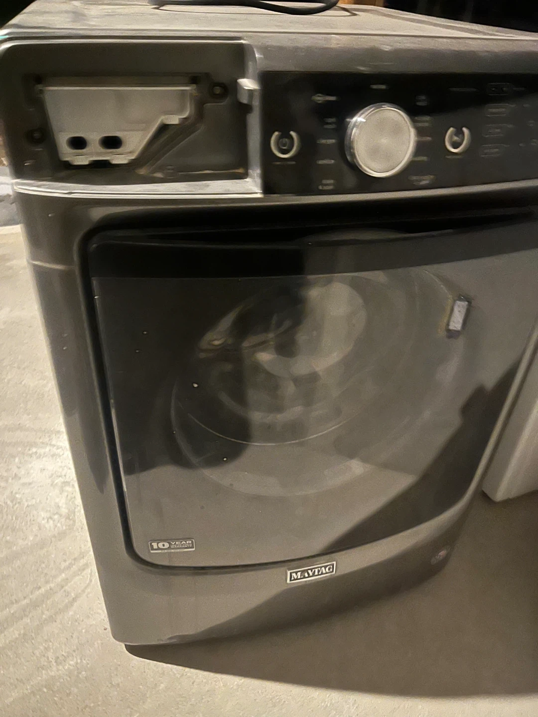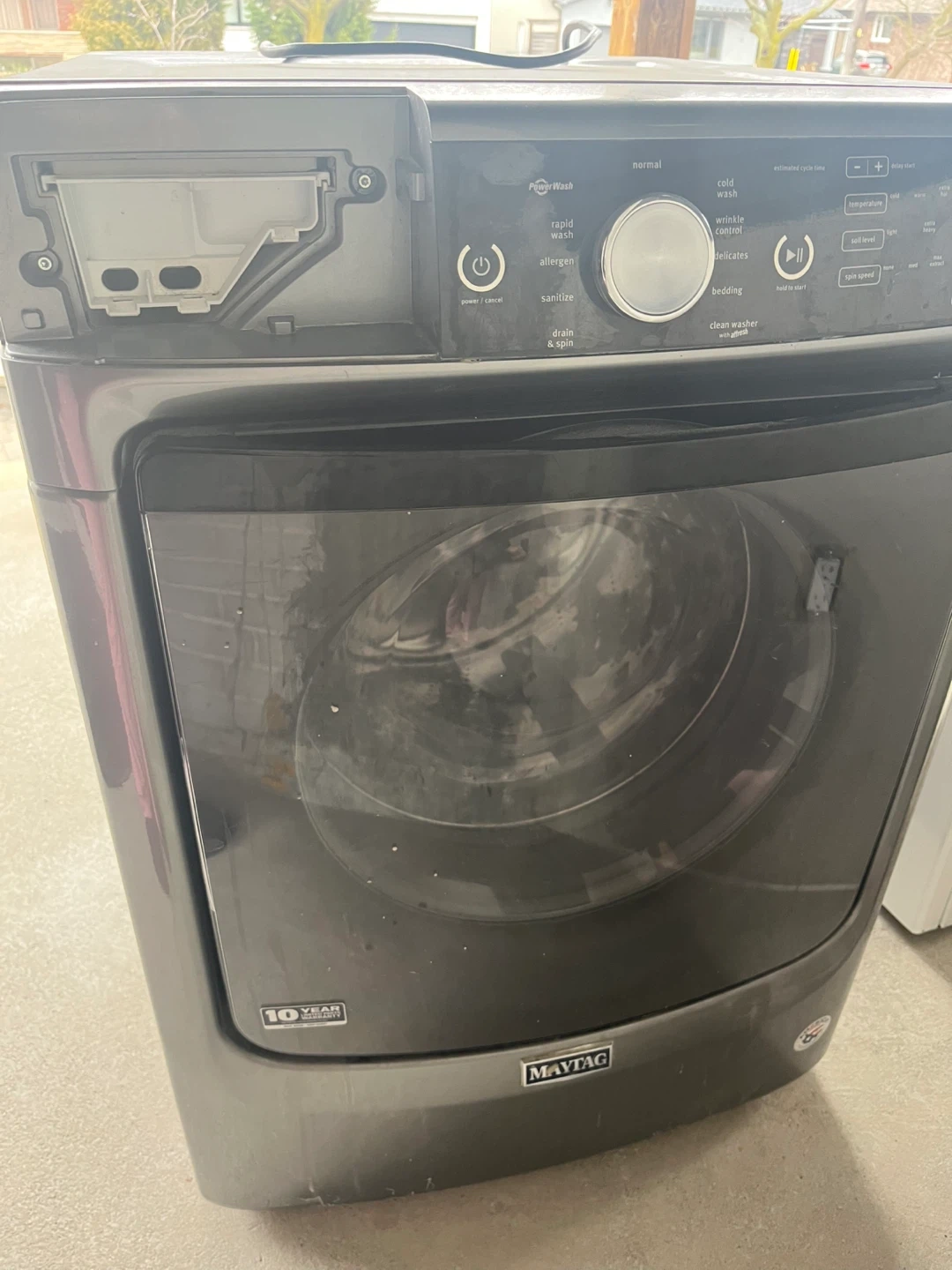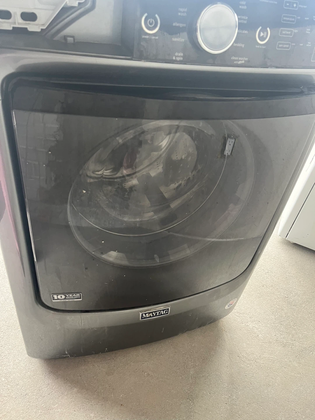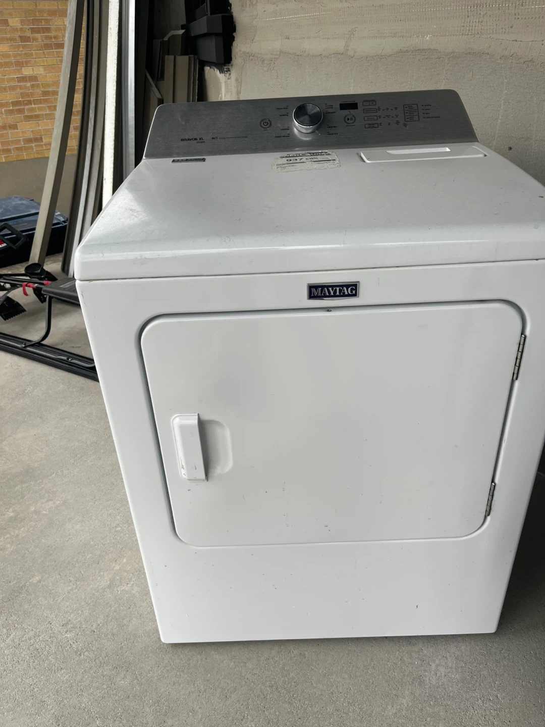 This is a Maytag washing machine and a dryer. The washer is a front-load model. It has a large capacity drum and multiple wash cycles for different fabric types. The dryer is white and large in working order.