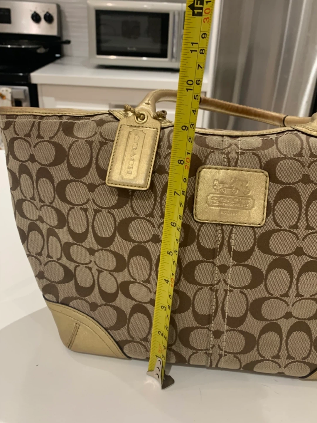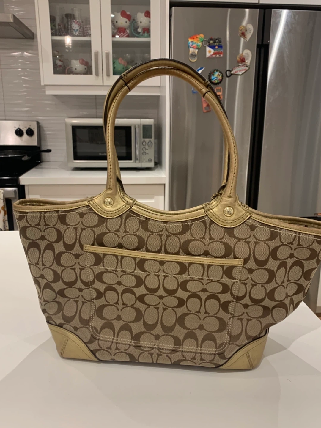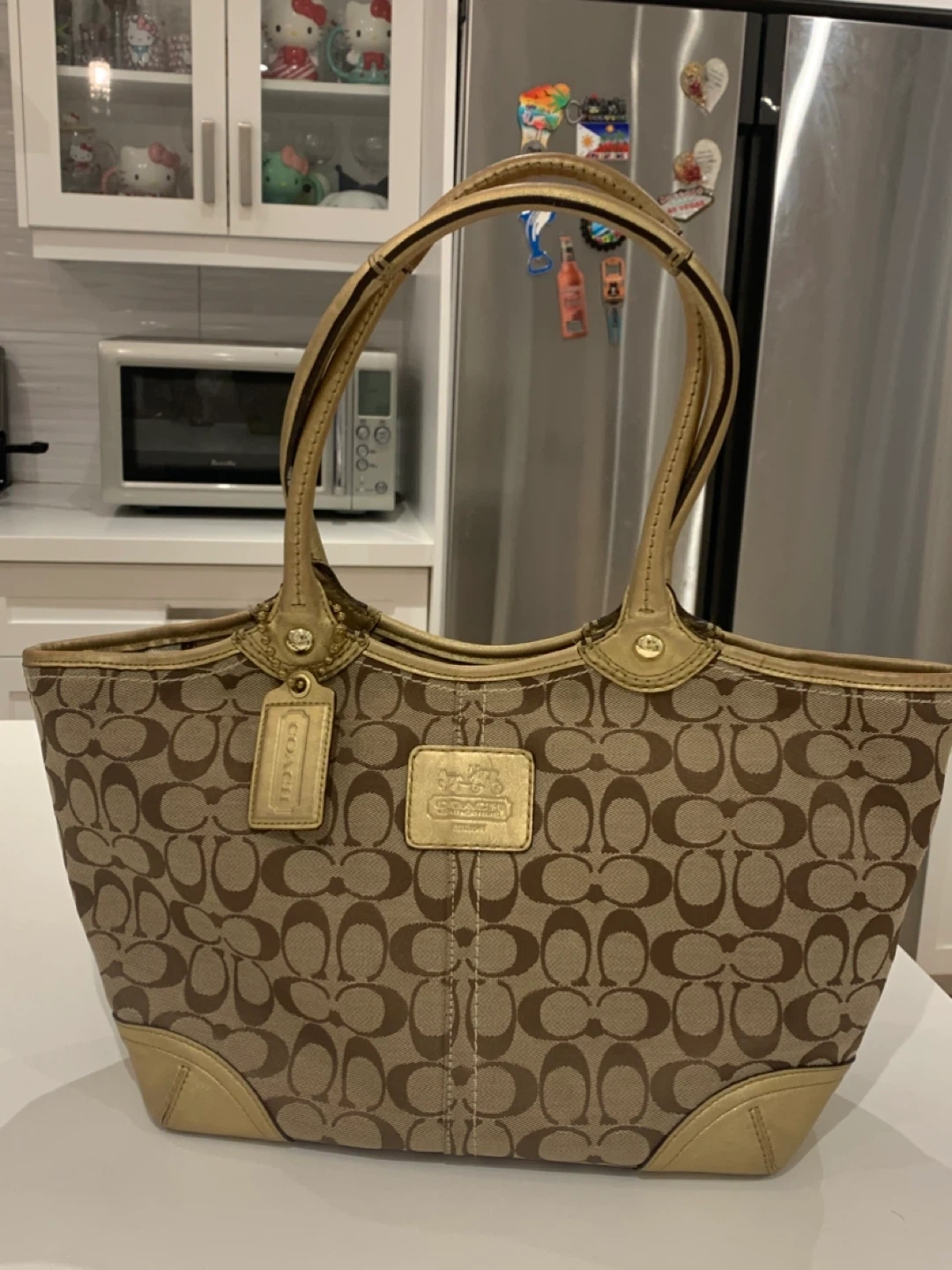 🔥 Gorgeous and Stylish Coach tote with signature pattern. Features elegant gold accents. Perfect for daily use.
