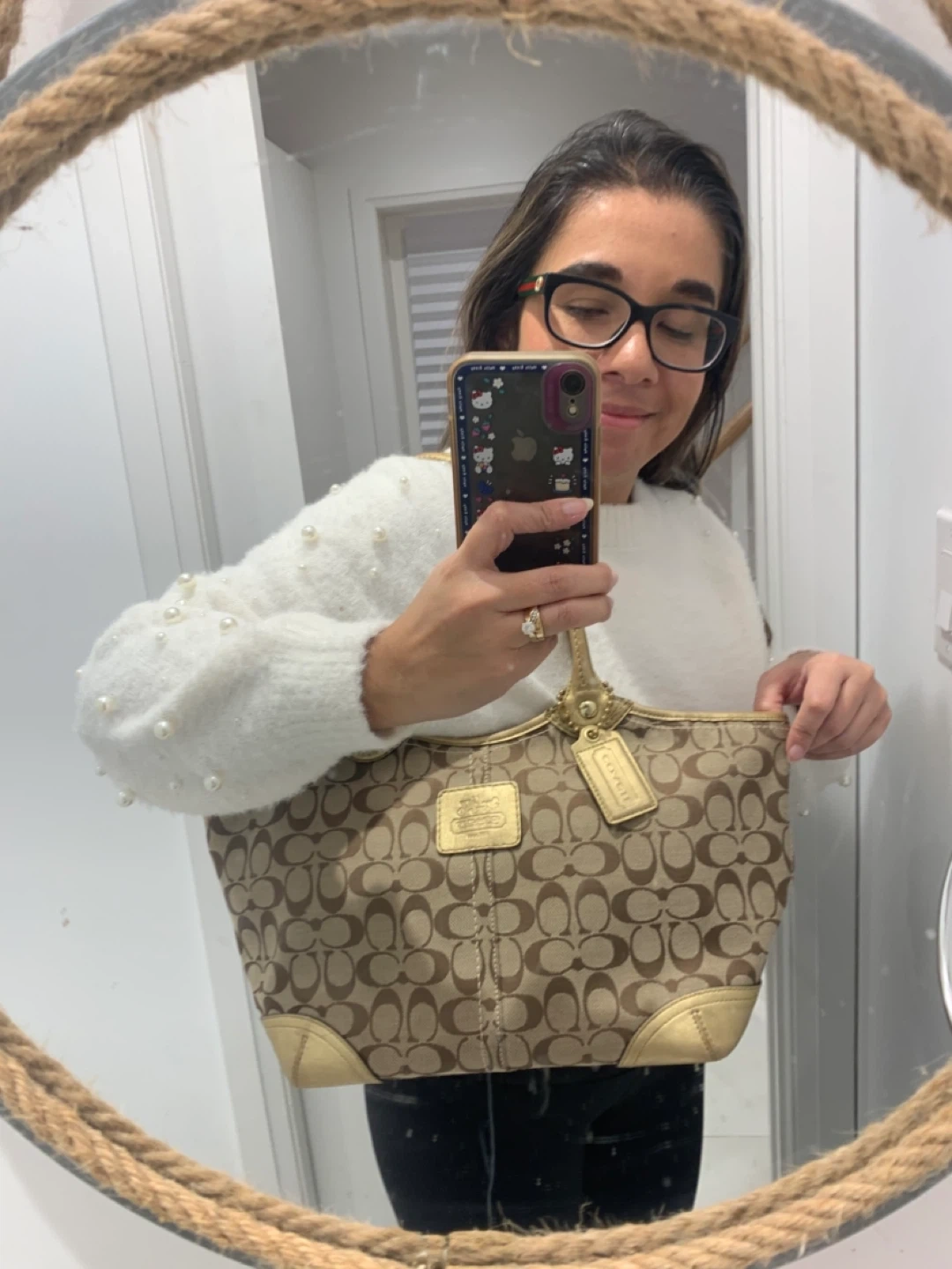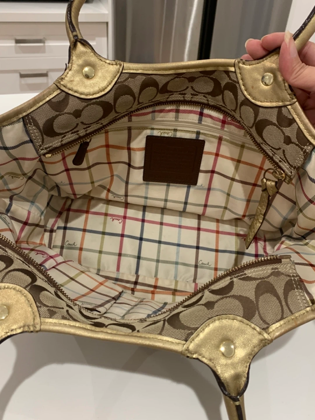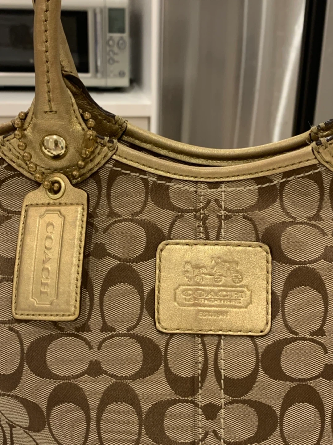 🔥 Gorgeous and Stylish Coach tote with signature pattern. Features elegant gold accents. Perfect for daily use.