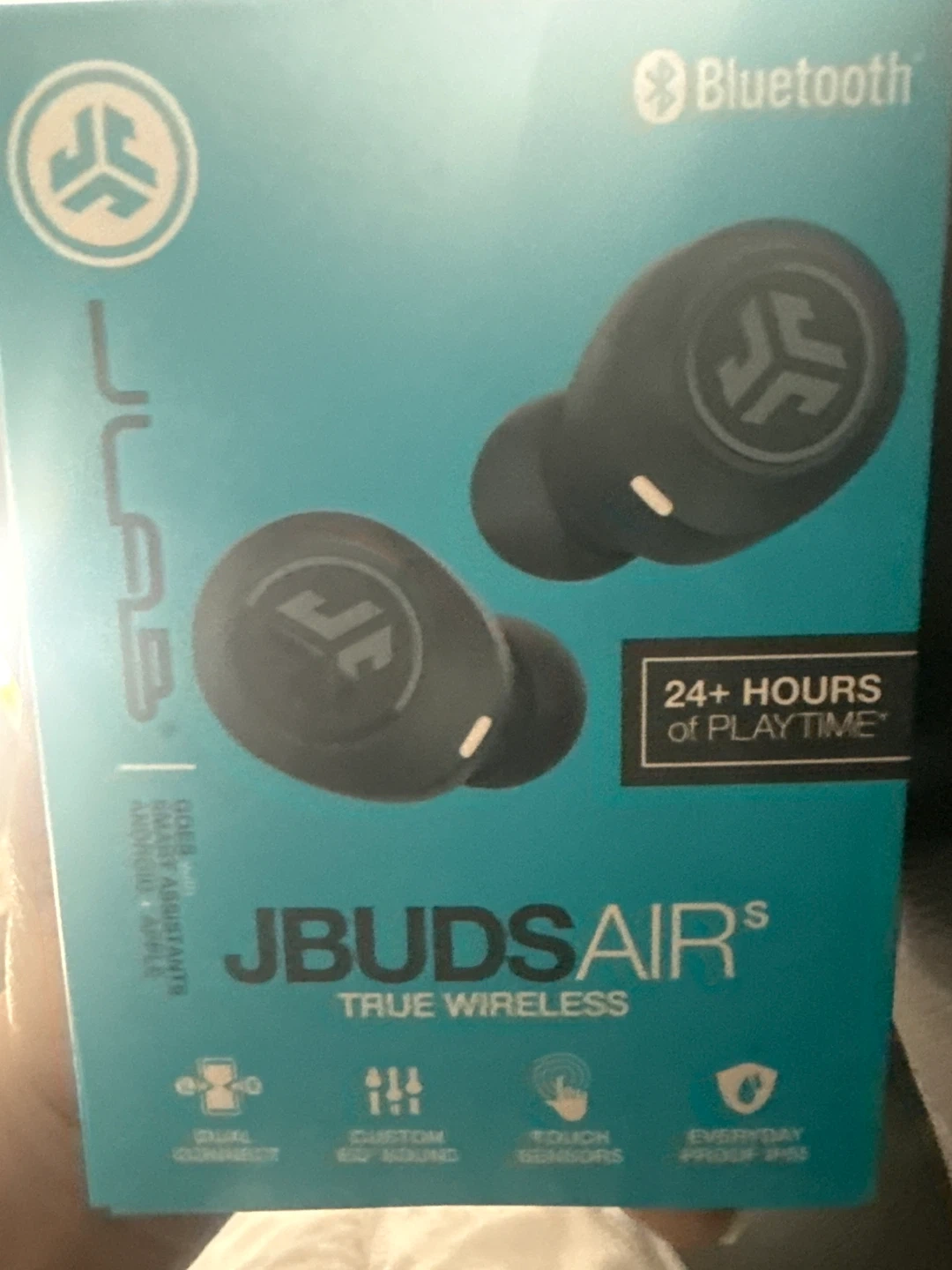 JLab JBuds Air true wireless earbuds. They offer 24+ hours of playtime. Features include dual connect, custom EQ sound, touch sensors, and everyday proof IP55. Supports Android and Apple smart assistants.
