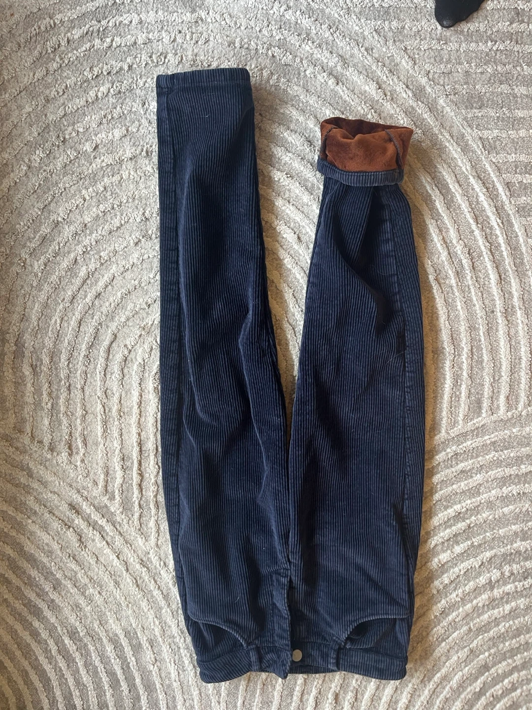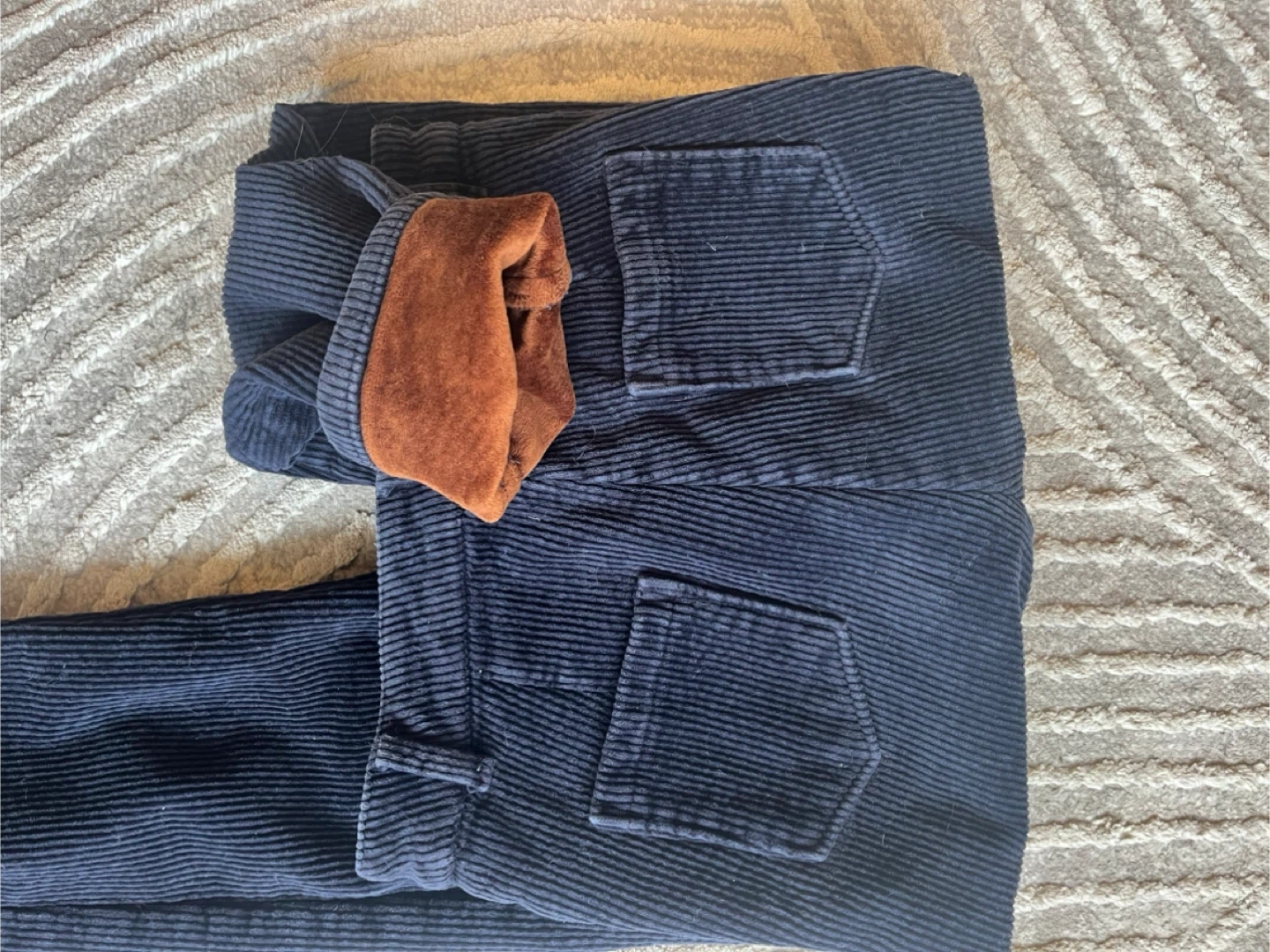 Navy blue corduroy pants with a warm, fuzzy lining. These pants have a classic five-pocket design. They're made from durable corduroy material.