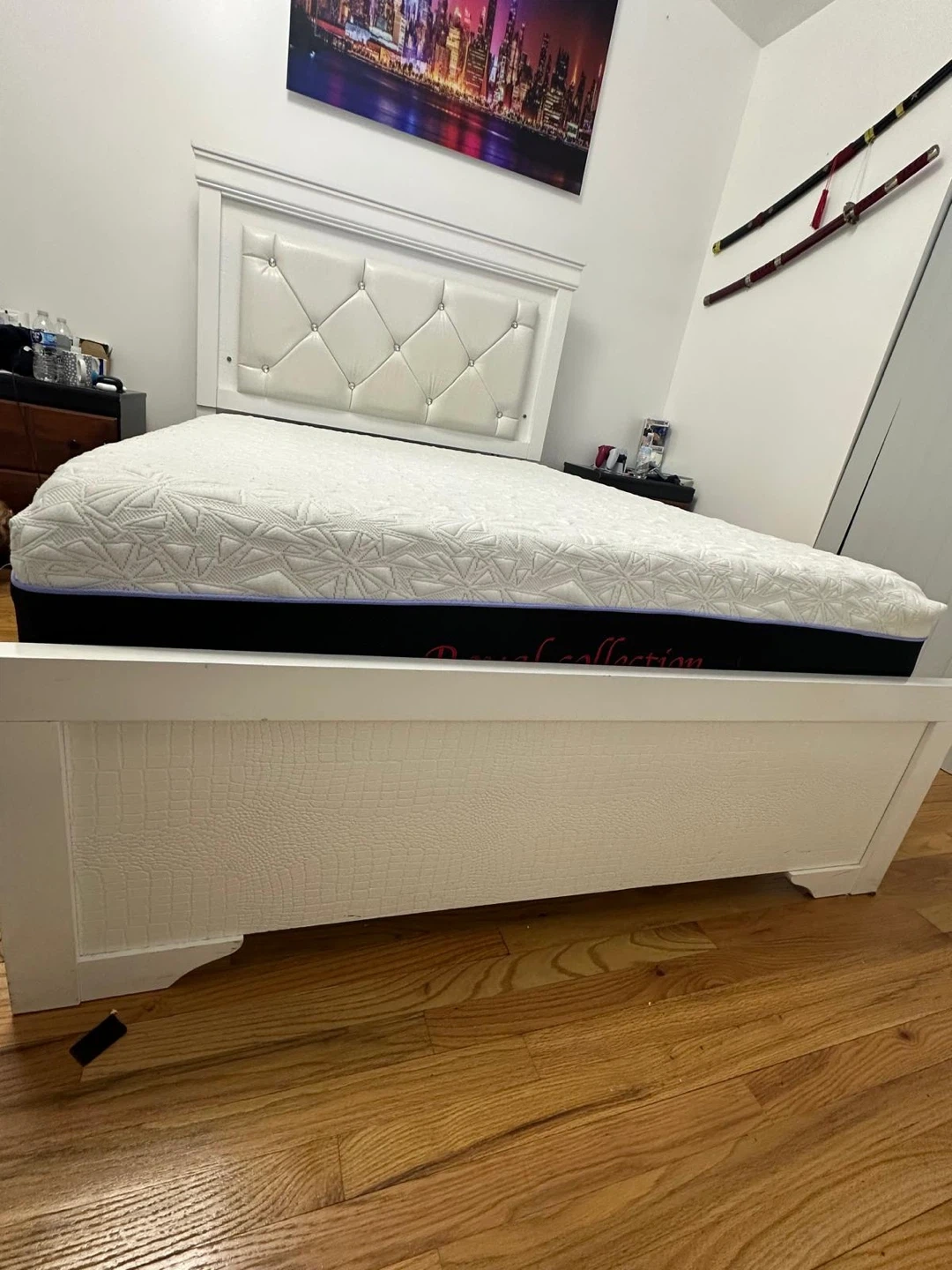 Queen size bed frame with a white finish and a diamond-tufted headboard. The side panels have a textured crocodile-embossed design. Includes the mattress. This bed frame provides a stylish centerpiece for any bedroom!