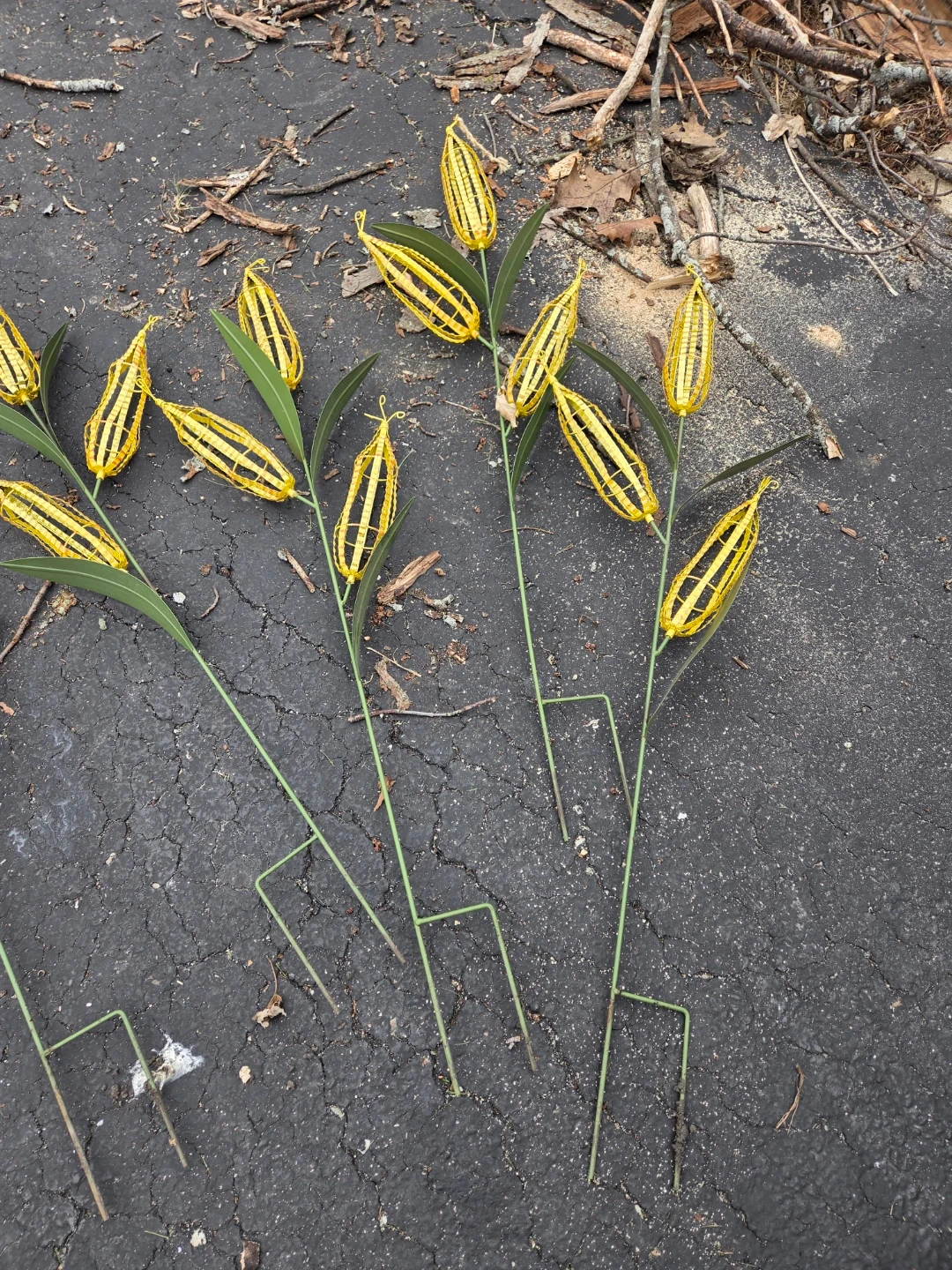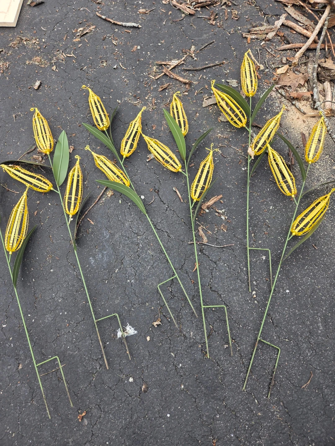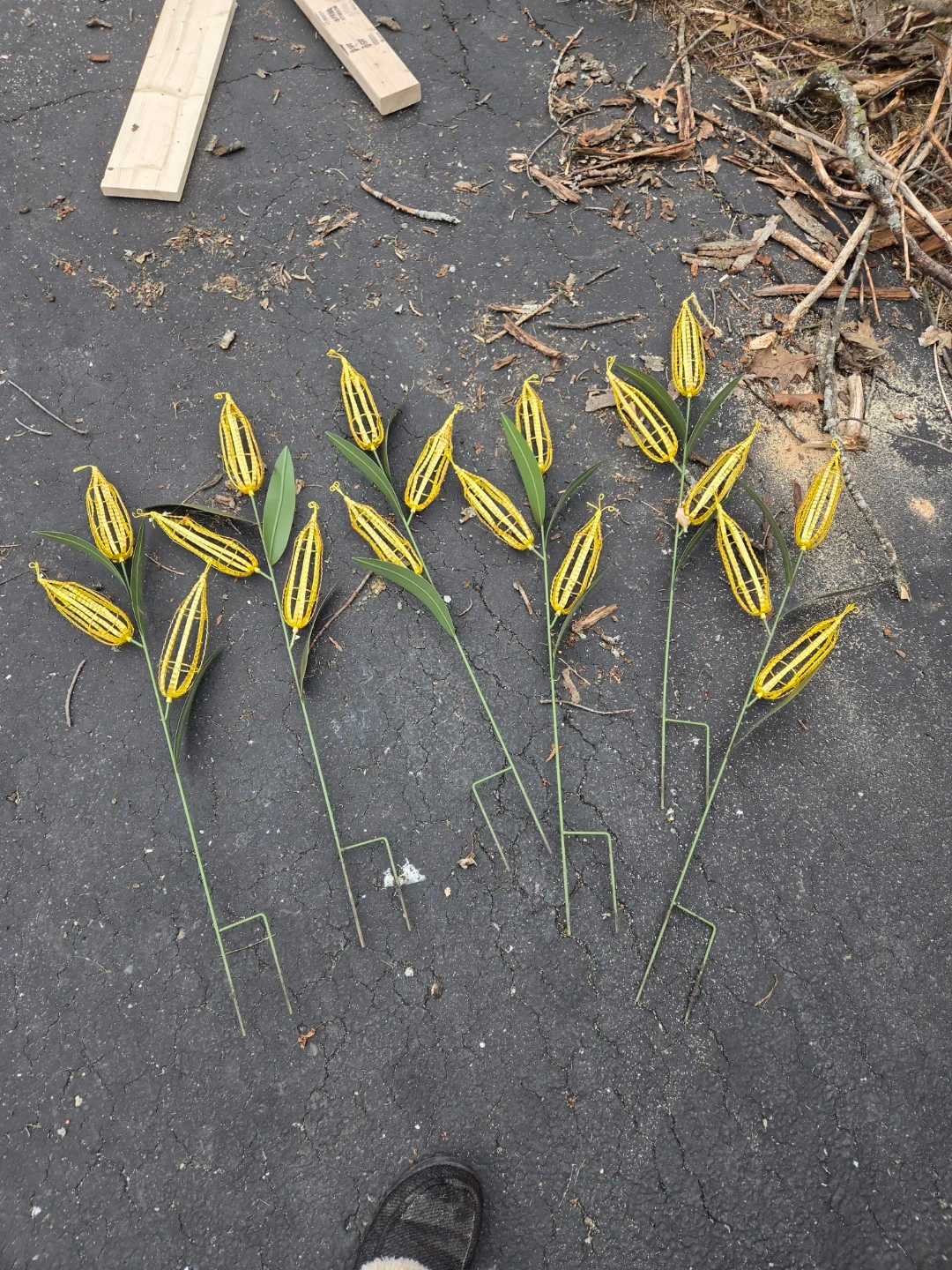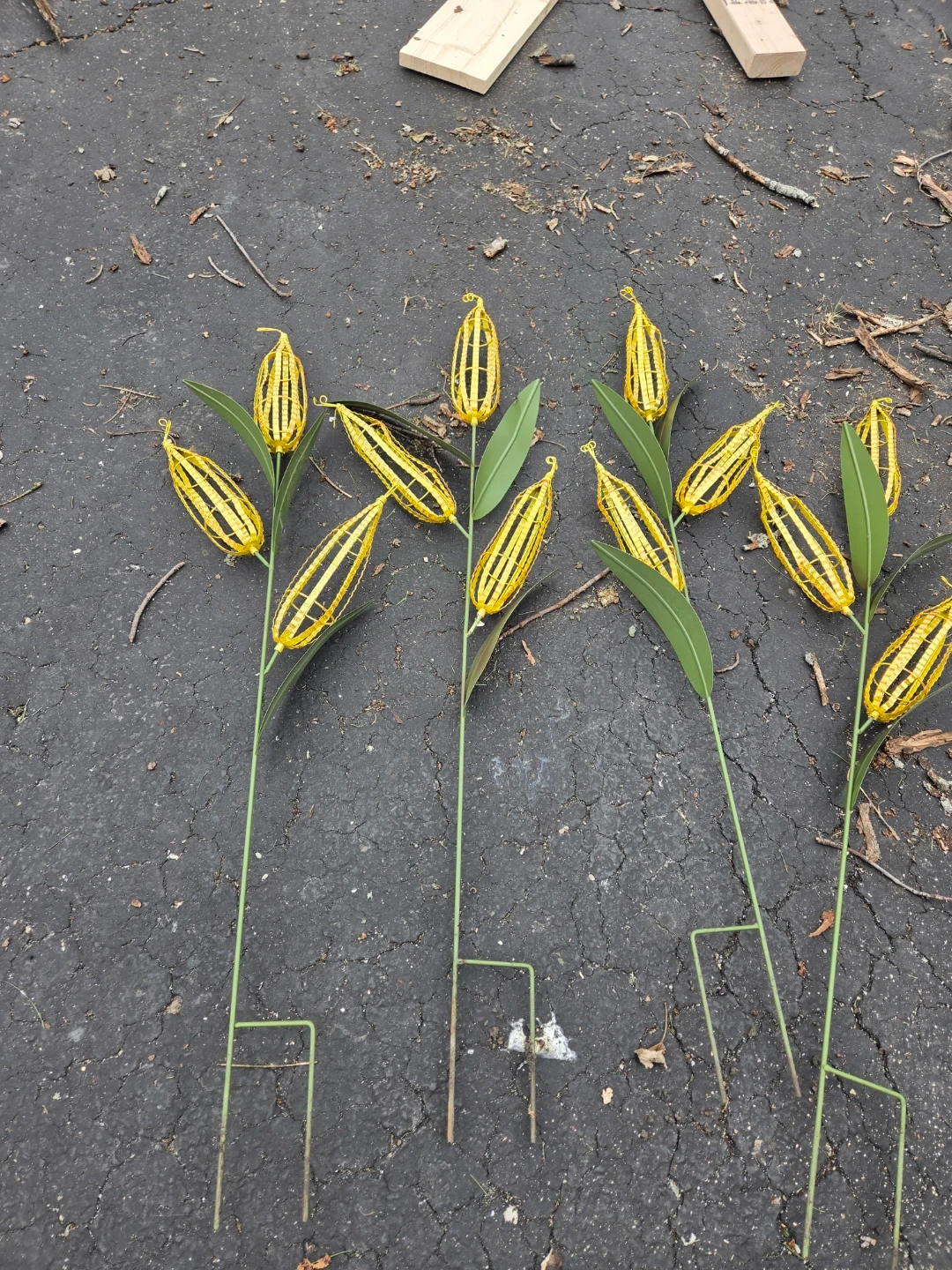 This set includes 6 metal corn stalk decorations. Each stalk has yellow wire corn cobs and green metal leaves. They each have a stake for easy placement in your yard or garden. Great for fall decor!