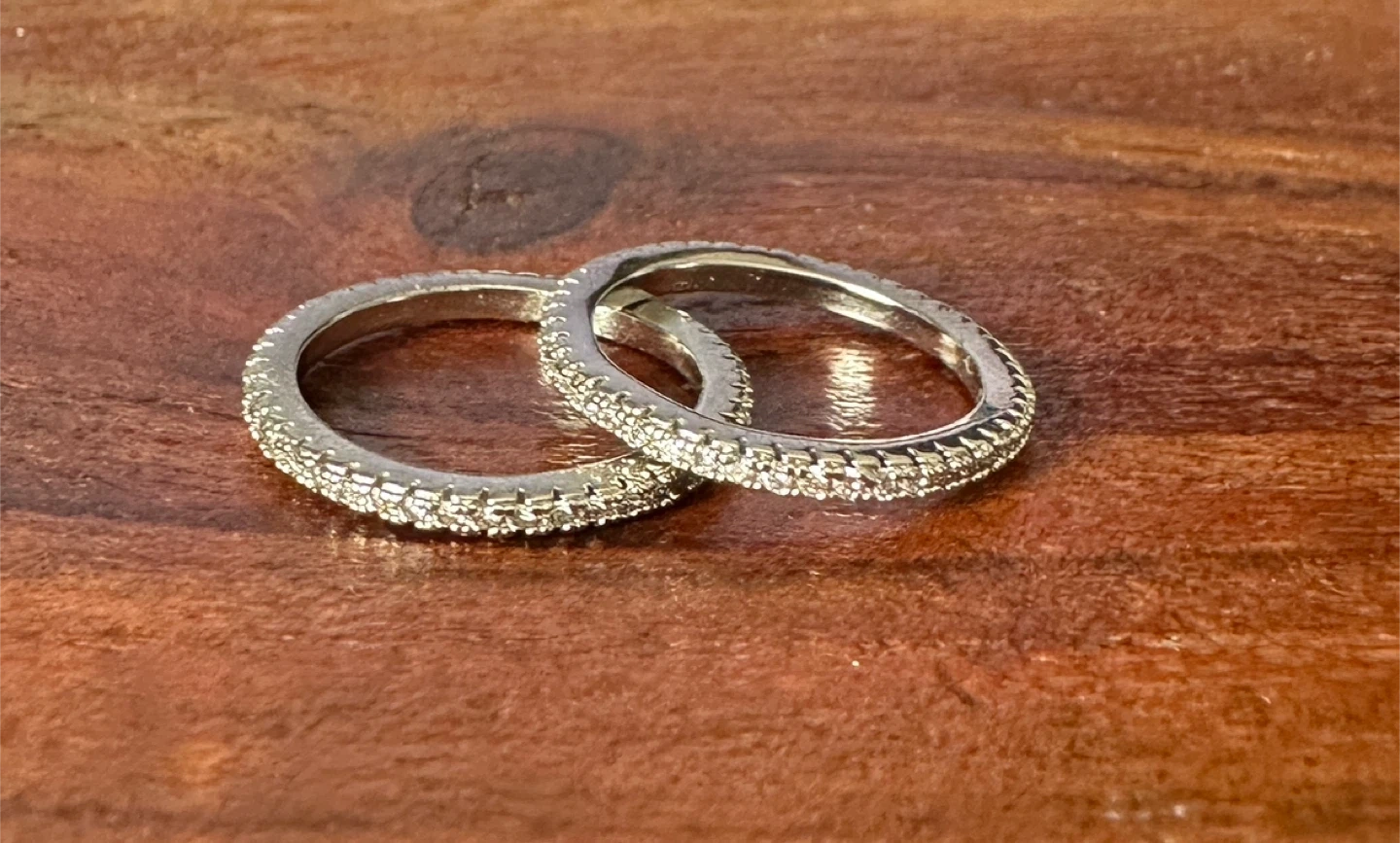 Two dainty eternity bands sparkle with cubic zirconia. These rings are meant to be stacked or worn individually for a touch of glimmer.