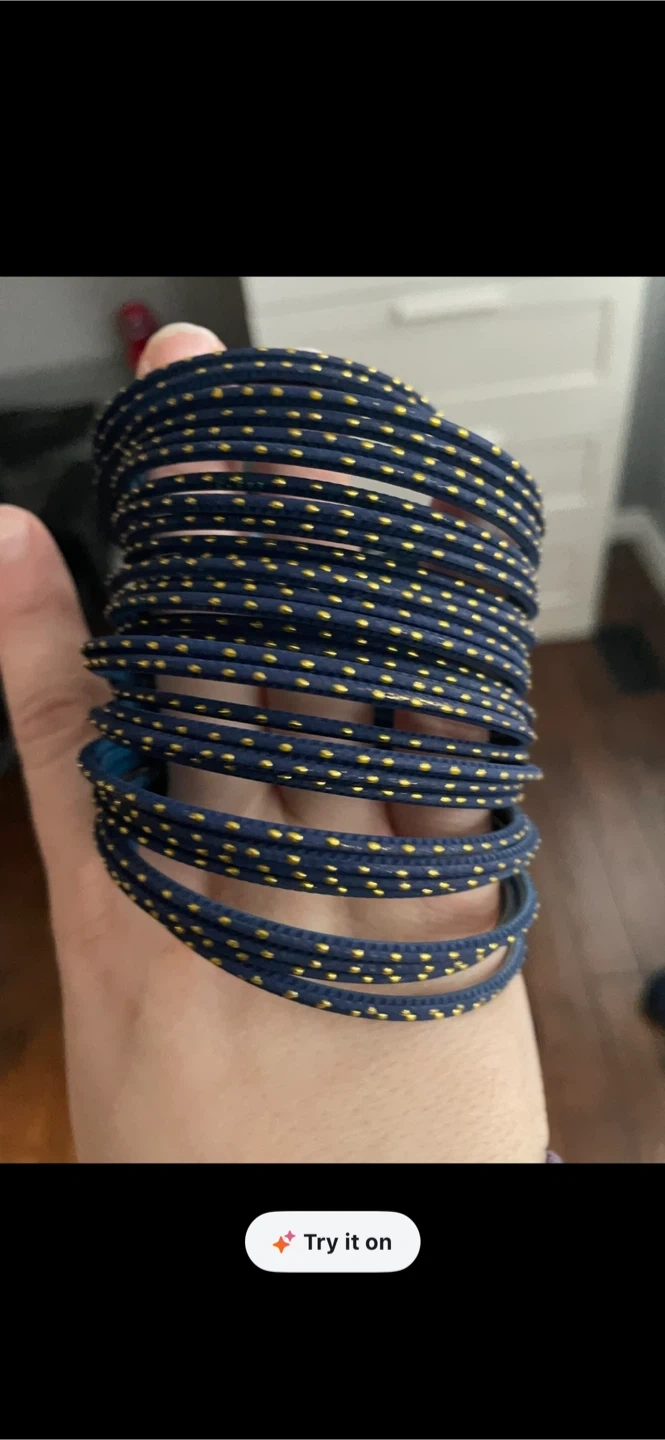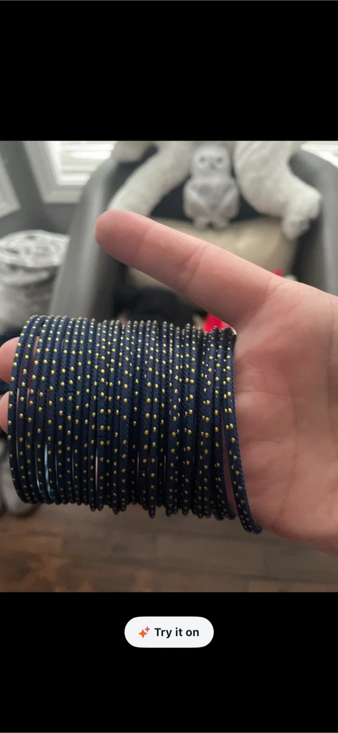 This is a set of thin bangles in a deep blue colour with small gold dots. They're lightweight and make a nice jingle when worn. Suitable for everyday wear or special occasions.