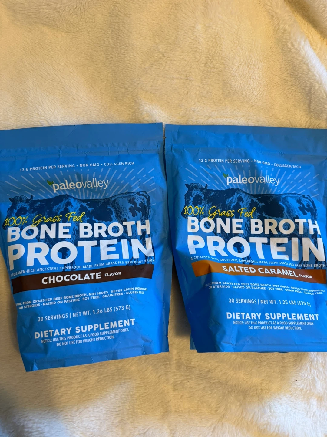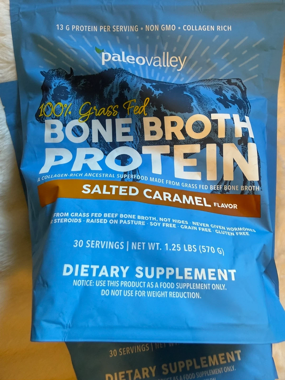 This is Paleovalley 100% Grass Fed Bone Broth Protein in Salted Caramel flavor. It's a dietary supplement providing 13g of protein per serving. Each bag contains 30 servings and weighs 1.25 lbs (570g). This product is non-GMO and collagen-rich.