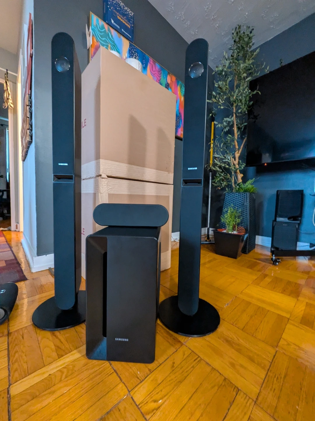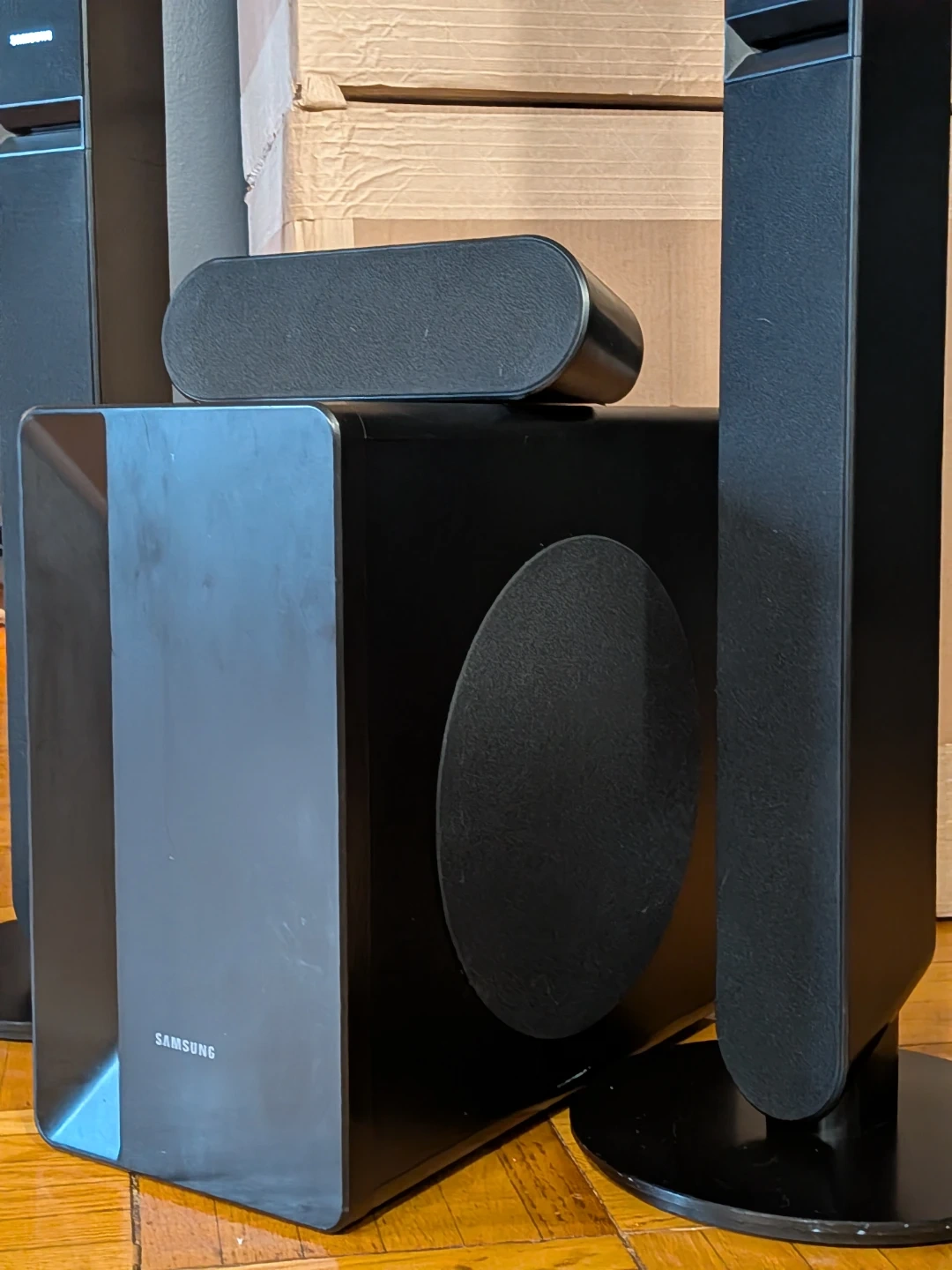 Selling a Samsung home theatre speaker system in black. It's in great condition and ready to enhance your audio experience. Perfect for movies, music, and gaming!